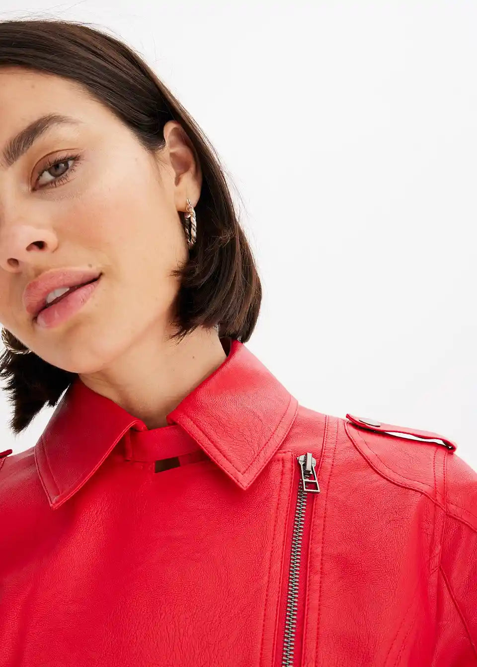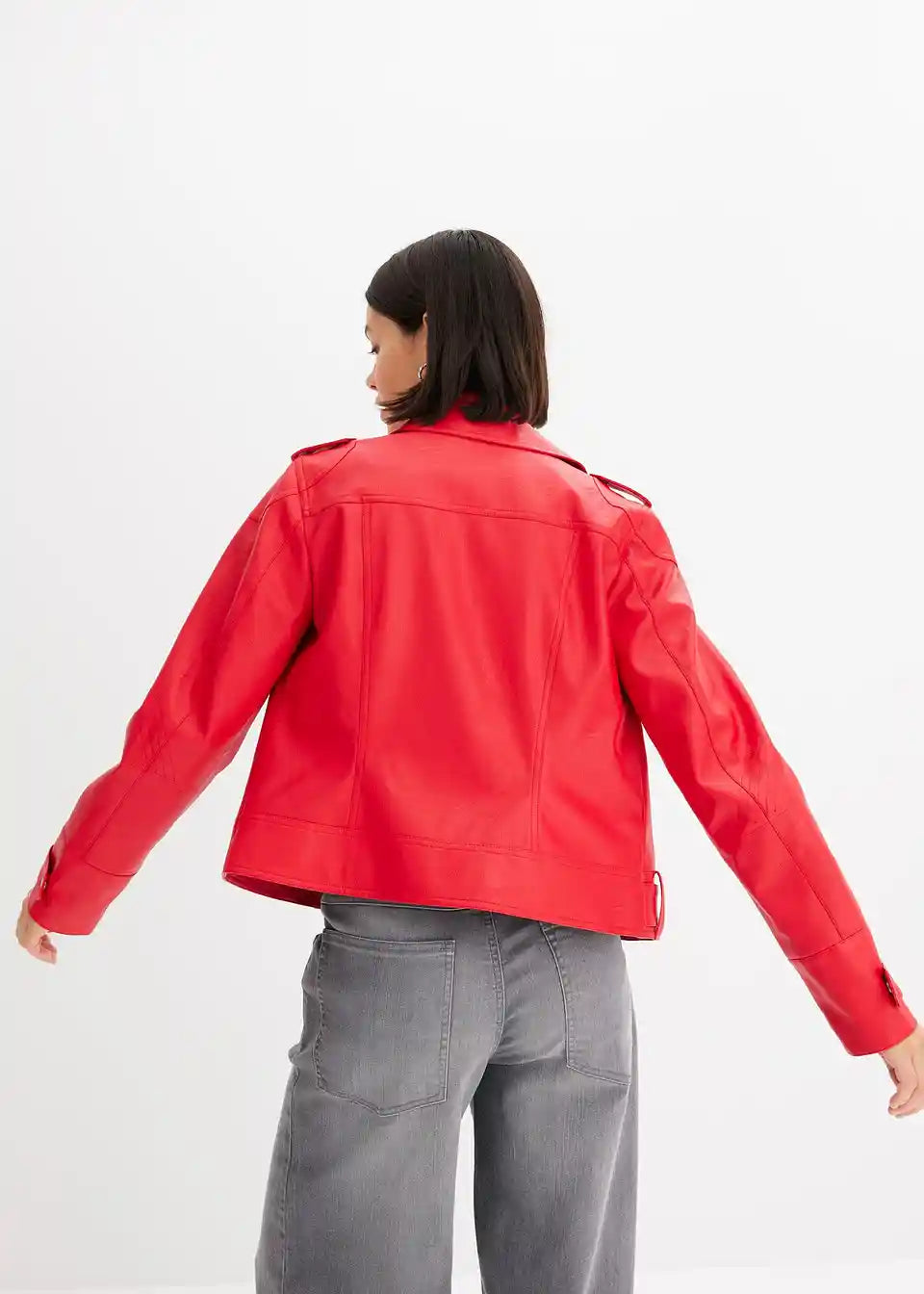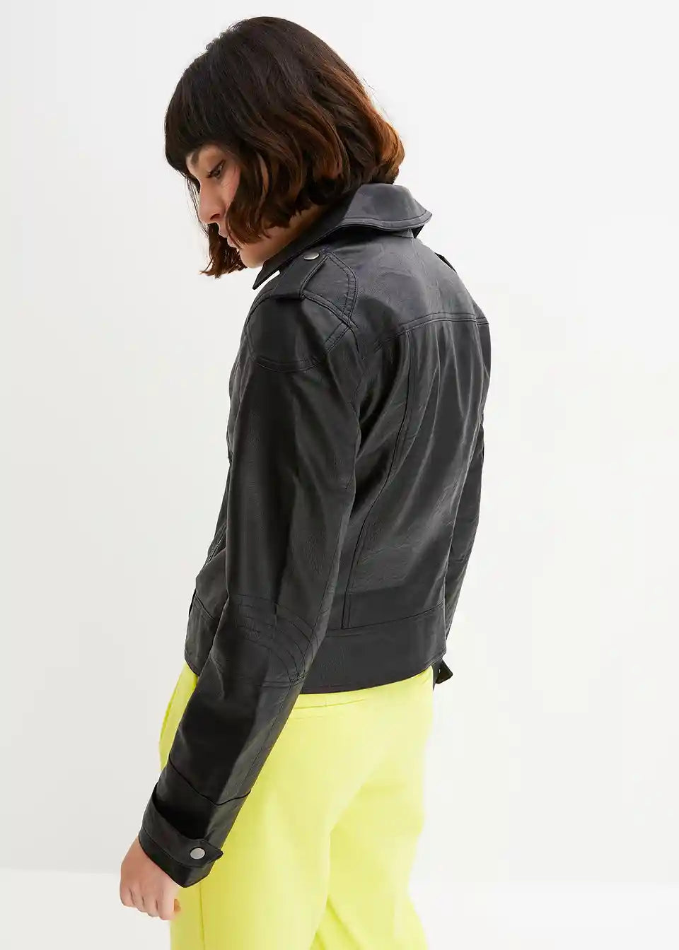 Biker-jakna svojim stylish dizajnom ostavlja upečatljiv dojam i daje odjeći rockerski izgled. Trendy detalji uključuju dodatne trake, upečatljive zakovice i drukere. Uz to se dobro uklapaju kosi patentni zatvarač i prednji džepovi. Na krajevima rukava, detalji s patentnim zatvaračem dodaju cool naglaske. Unutarnja podstava izrađena je od poliestera s leopard uzorkom, dok je gornji sloj od umjetne kože. Kombinirana s haljinom s uzorkom i gležnjačama, žena s ovom Biker-jaknom izgleda moderno i dotjerano.
