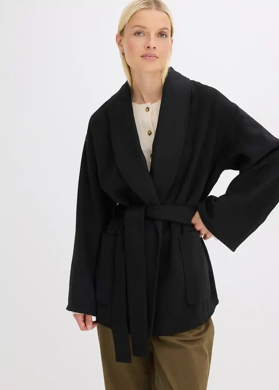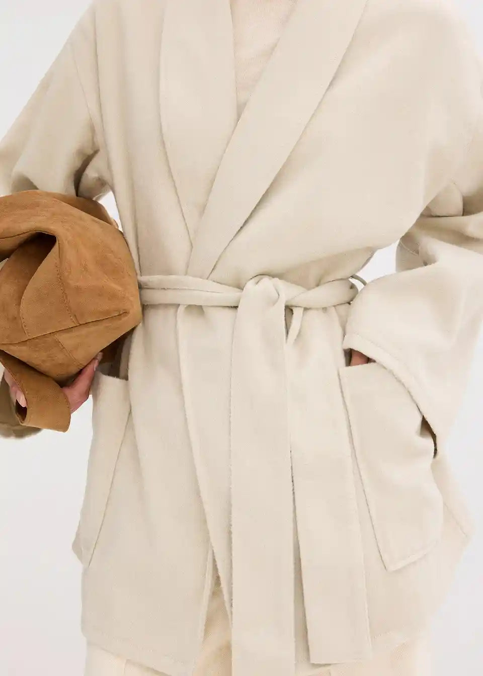 Ležerna vunena jakna s pojasom za vezanje i našivenim džepovima