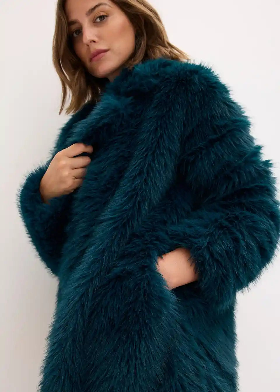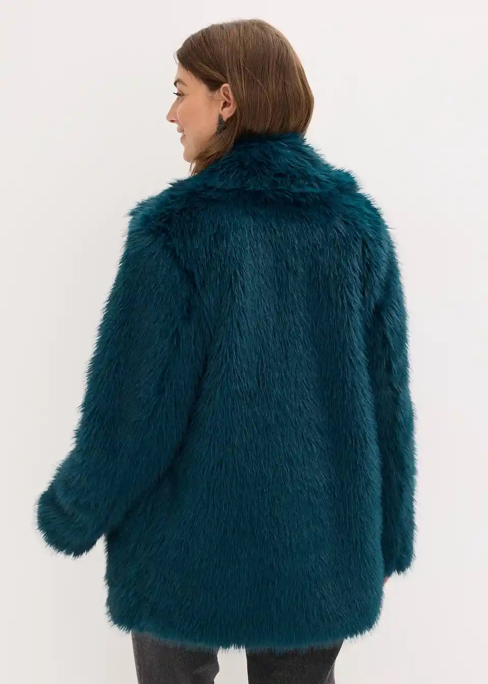 Moderna jakna od umjetnog krzna s rever ovratnikom i kopčanjem na pritisne gumbe sprijeda.