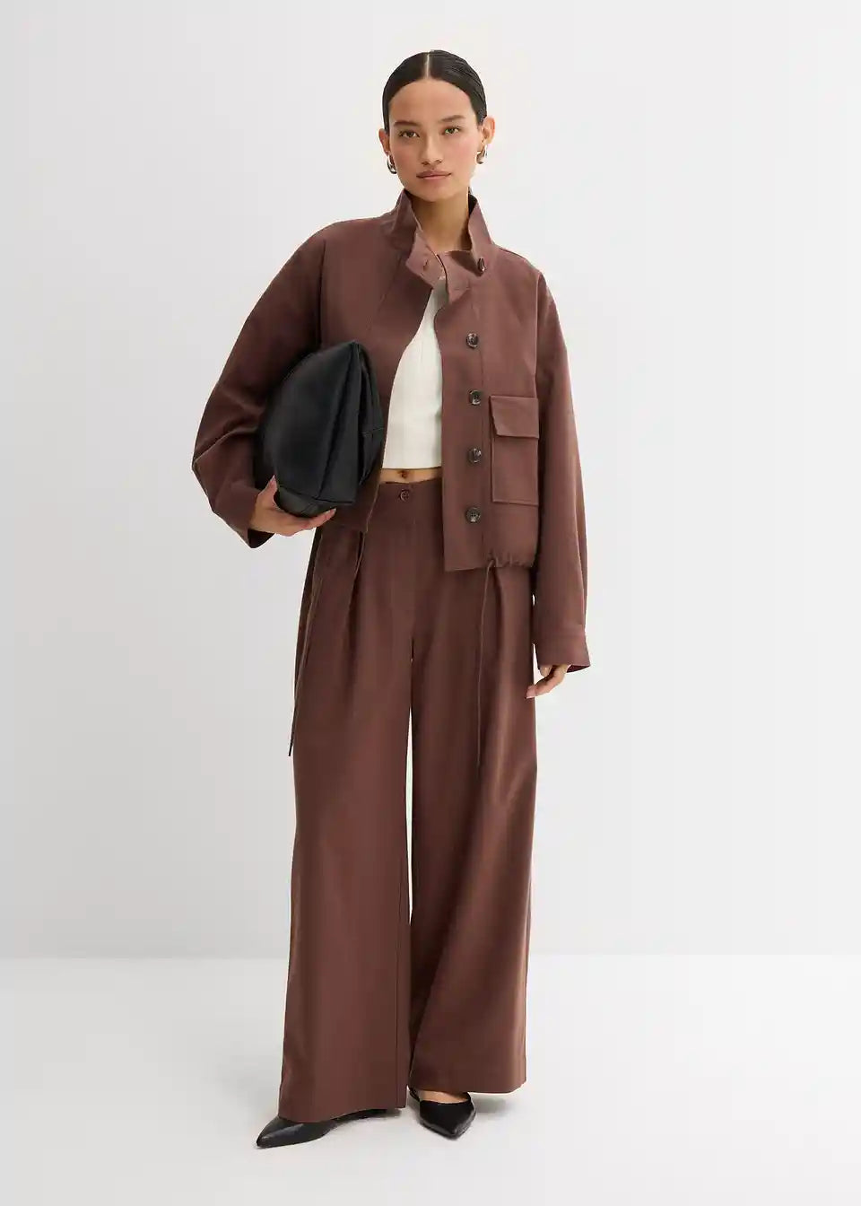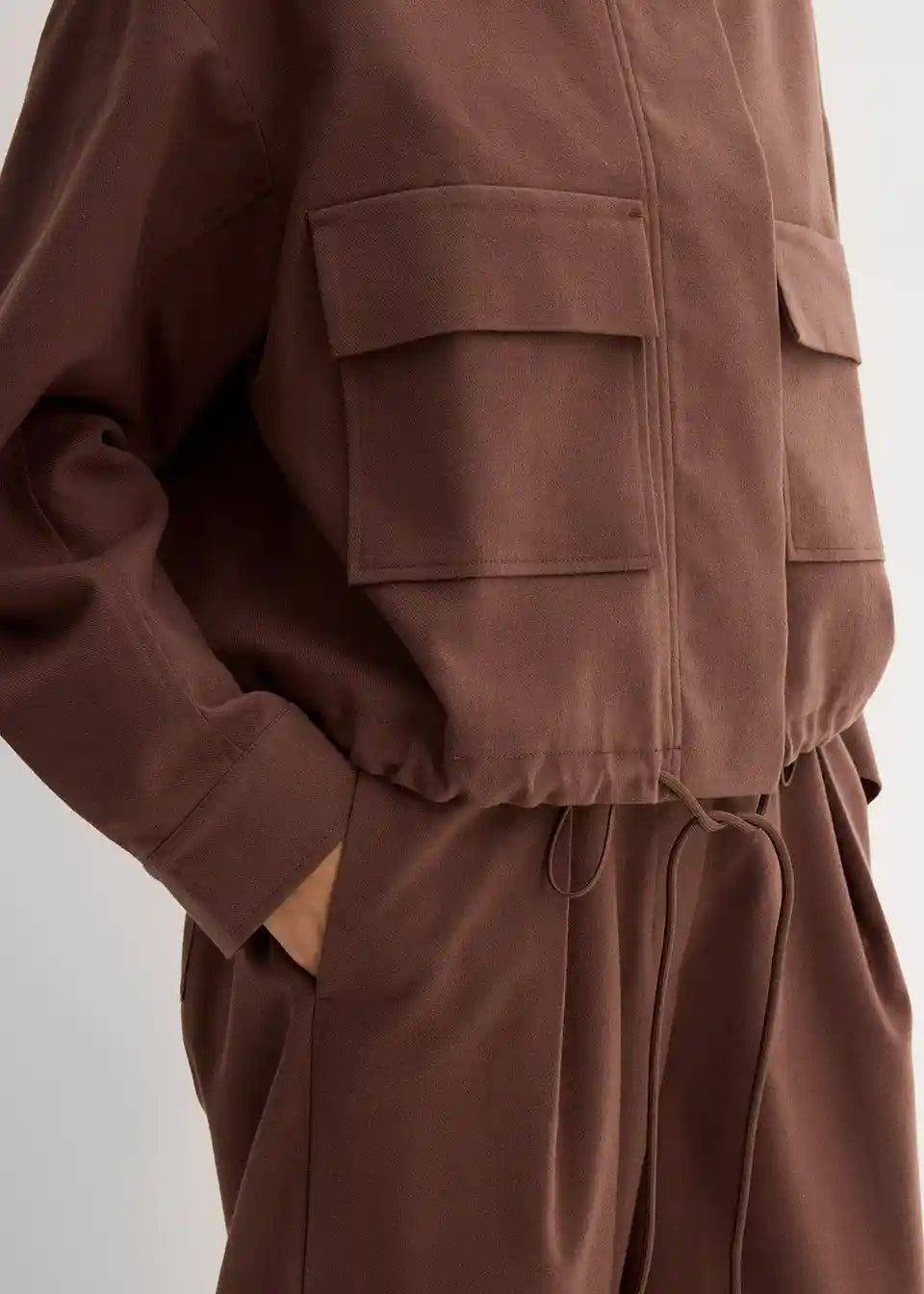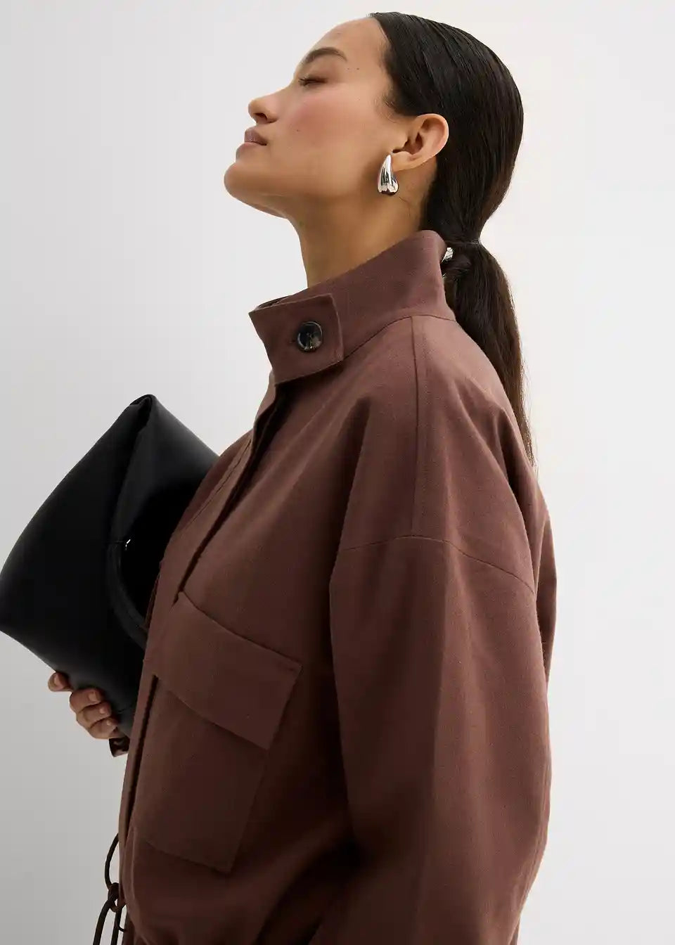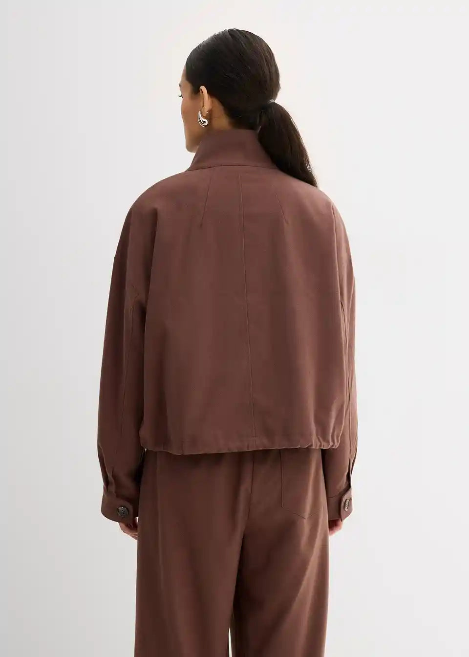 Ležerno krojena prijelazna jakna sa stojećim ovratnikom, jednostavnim našivenim džepovima i podesivim porubom