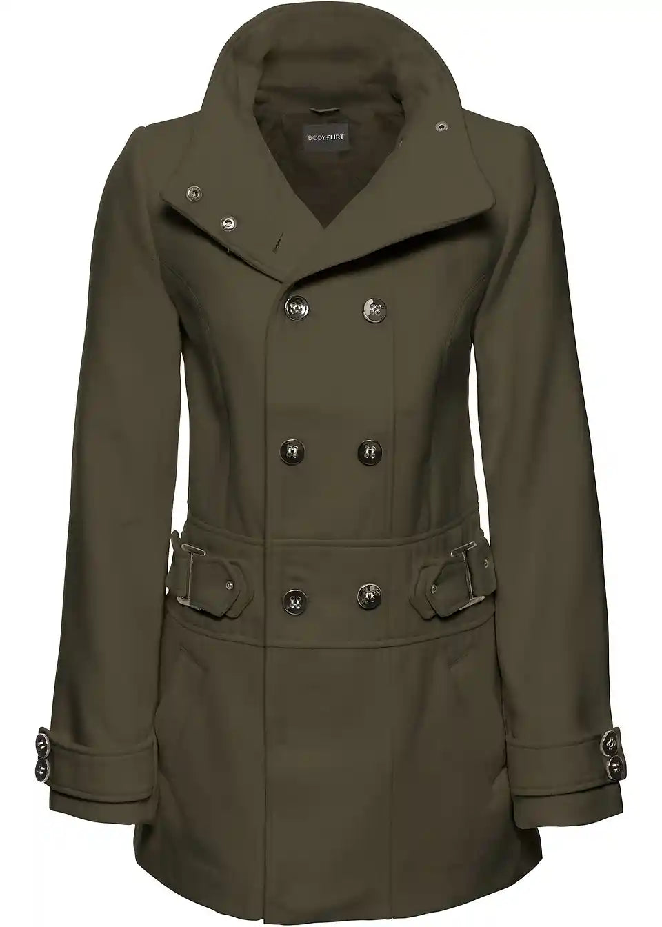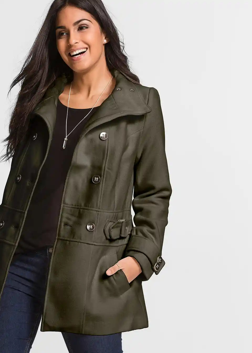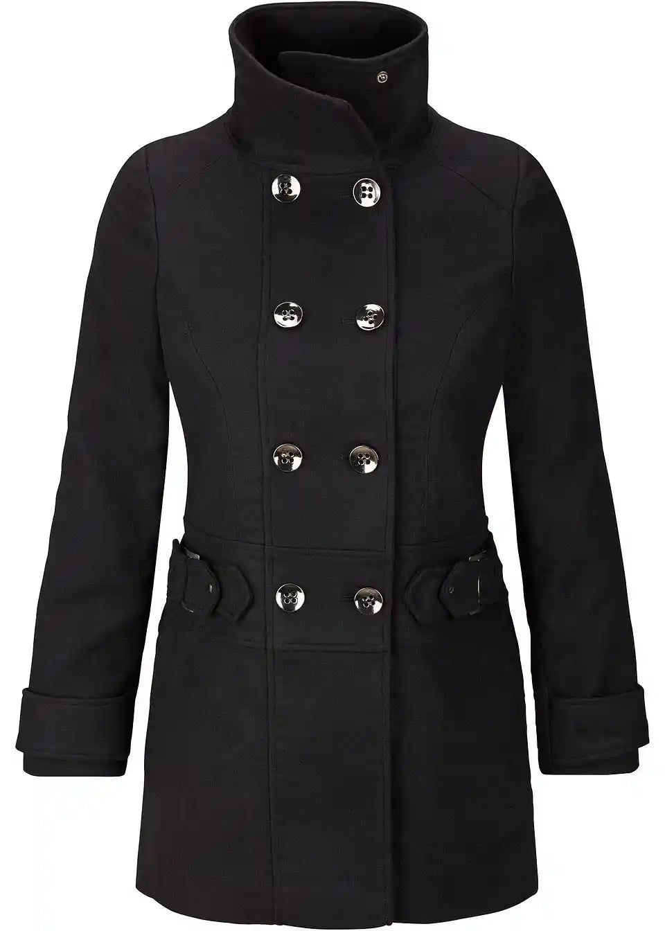 Moderan kratki kaput s visokim ovratnikom i dvorednim gumbima u veličini Petite.