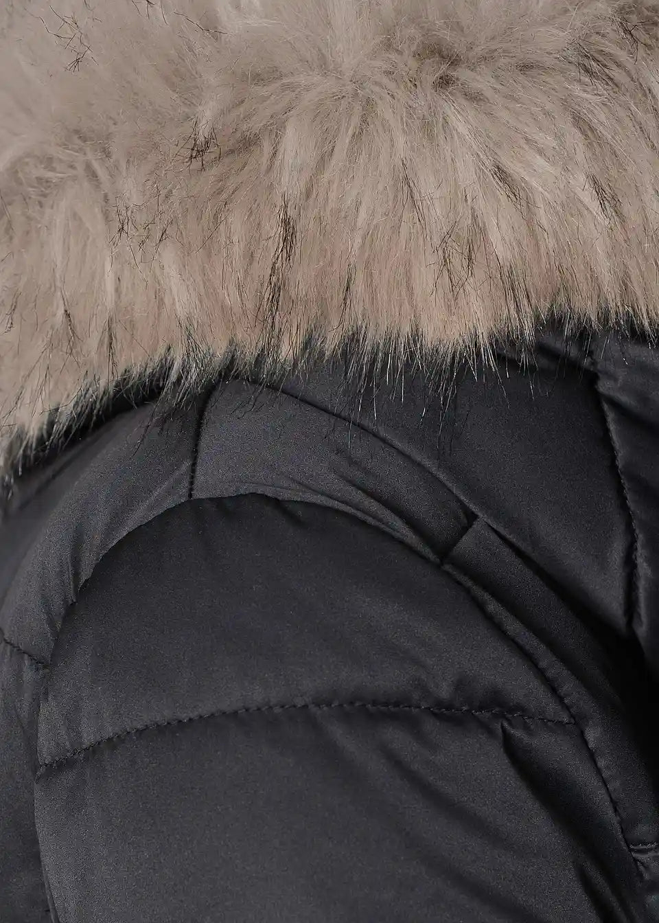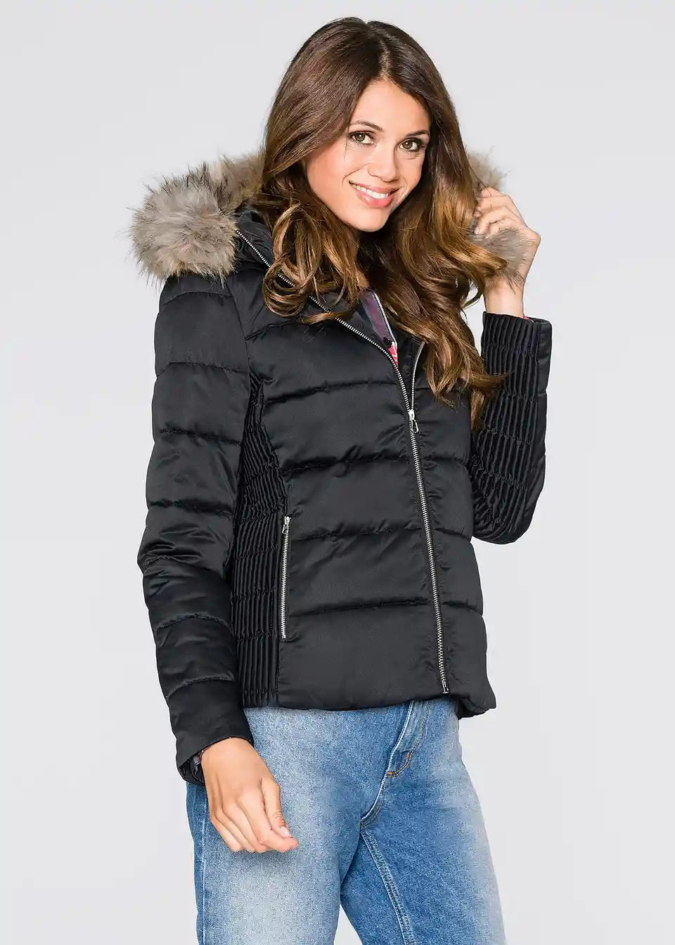 Ženska prošivena jakna s kapuljačom od umjetnog krzna i naborima
