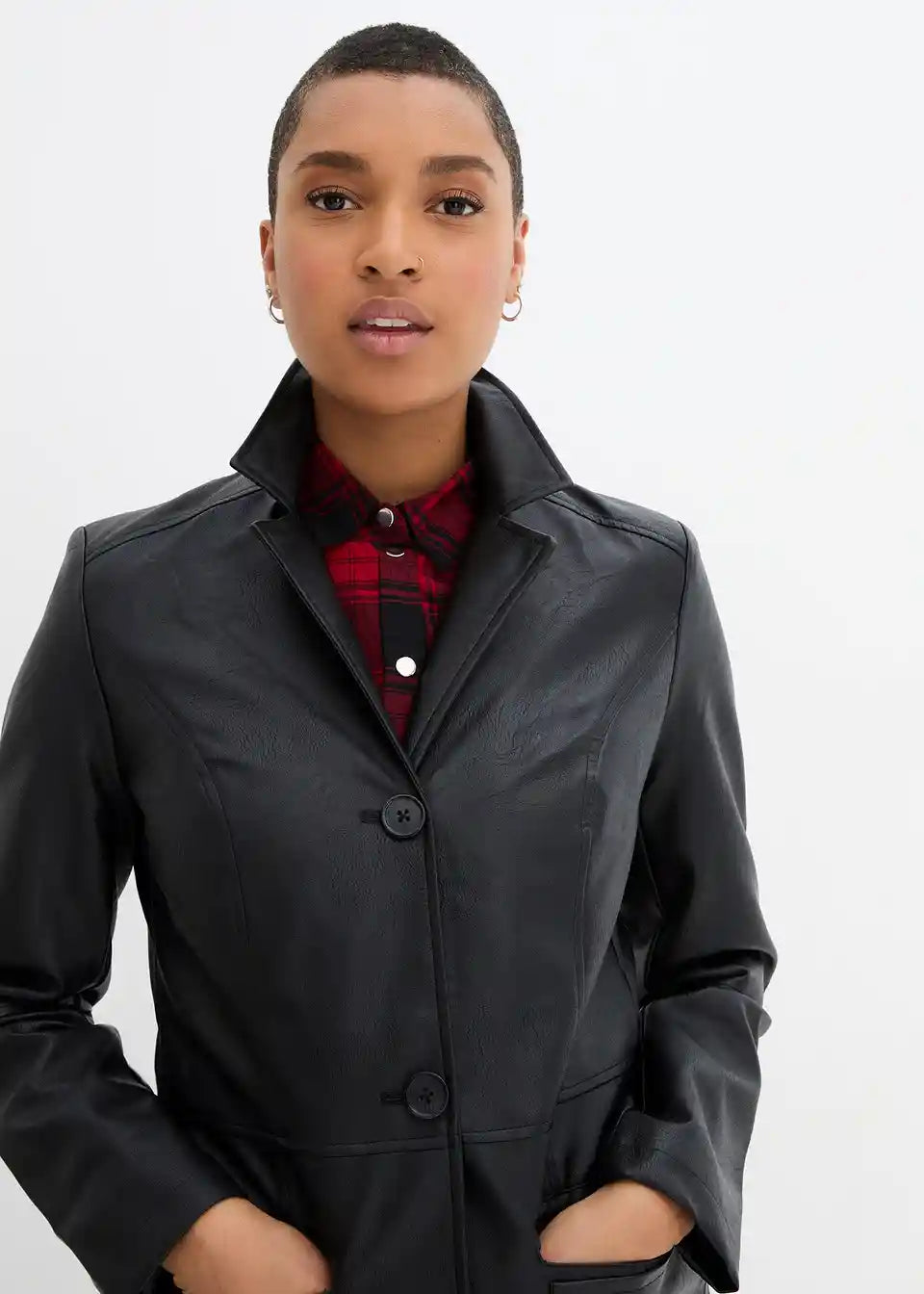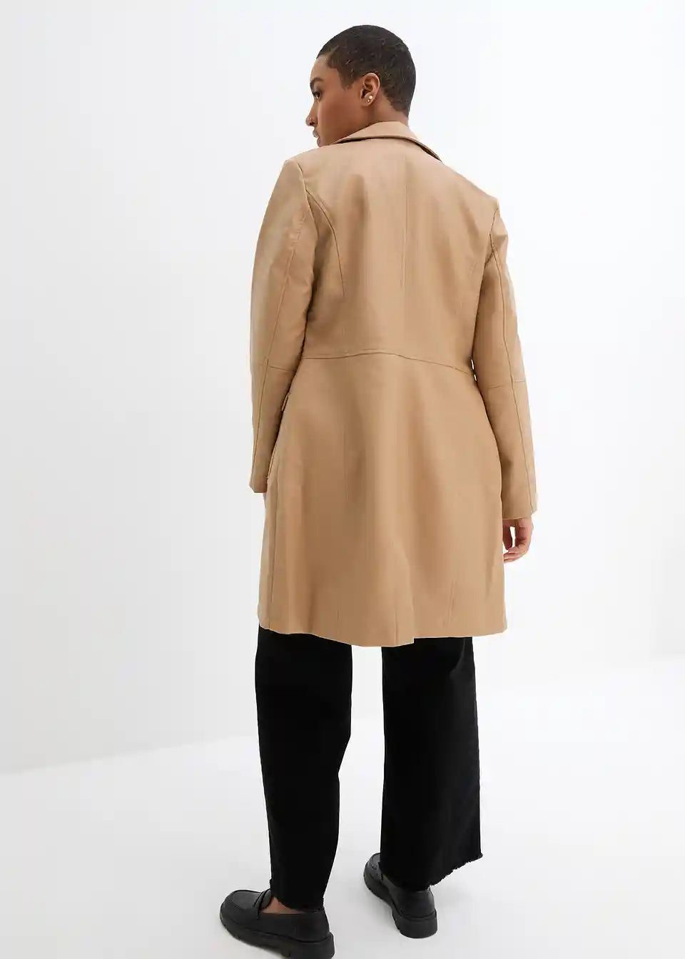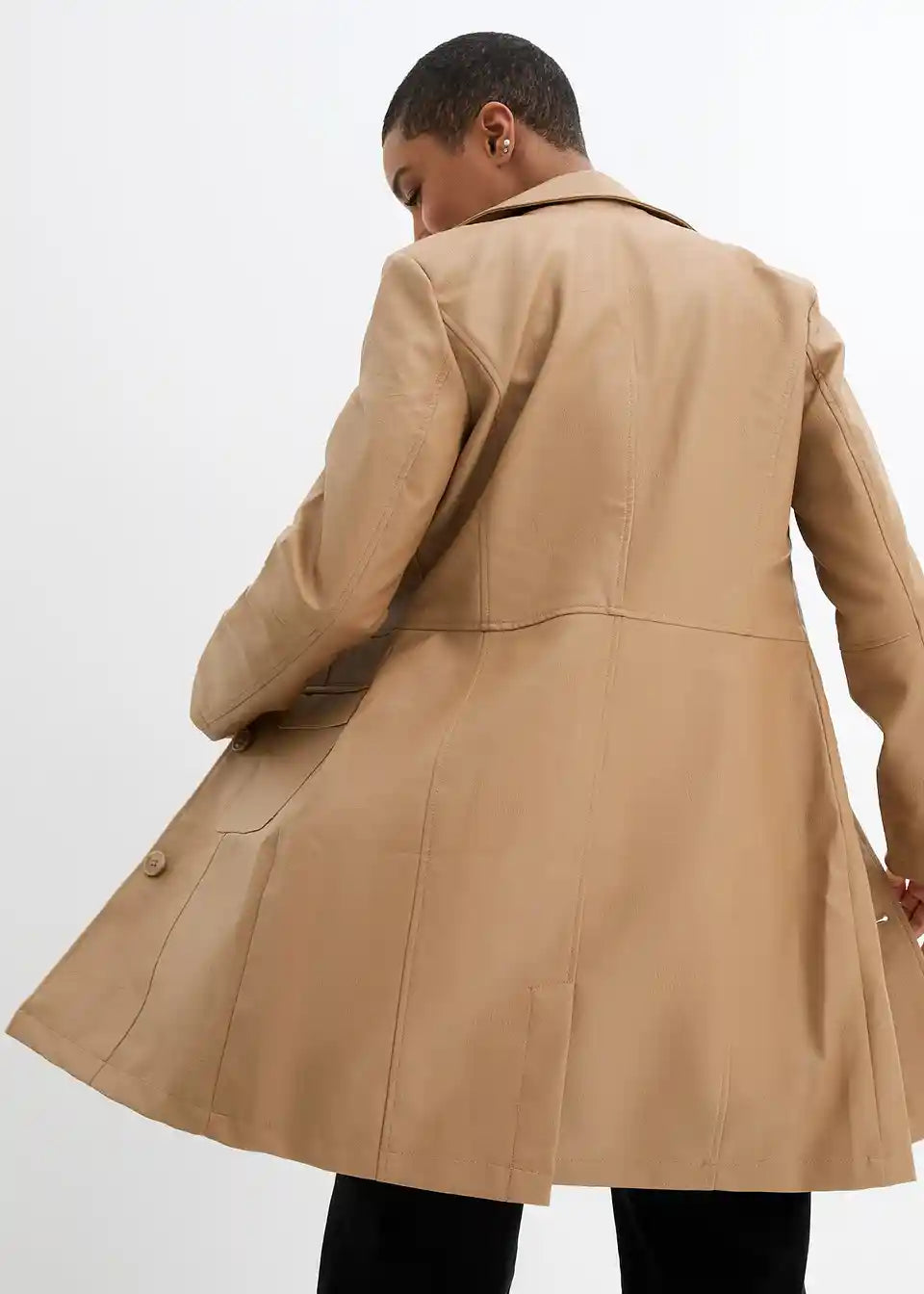 Pravi privlačitelj pogleda je ovaj ležerni ogrtač od imitacije kože marke bpc. Kaput do koljena krojen je tako da prati liniju tijela i oduševljava svoje nositeljice našivenim džepovima s preklopom i dugim reverovskim ovratnikom. Ovaj i za kožu tipični šavovi dijeljenja izdužuju i laskaju figuri. Strukirani ogrtač se naprijed zatvara s četiri velika gumba.