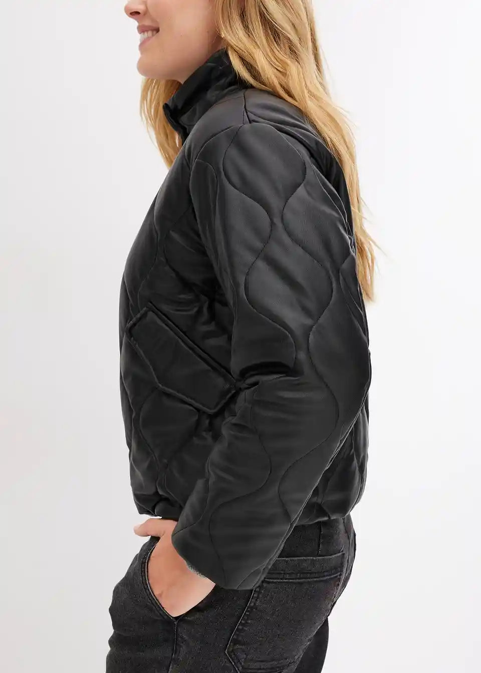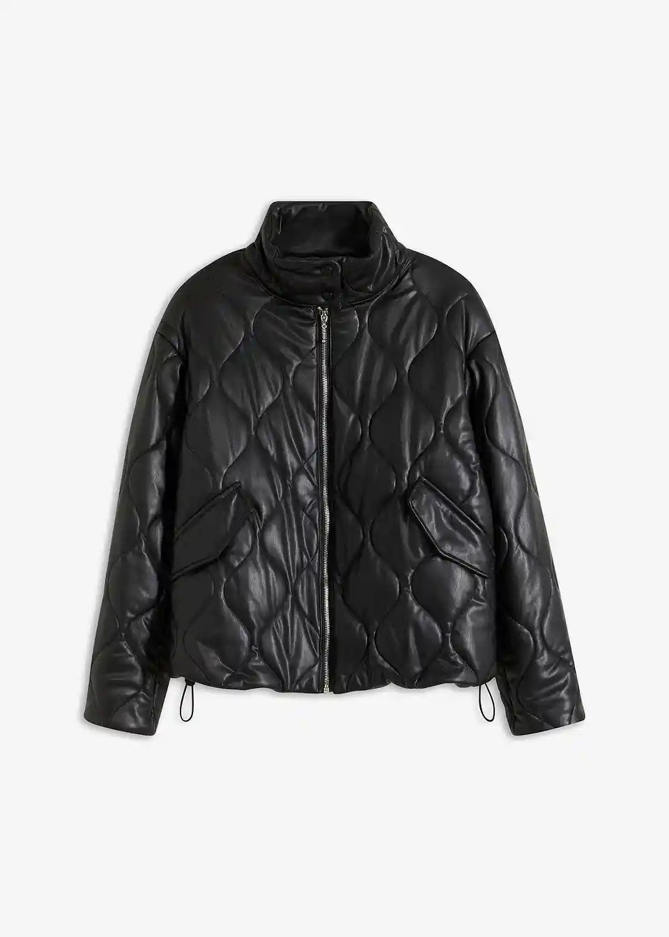 Moderna prošivena jakna s elastičnim pojasom i visokim ovratnikom u kožnom izgledu