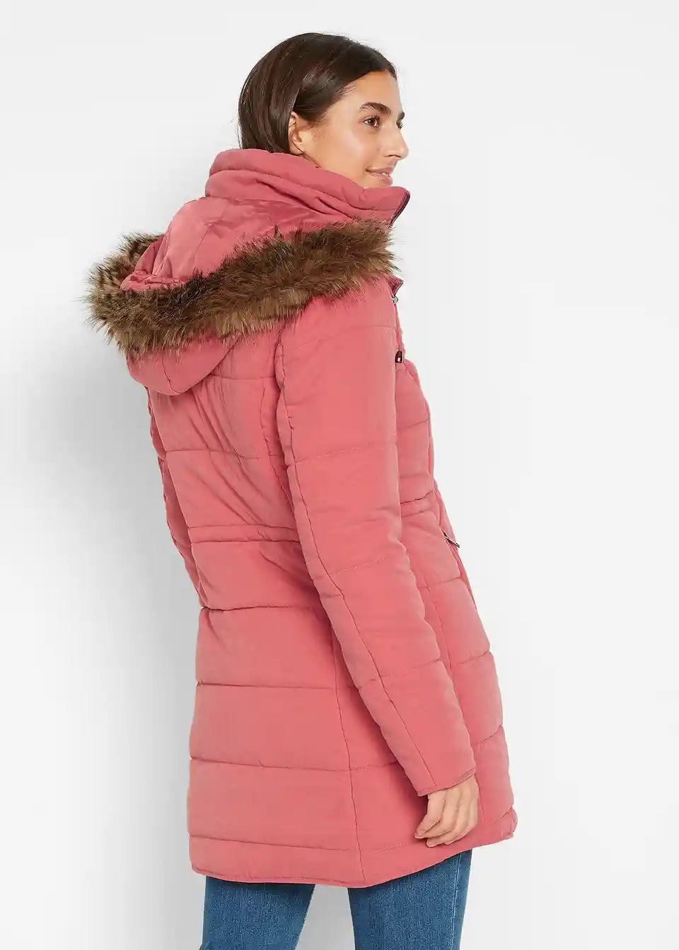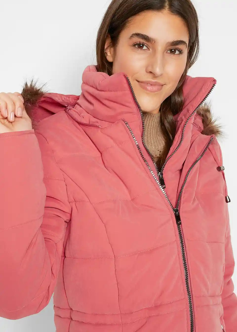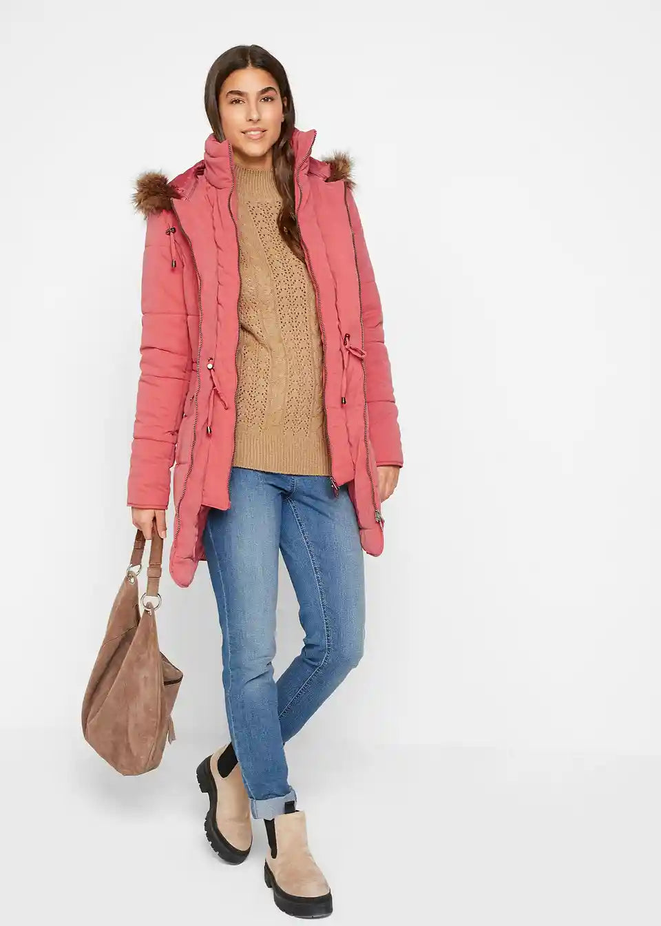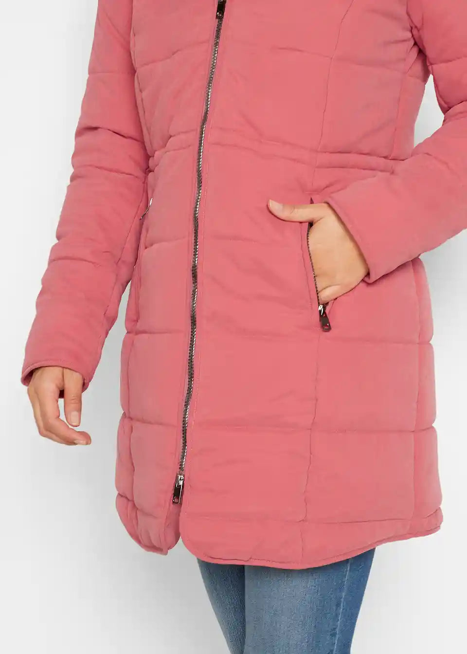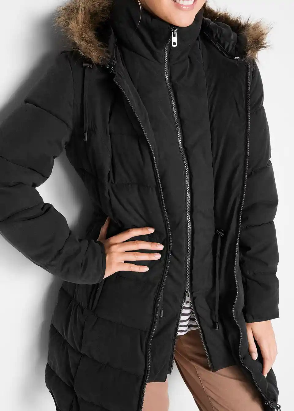Ovaj prošiveni kratki kaput od bpc-a svestrani je pratilac. Uski kroj pruža toplinu. Uzdužni dijelni šavovi na prednjoj strani izduljuju siluetu. Ako želite elegantan izgled jakne, možete ukloniti kapuljaču. Prošiveni kaput s dvostrukim patentnim zatvaračem štiti od vjetra i lošeg vremena. Ruke se mogu ugrijati u dva prednja džepa.
