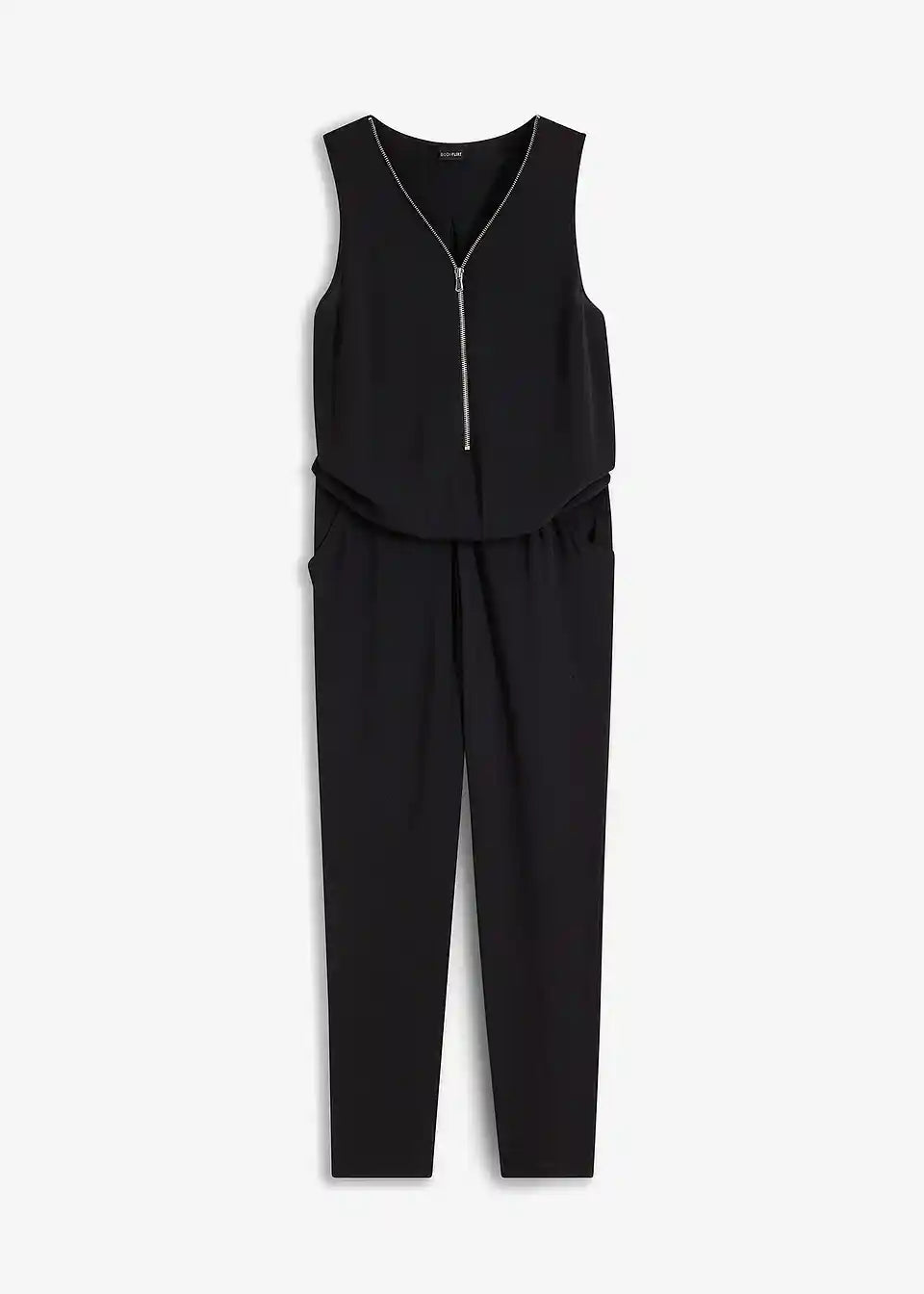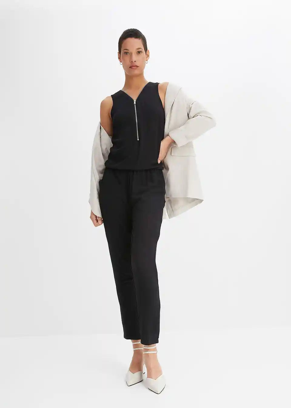 Uzbudljiva kombinacija ležernog kroja i finih detalja daje ovom kombinezonu bez rukava ženski šarm. Detalji uključuju kontrastni zatvarač na izrezu. Model BODYFLIRT pokazuje se s ležernim gornjim dijelom i suženim nogavicama. Elastični pojas u struku naglašava ženstvenu siluetu ovog kombinezona sa zatvaračem.