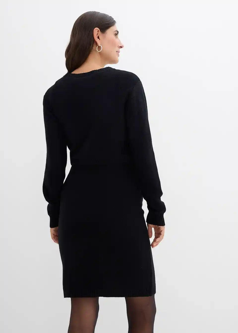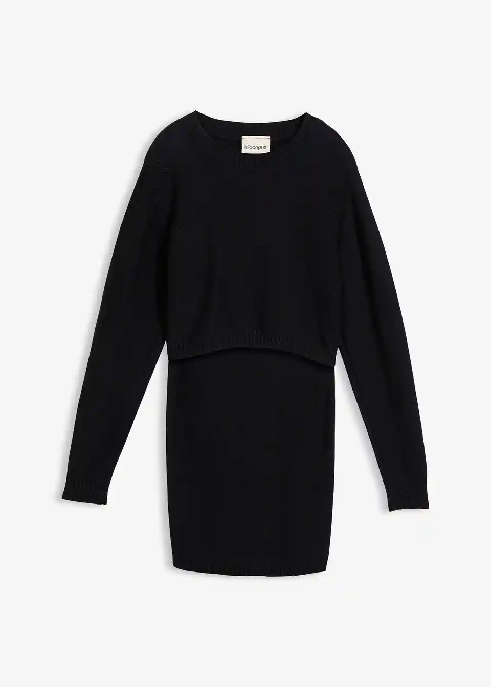 Set od pulovera i suknje od mekane pamučne pletive. Pulover je skraćene duljine s okruglim izrezom, spuštenim ramenima i rebrastim rubom na vratu, rukavima i donjem rubu. Suknja do koljena ima elastični pojas koji se optimalno prilagođava trbuhu, kao i rebrasti rub na dnu. Set je prikladan i za vrijeme dojenja.