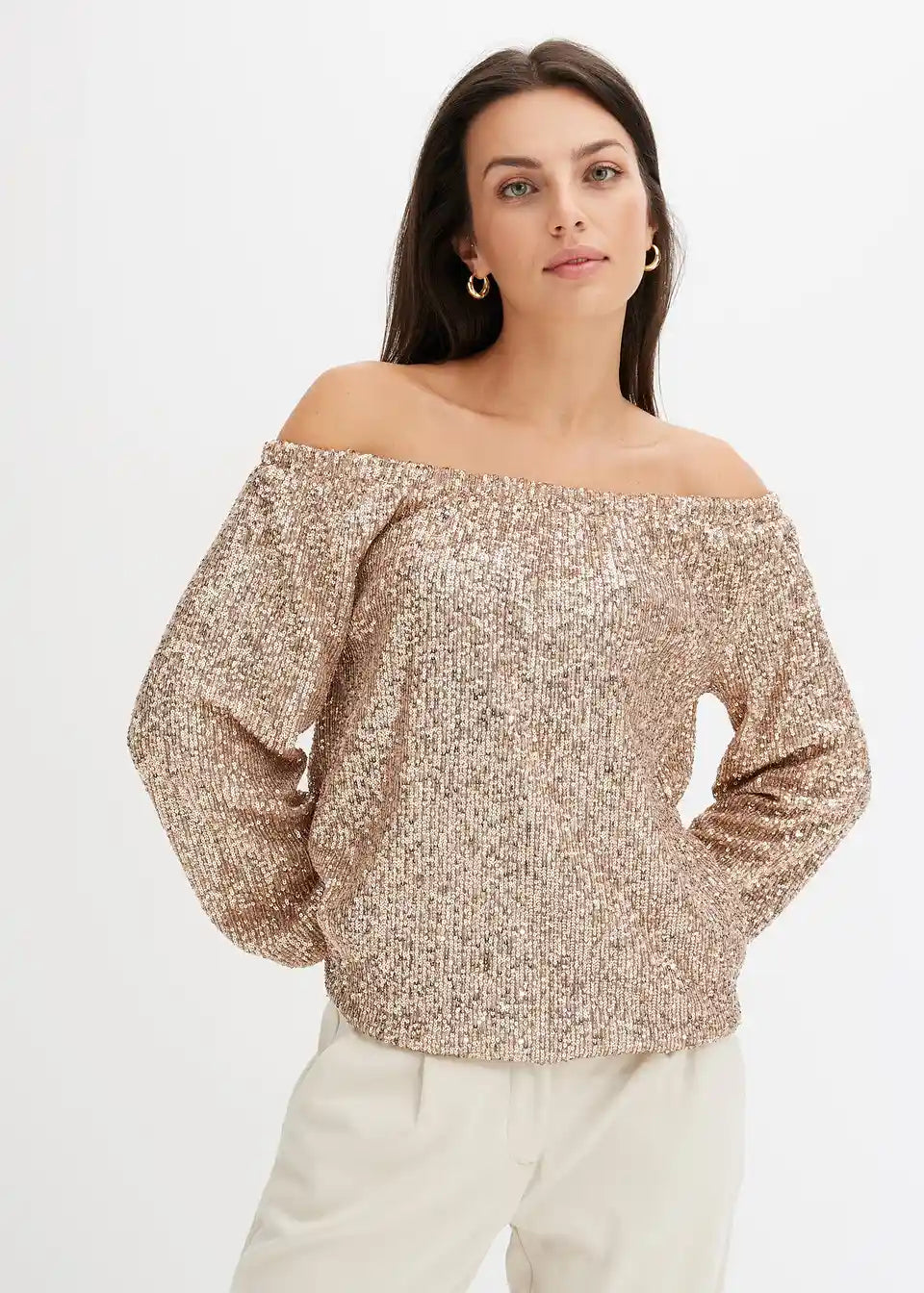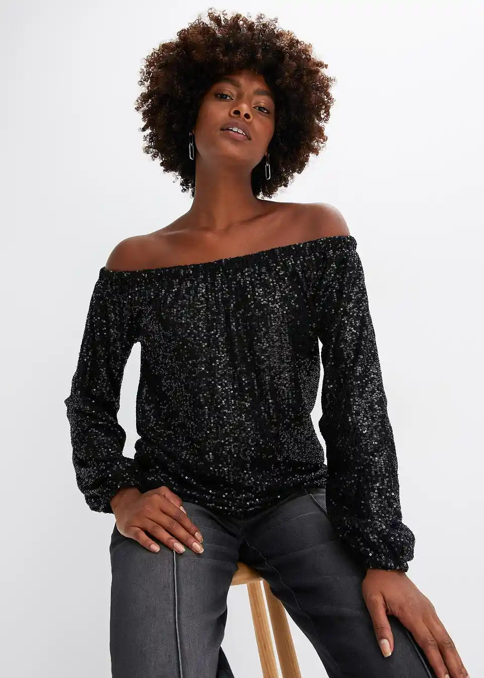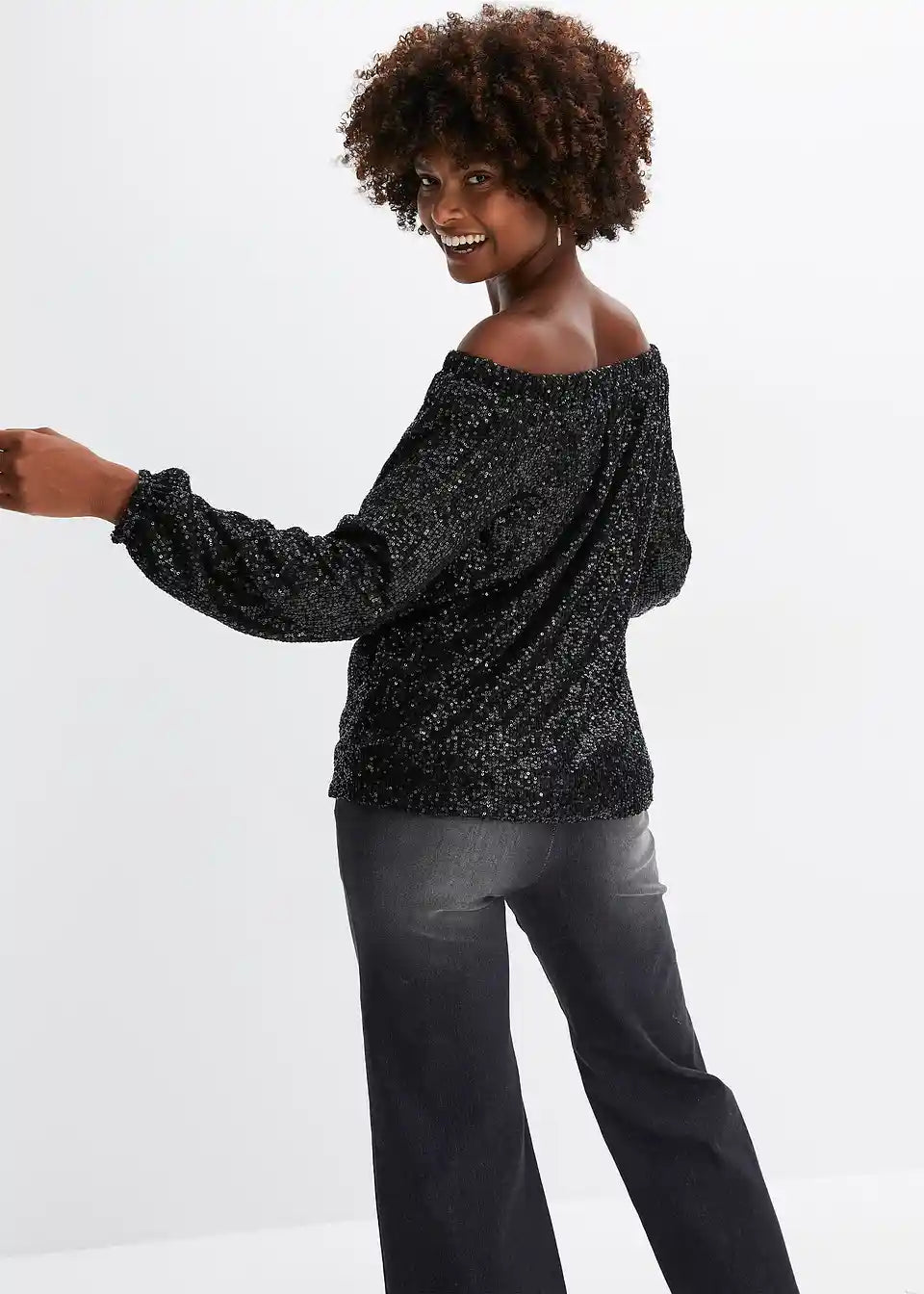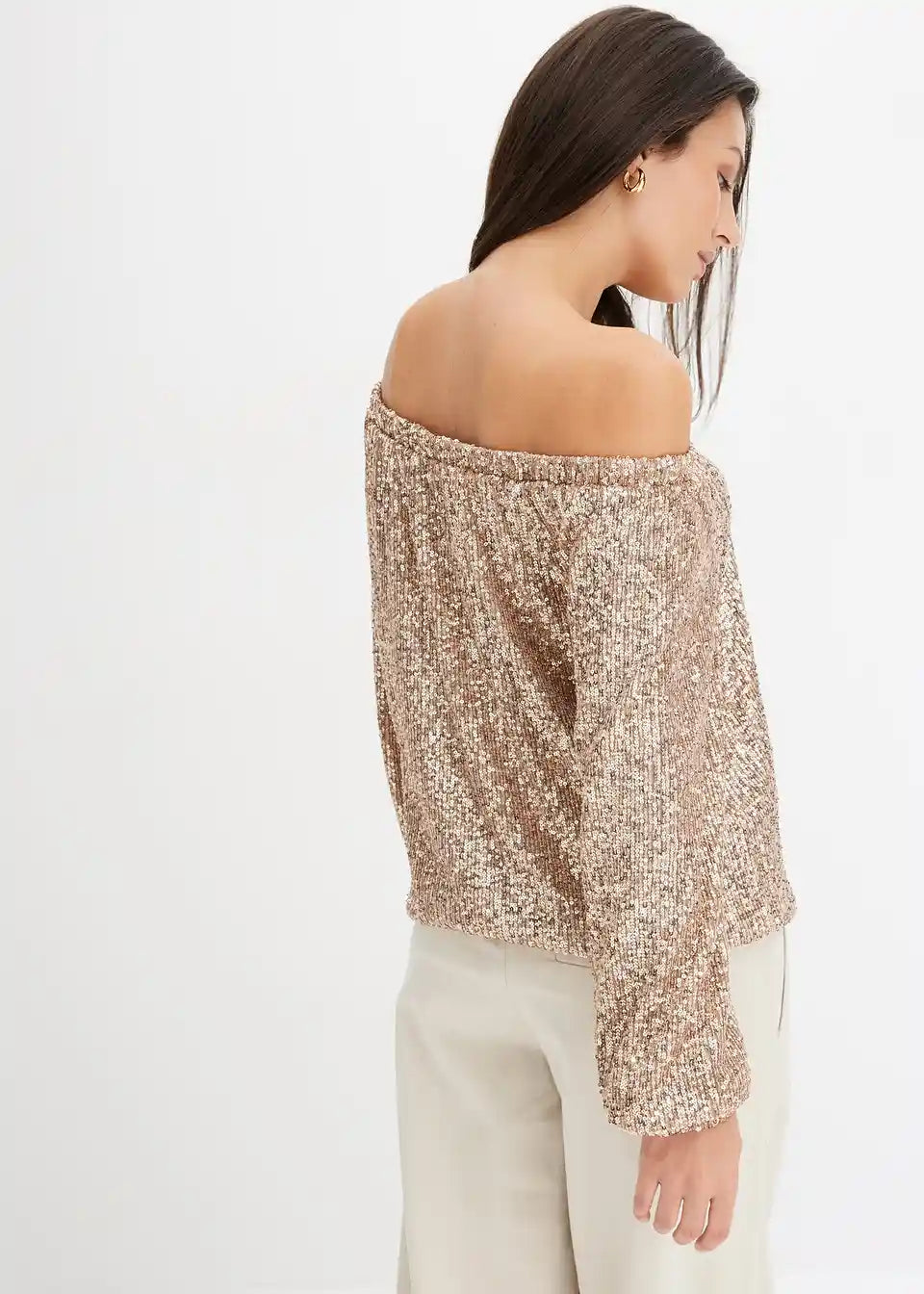 Majica s carmen izrezom oversize kroja sa šljokicama