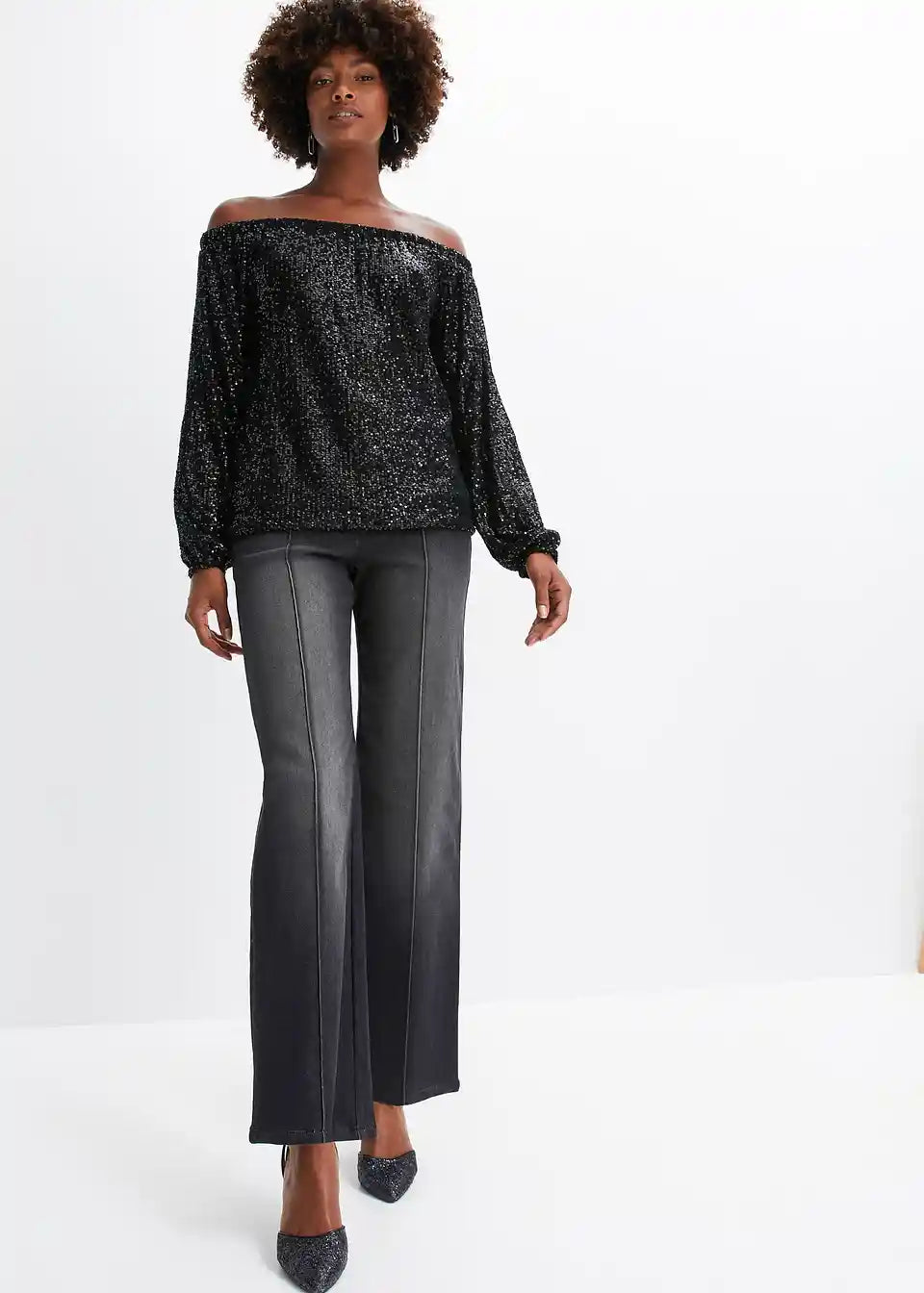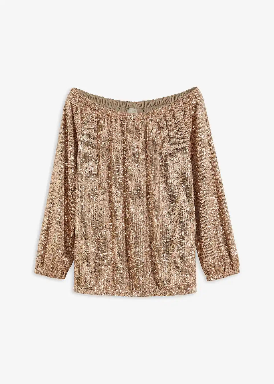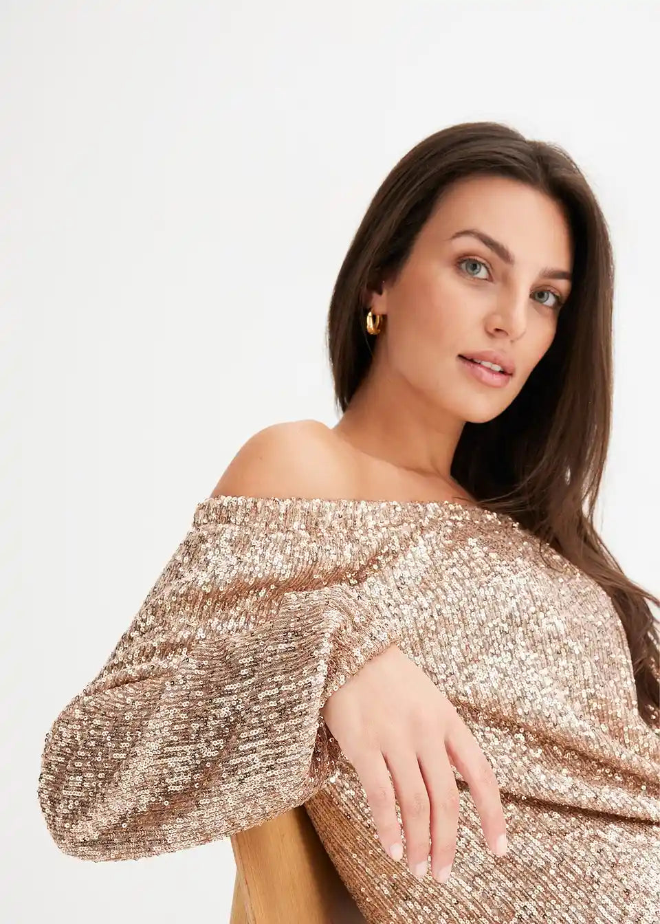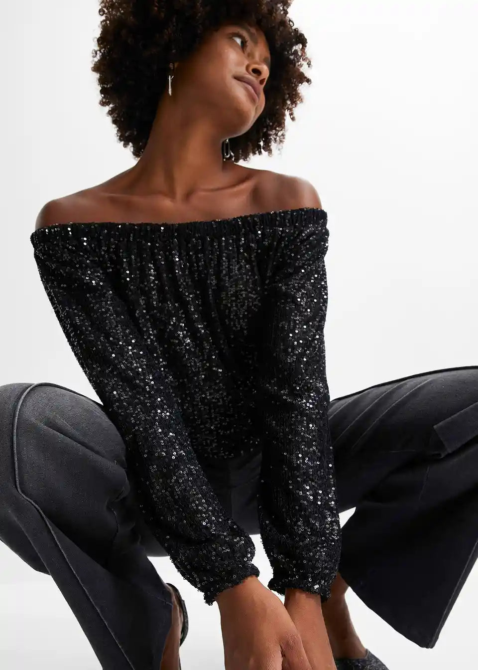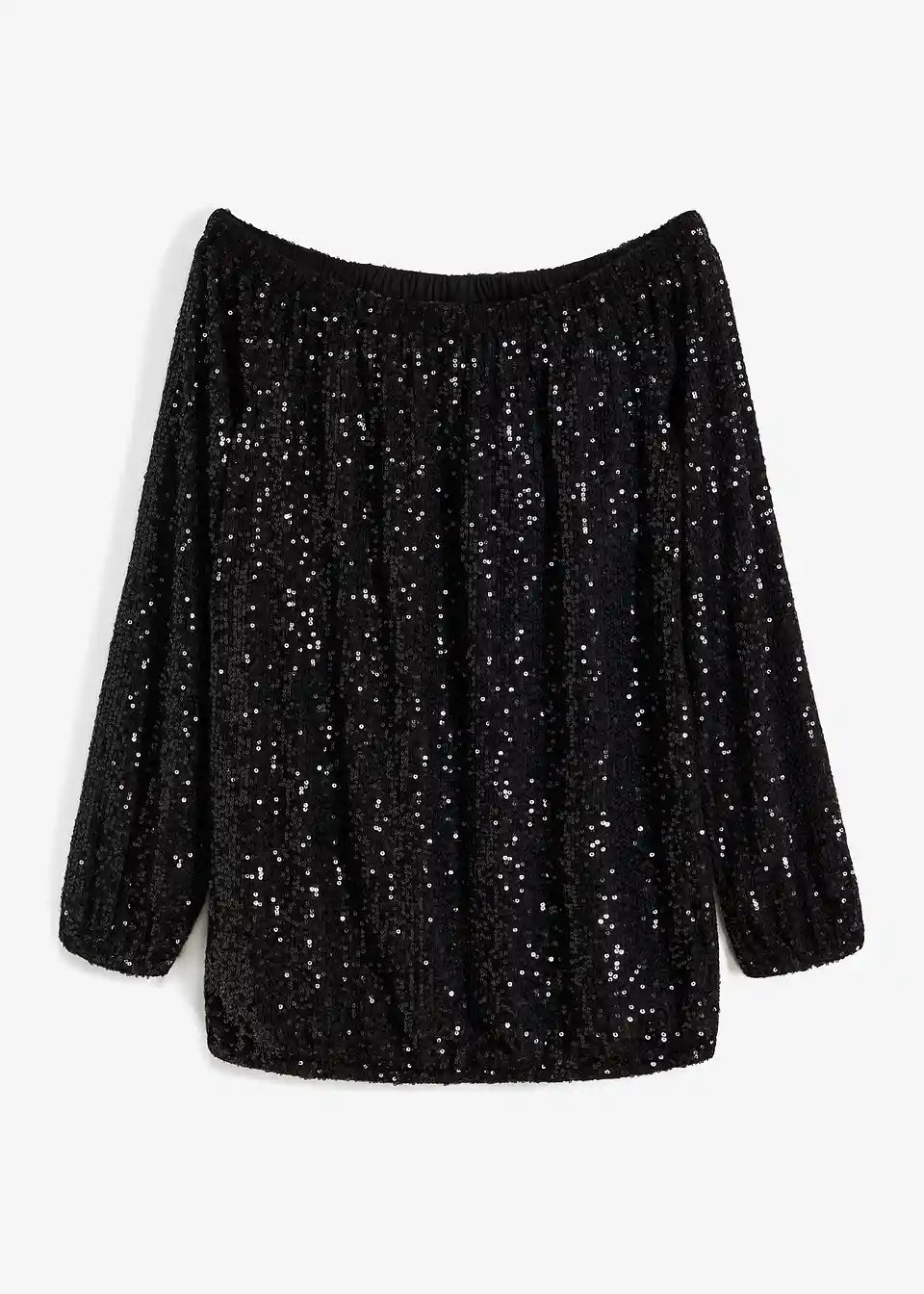 Majica s carmen izrezom oversize kroja sa šljokicama