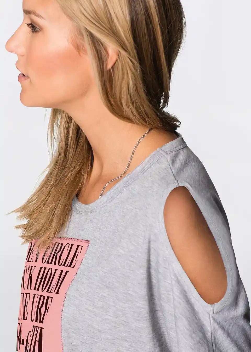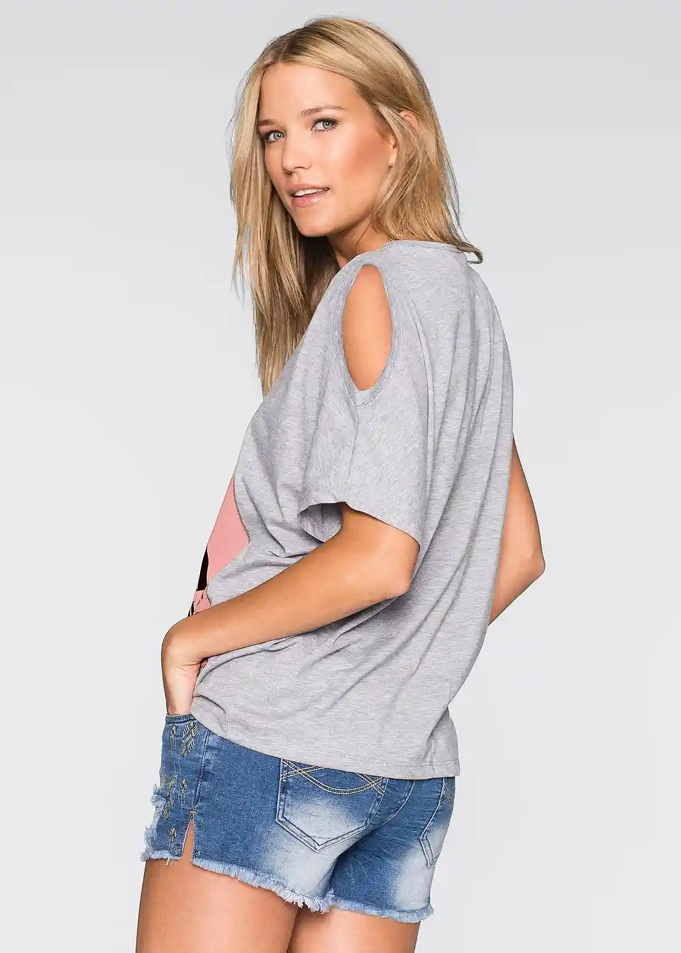 Majica s izrezima je odličan modni favorit za djevojke koje prate modu. Popularan dizajn s upečatljivim printom i cool izrezima na ramenima privlači poglede. Svojim opuštenim krojem, majica omogućuje raznovrsno kombiniranje. Posebno dobro djeluje uz kratke traperice s resicama na rubu za slobodno vrijeme.