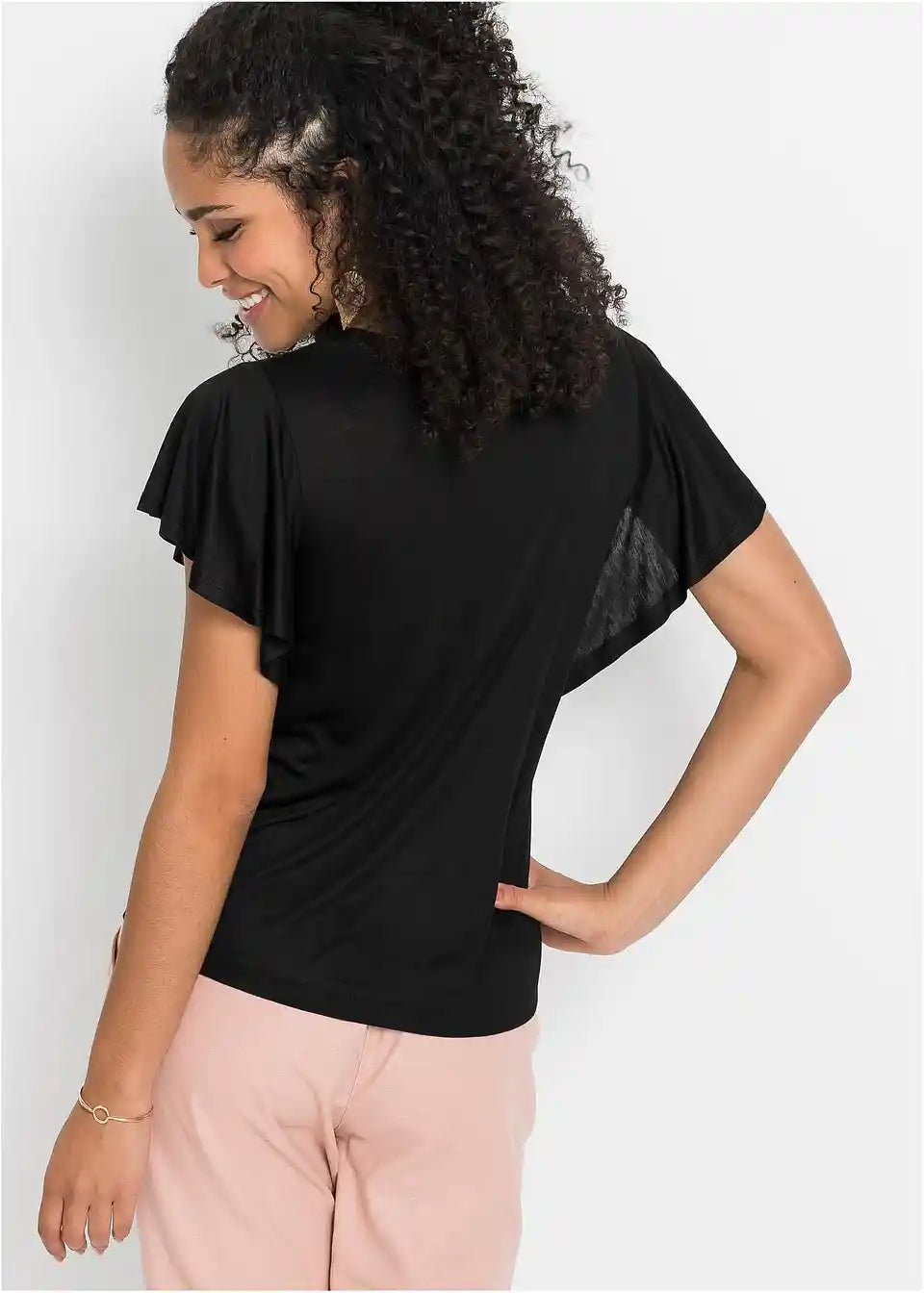 Ova majica marke BODYFLIRT oduševljava romantičnim dizajnom. Ukrasni volani obrubljuju otvore za ruke i čine široke krilaste rukave, koji pružaju šarmantan izgled. Uska obrubnica uokviruje privlačni V-izrez. Majica s kratkim rukavima izrađuje se od fino tekućeg materijala i zahvaljujući klasičnom, kroju koji prati liniju tijela, može se svestrano kombinirati.