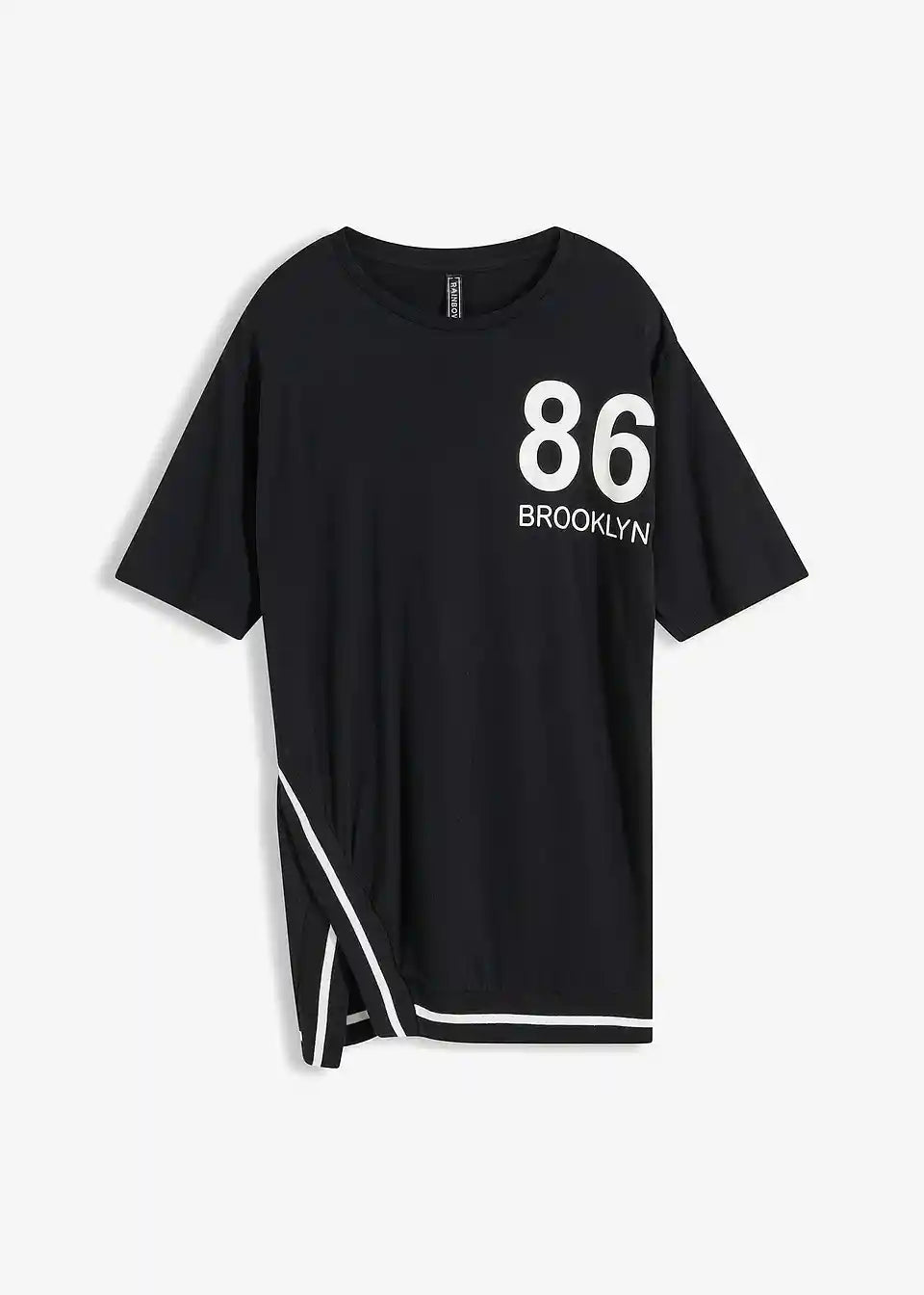 Ova majica se predstavlja kao pravi trendi komad s opuštenim ramenima i dodatno labavim krojem. Sportski print na visini prsa daje majici s oversize ramenima i 3/4 rukavima stylish izgled. S prednje strane, na desnoj strani, ova majica s okruglim izrezom dizajnirana je s asimetričnim prorezom. U kombinaciji s jakim izblijedjelim trapericama ili kožnim tajicama, dobiva se moderan outfit.