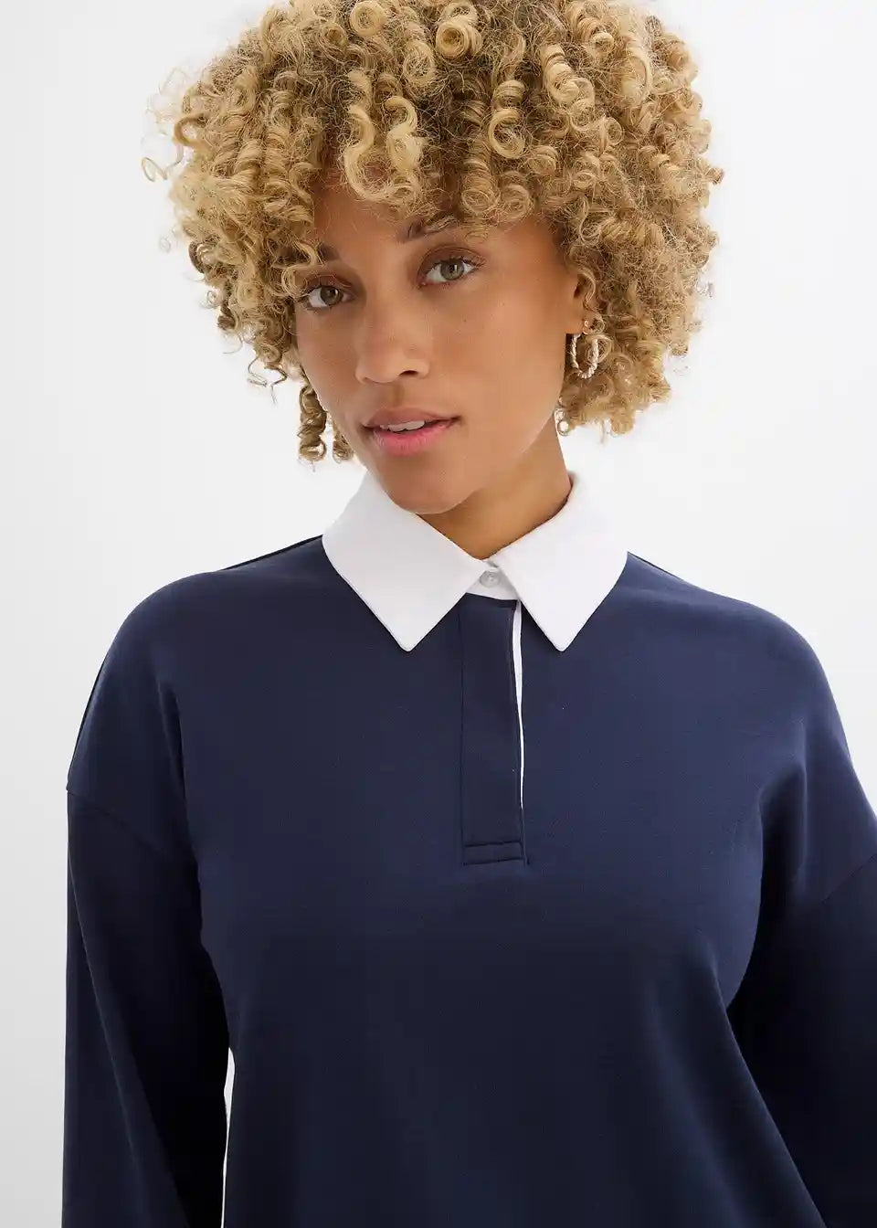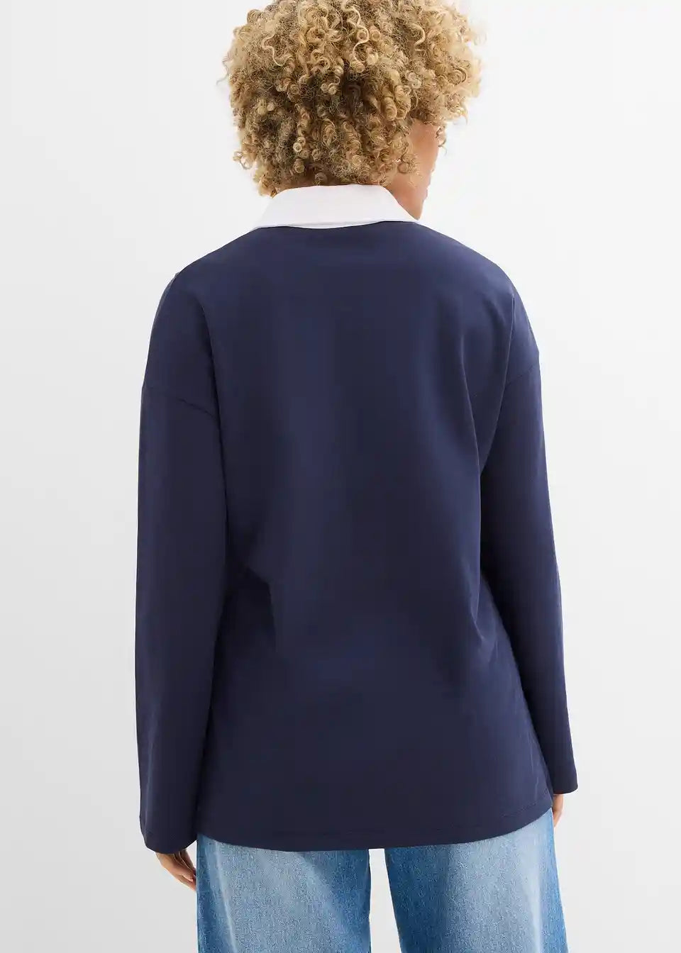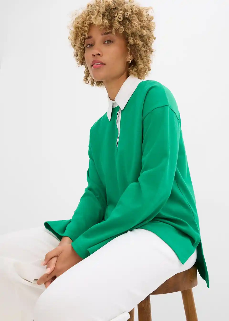Oversize polo majica s dugim rukavima i kontrastnim ovratnikom. S prekrivenim kopčanjem na gumbe i bočnim prorezima.