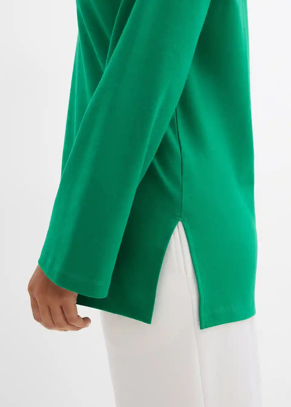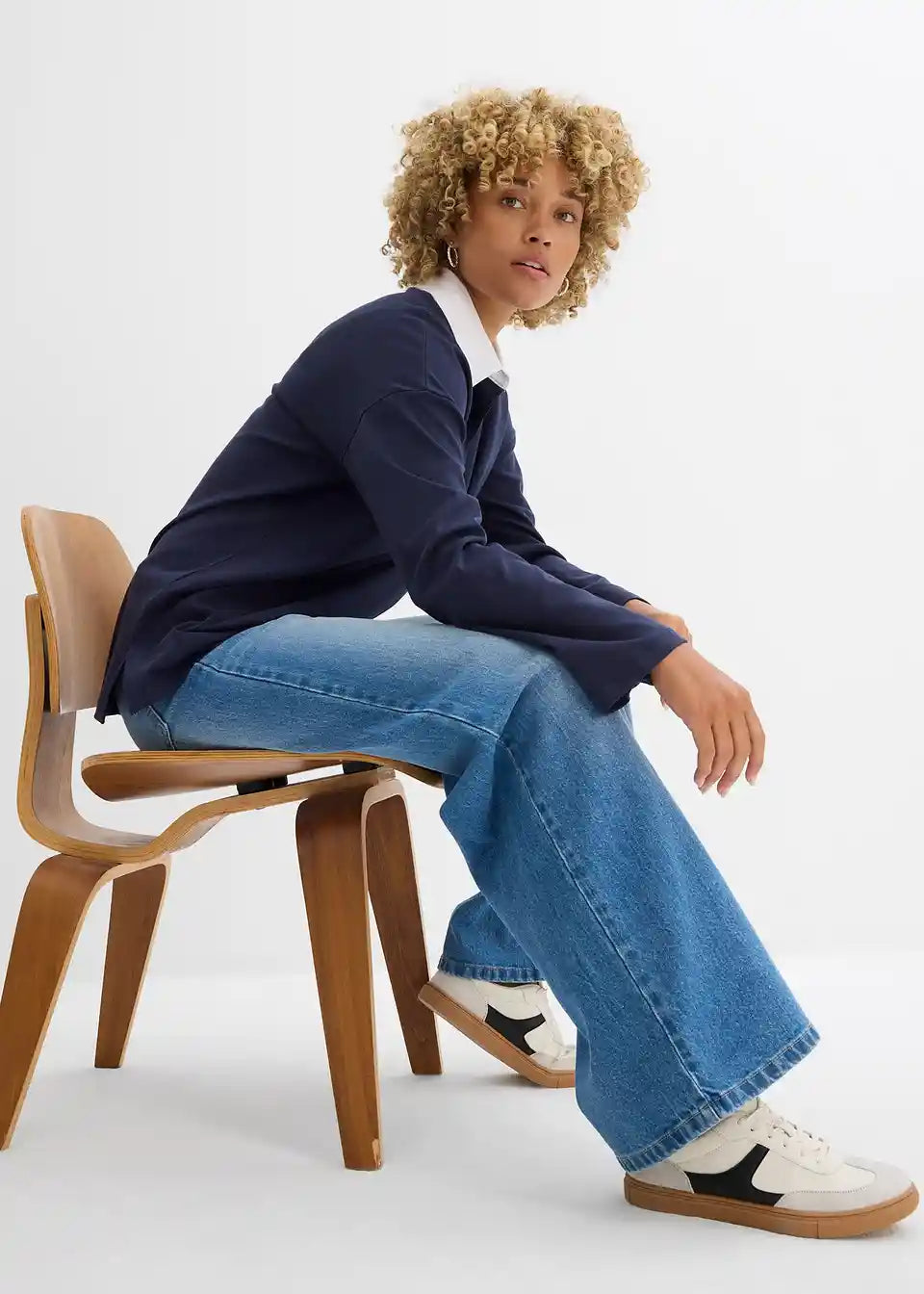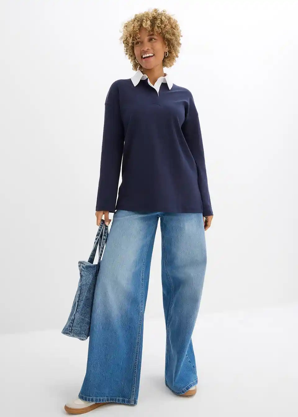 Oversize polo majica s dugim rukavima i kontrastnim ovratnikom. S prekrivenim kopčanjem na gumbe i bočnim prorezima.