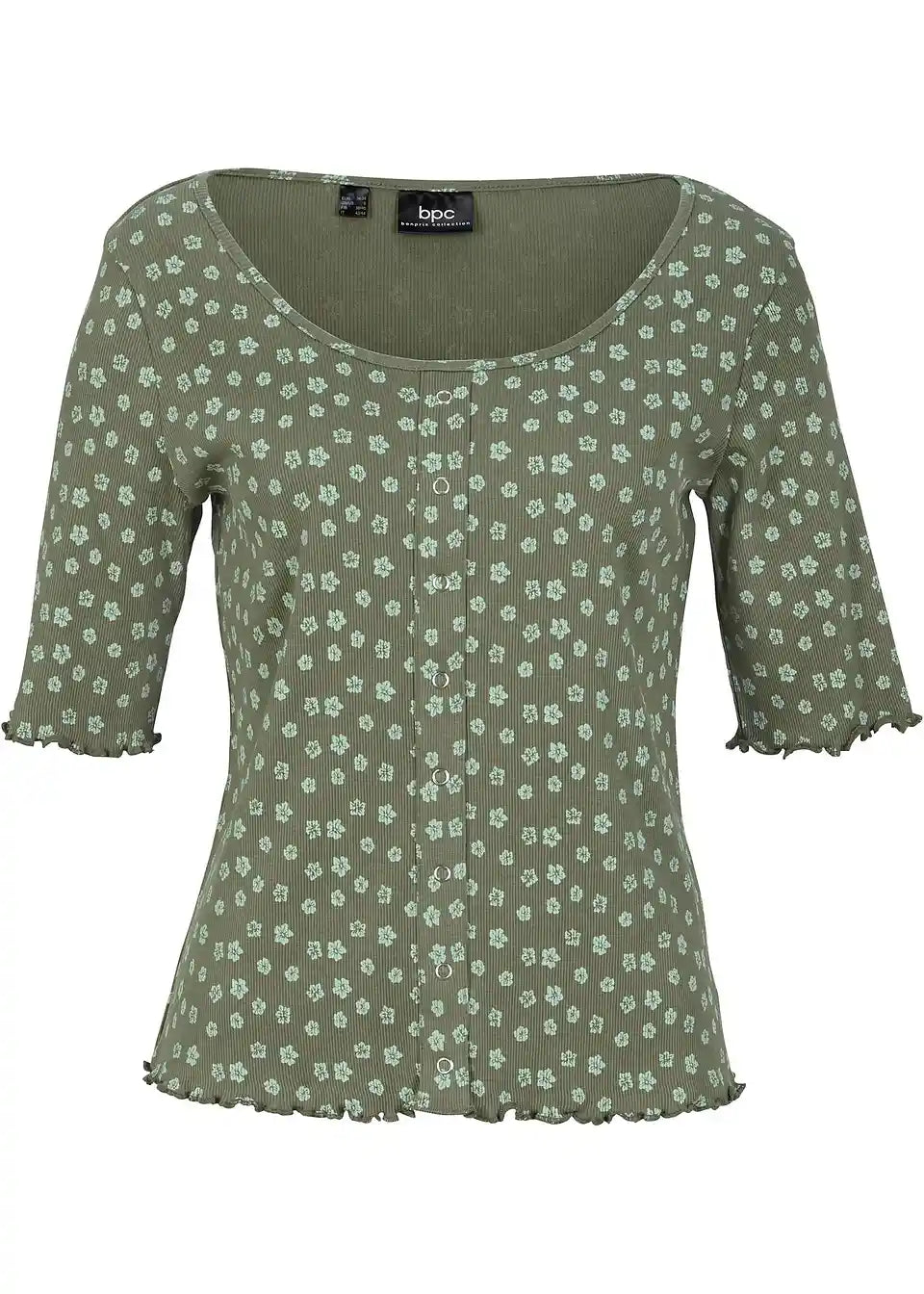 Rebrasta majica s dekorativnom dugmad i okruglim izrezom