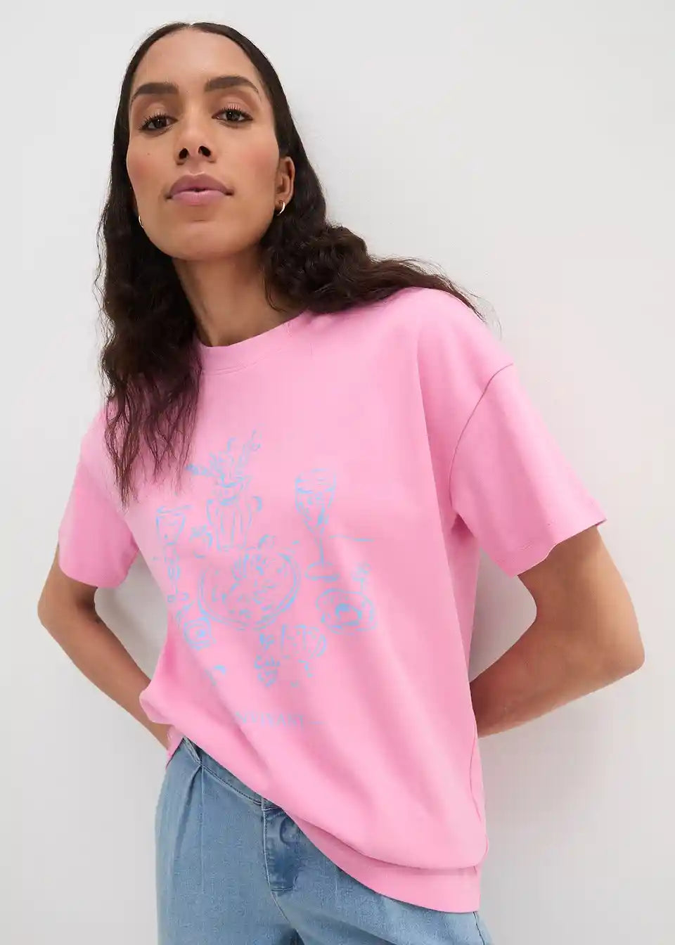 Das Shirt fällt größer aus, trage obenrum 38/40, dieses in 36/38 passt sehr gut, sitzt noch ziemlich locker. Es ist sehr kastig geschnitten, der Stoff ist sehr angenehm.