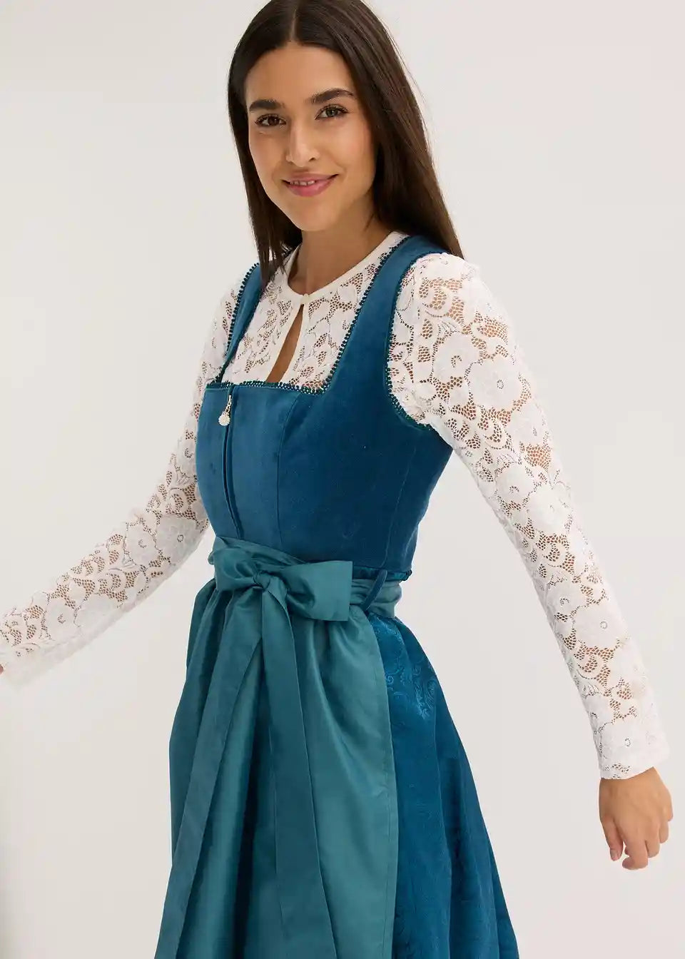 tradicionalni Dirndl s visokokvalitetnim baršunastim prslukom i svjetlucavom pregačom. Suknja je opremljena ugodnom pamučnom podstavom.