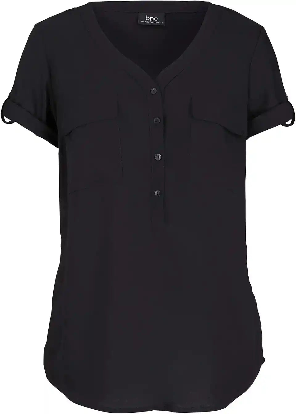 Ova bluza od viskoze s kratkim rukavima dobiva ležerni karakter zahvaljujući raznim detaljima. V-izrez prelazi u malu kopčicu na dugmad. Lijevo i desno nalaze se dva džepa s preklopom. Još jedan zanimljiv detalj je remen s gumbom na rukavima. Diskretna A-silueta nadopunjuje bluzu kratkih rukava u ugodnoj kvaliteti viskoze iz bpc kolekcije. Savršena je u kombinaciji s trapericama, kratkim hlačama i udobnim suknjama.