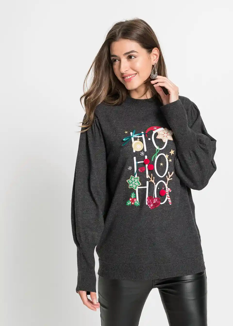 Mekani Pulover s Božićnim Motivom i Balon-Rukavima