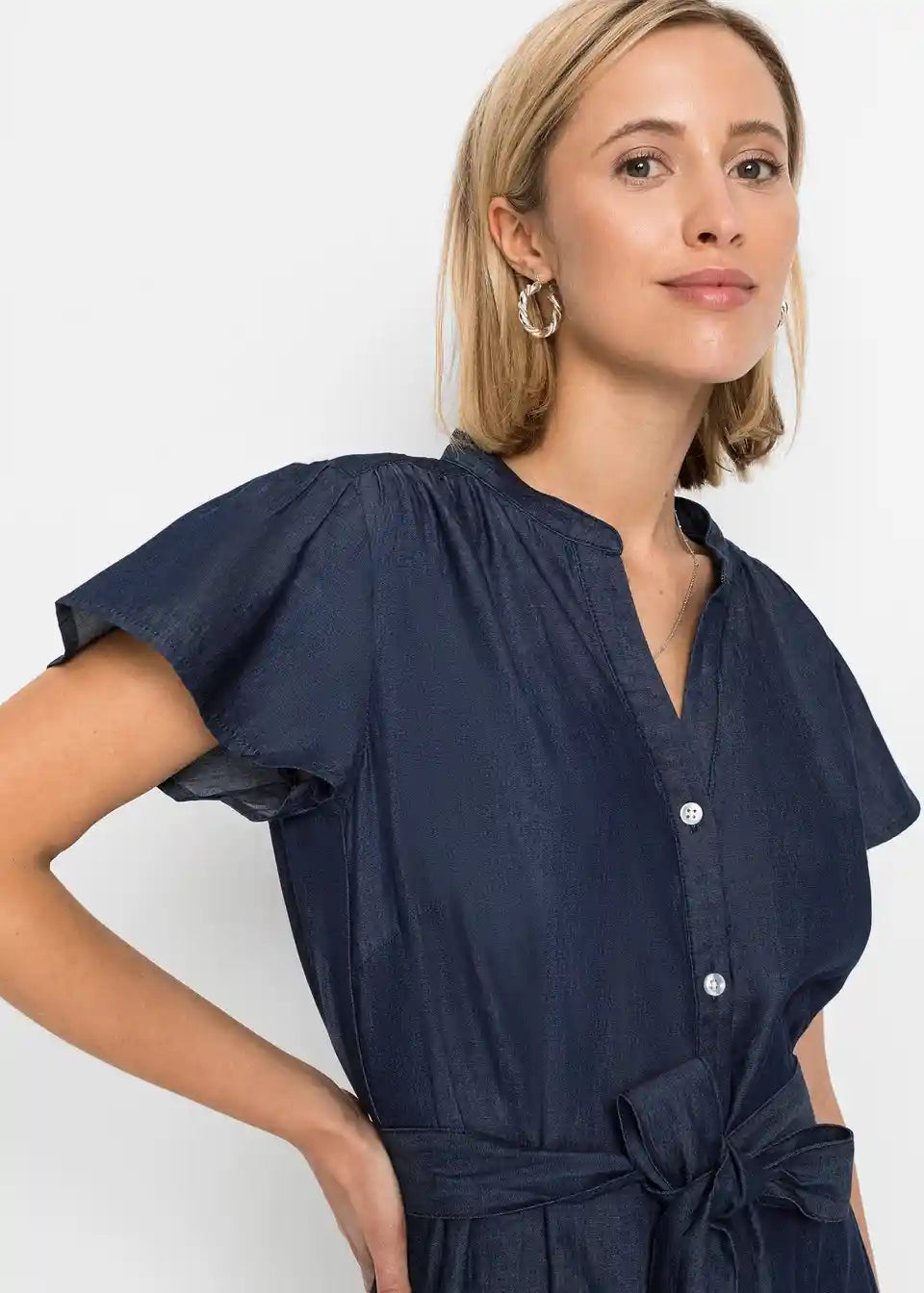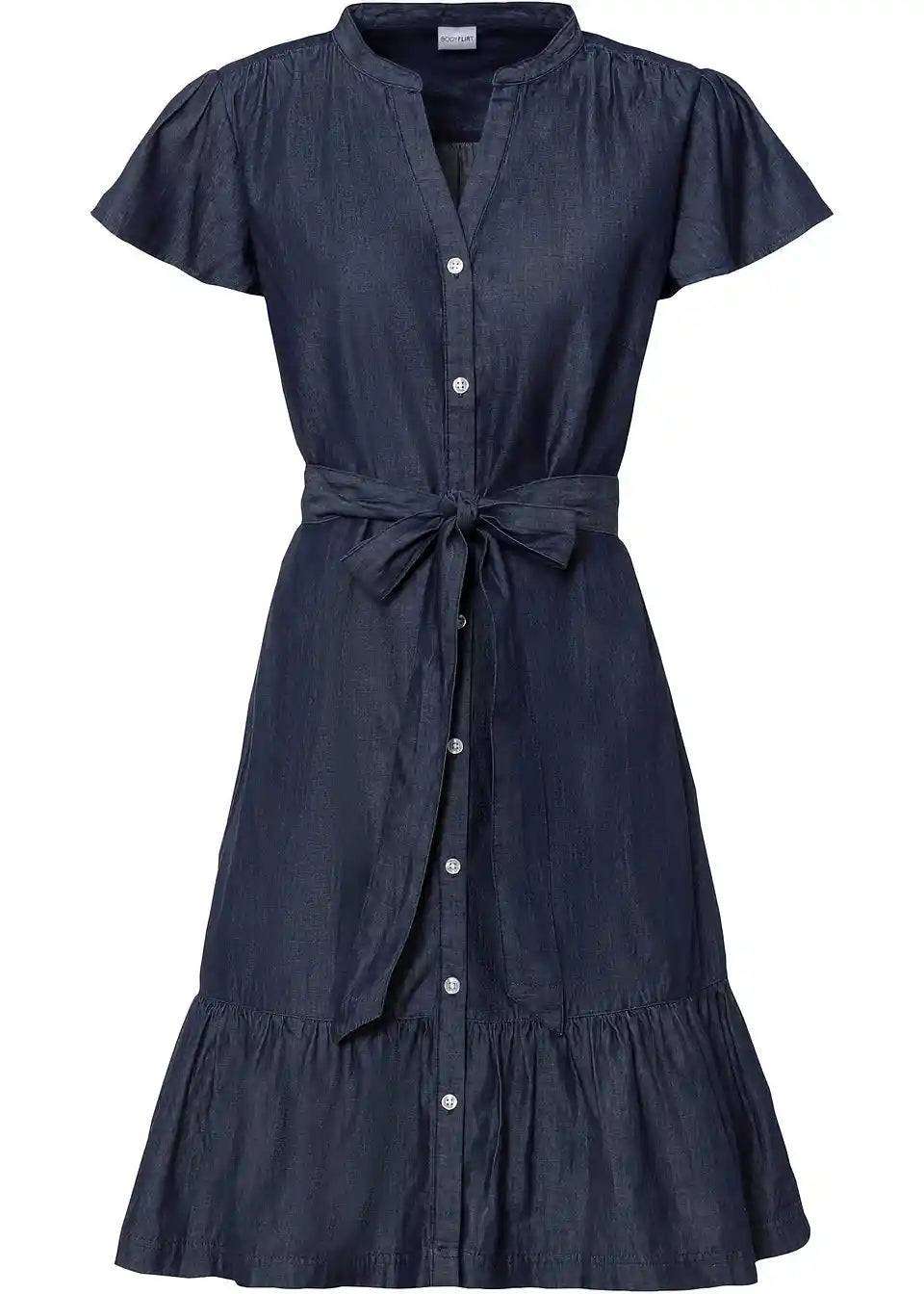 Moderna jeans haljina sa slatkim naborima na ramenima i volanima na rubu.