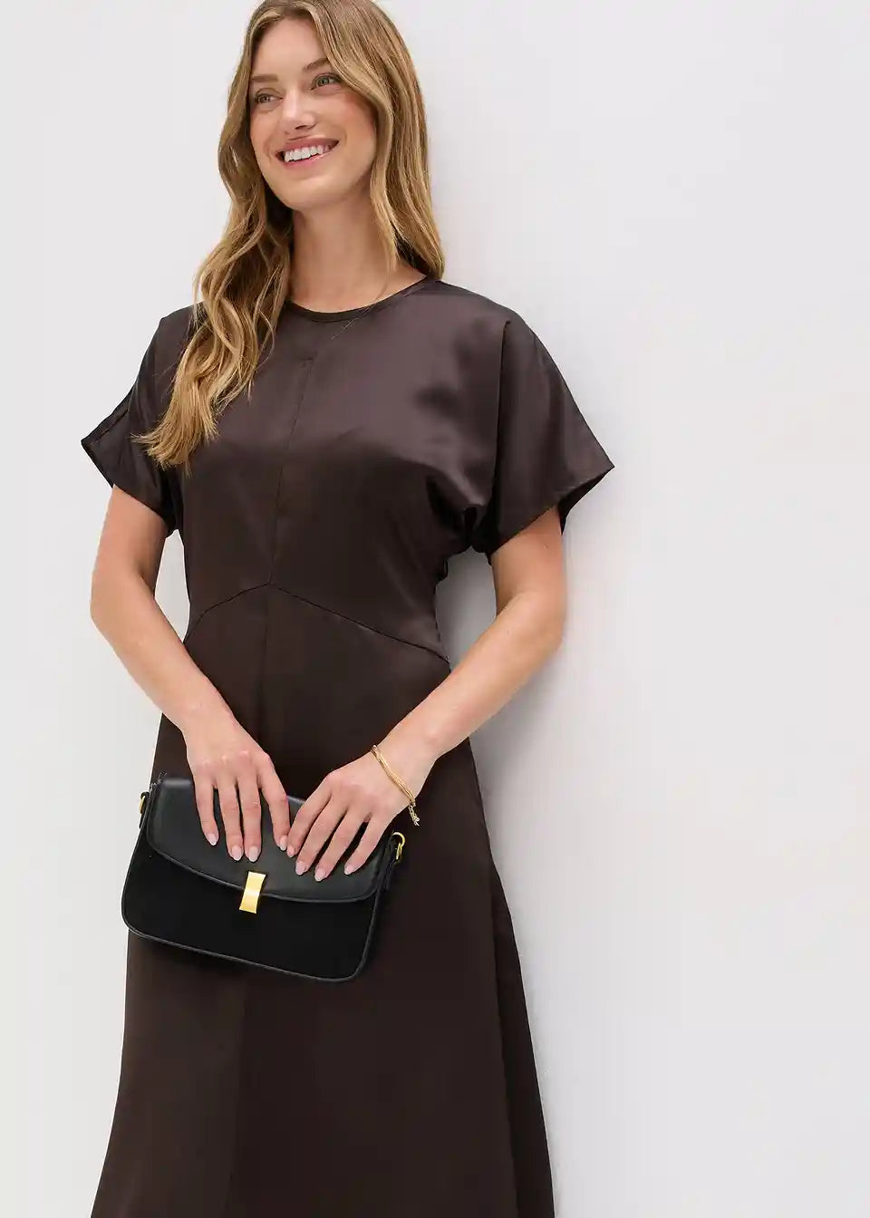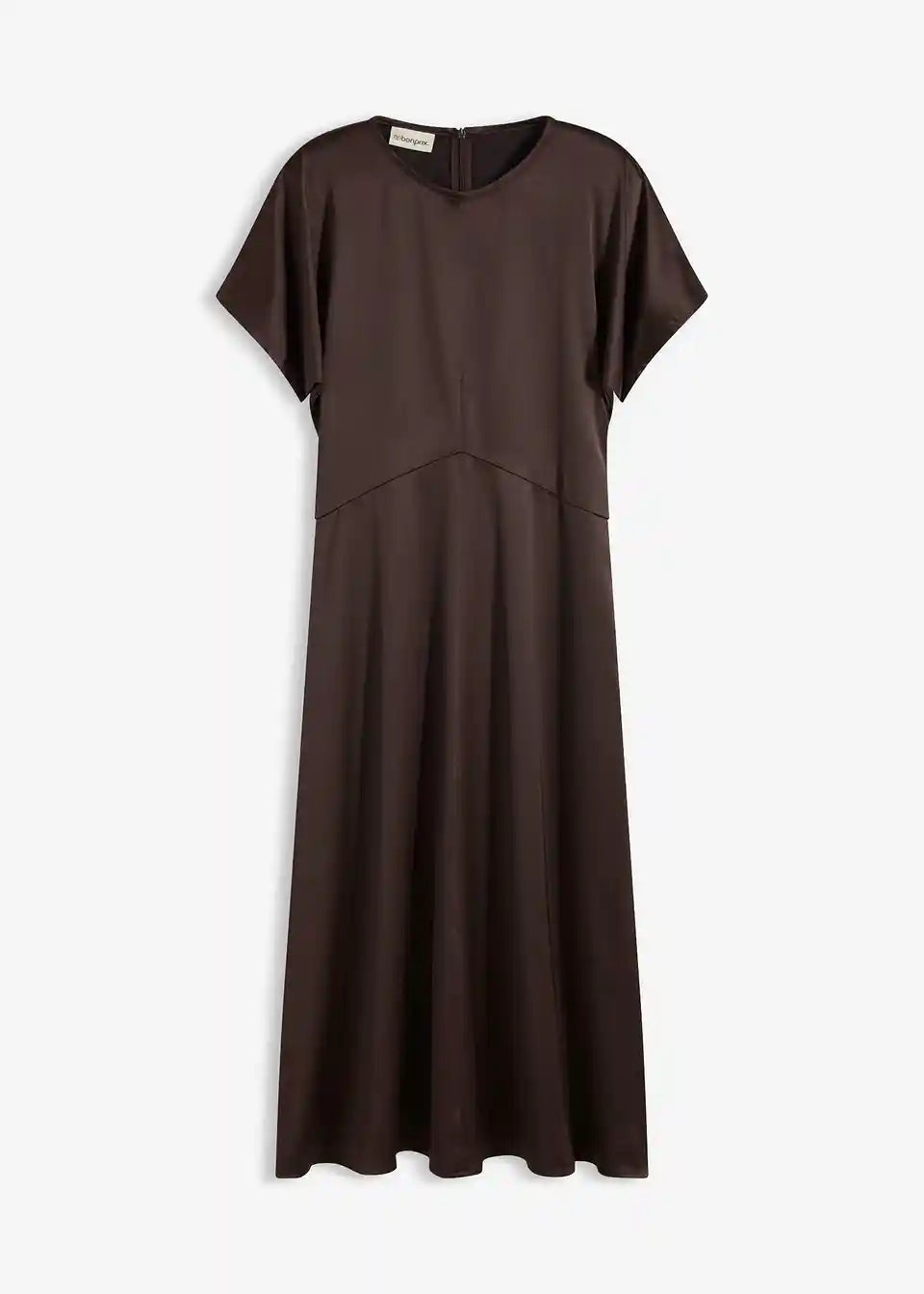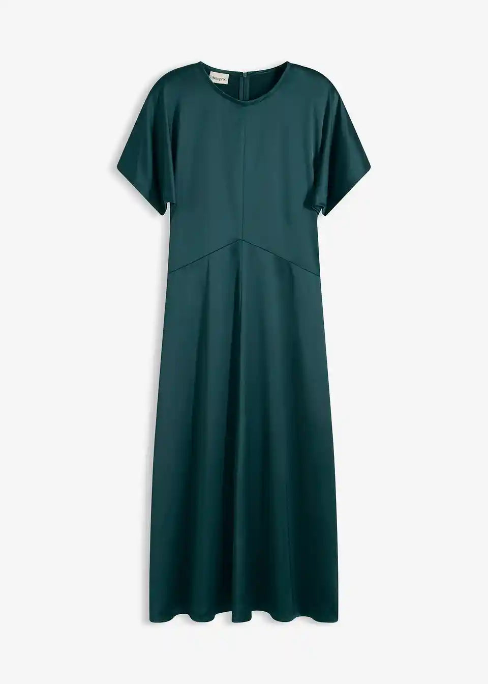 Midihaljina od lepršavog satena ima strukiranu siluetu i široke rukave
