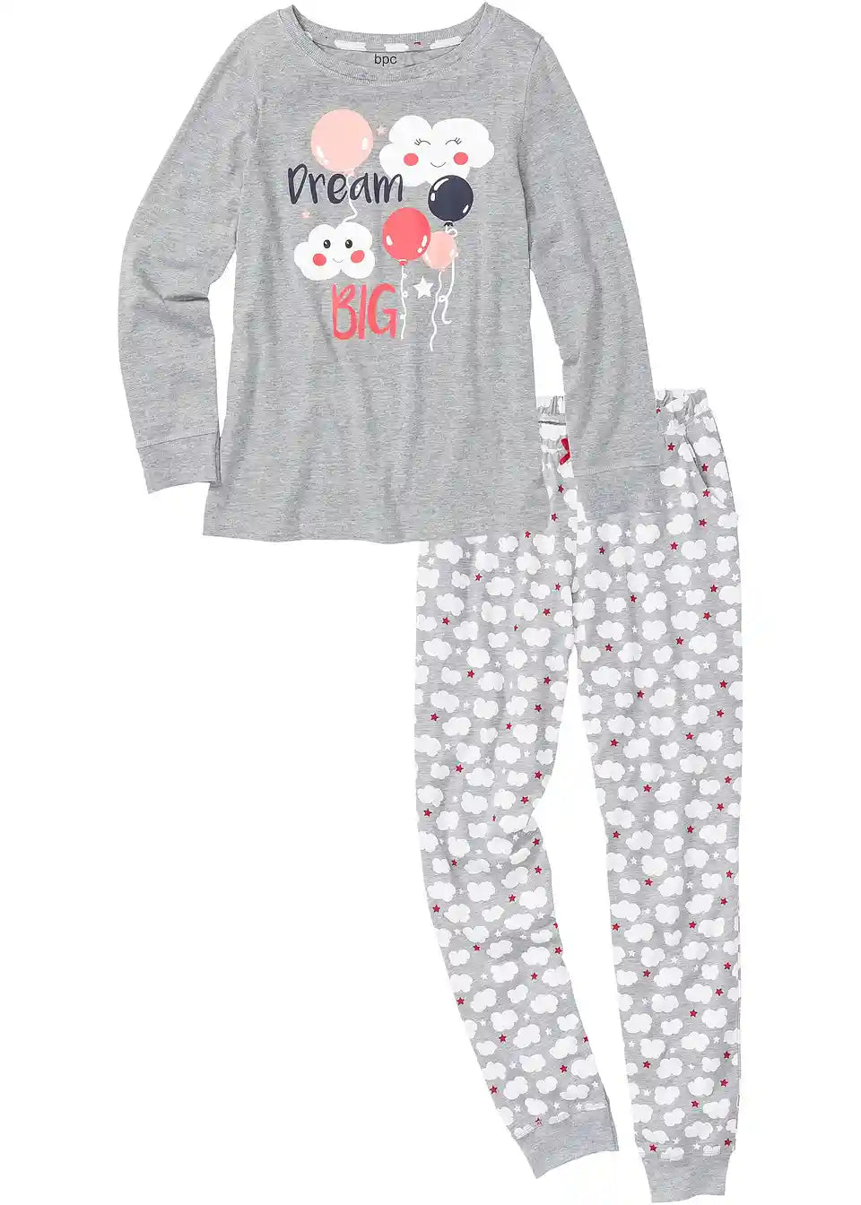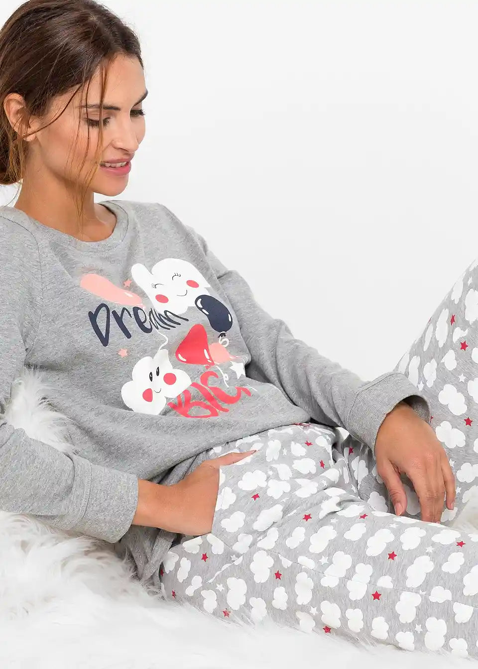 Ova slatka pidžama, koja se sastoji od majice s dugim rukavima i hlača, oduševljava svojom mekanoćom zahvaljujući visokom udjelu pamuka. Rebraste manžete na završetku rukava i nogavica osiguravaju sportski izgled. Razigrani print oblaka na pidžami zaokružuje dizajn.