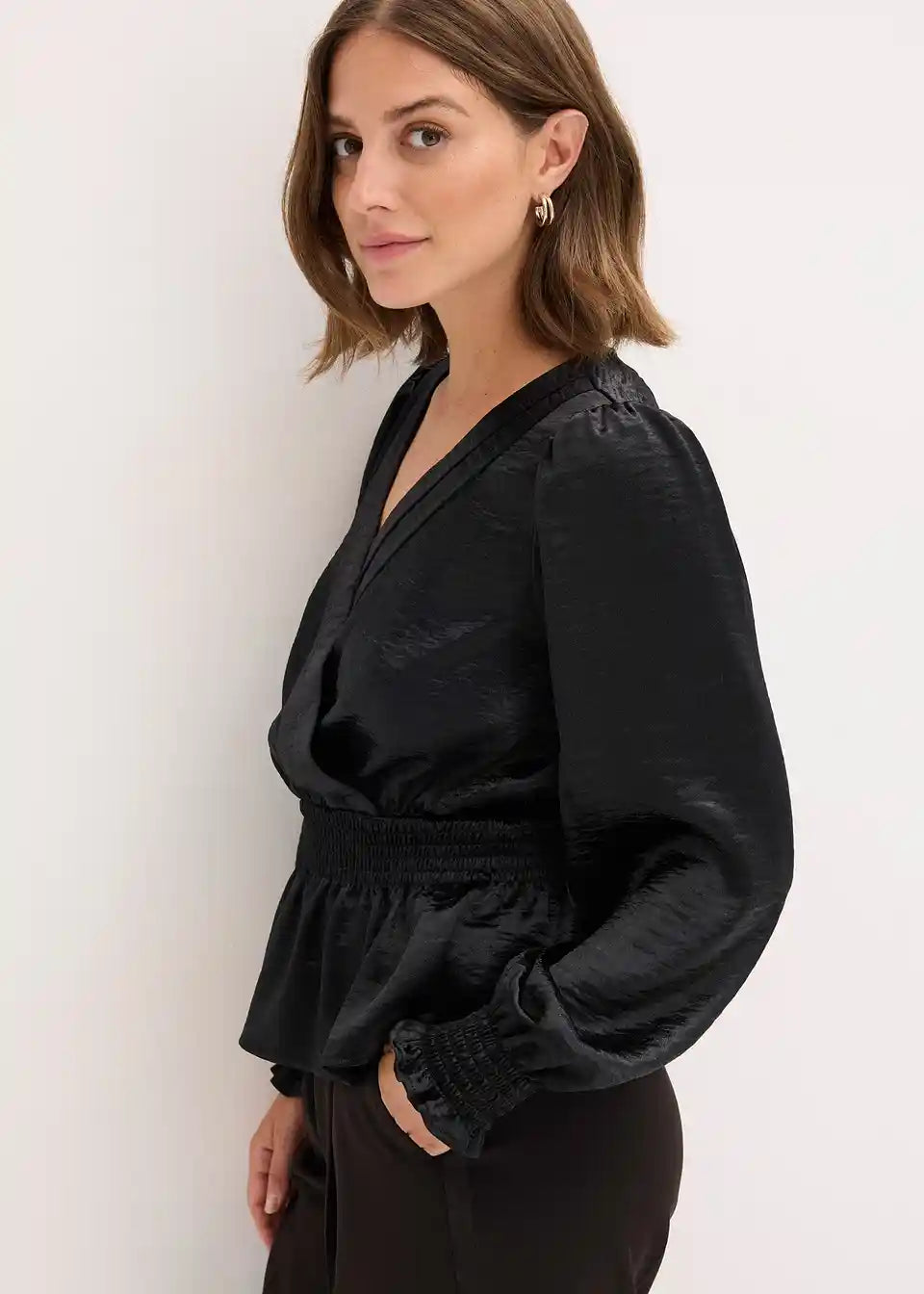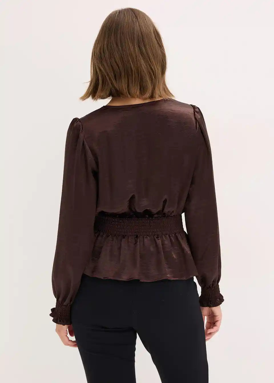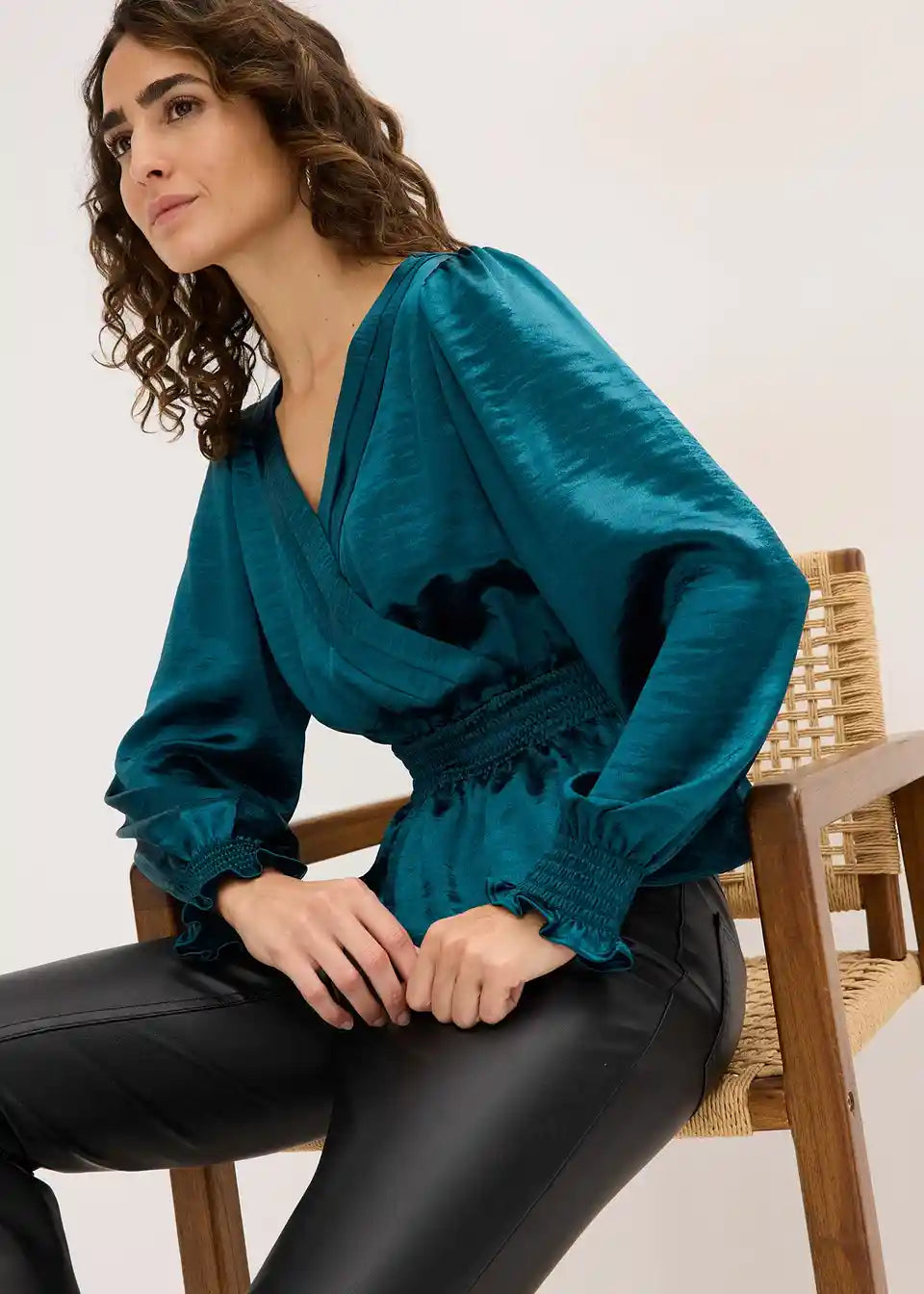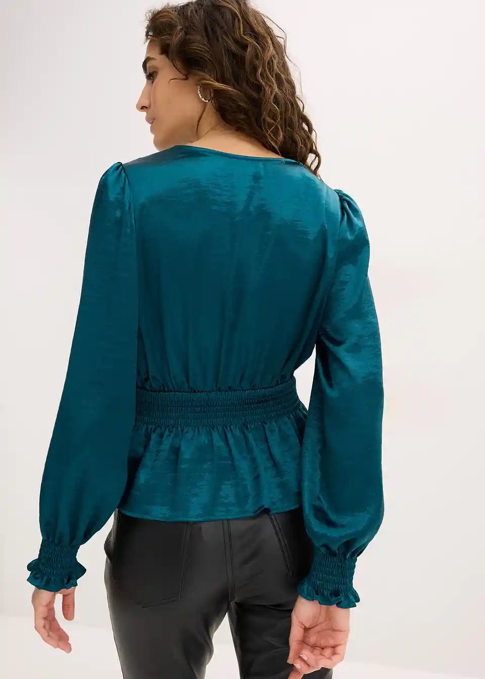 Odlična bluza za zabavu i ured od tekućeg satena s balon rukavima i smock strukom