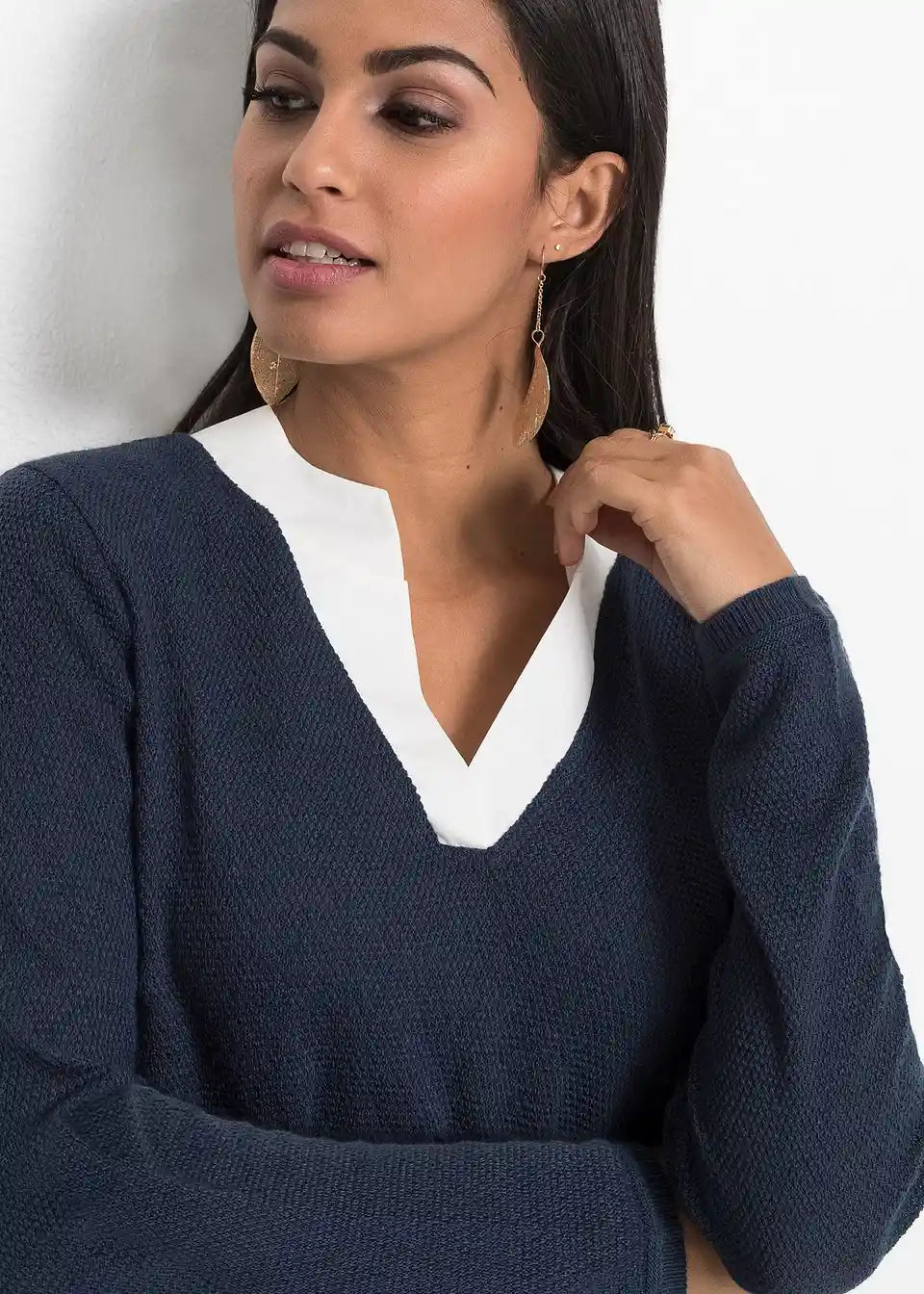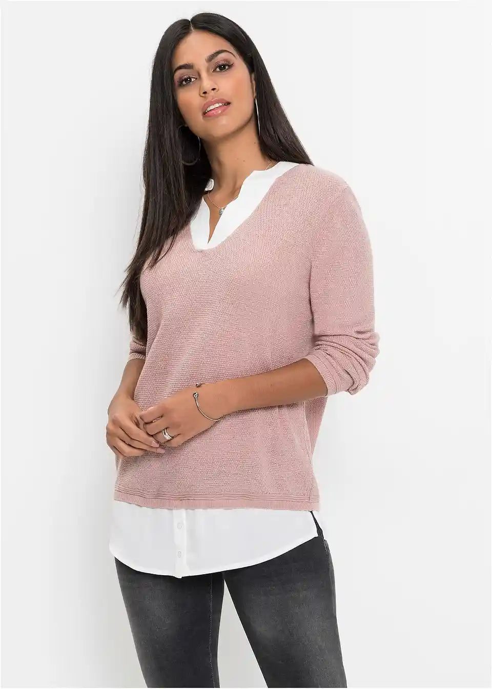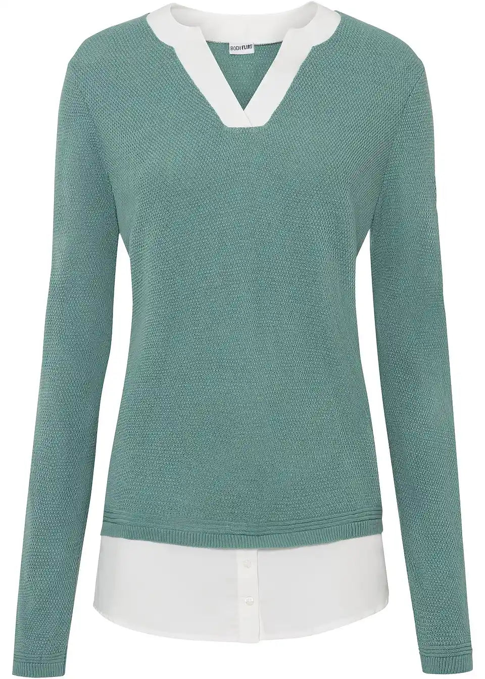 U modernom slojevitom izgledu, ovaj elegantni pulover s umetkom bluze dizajniran je od strane BODYFLIRT. Pleteni gornji dio s finim uzorkom strukture nadopunjuju kontrastni umetci od glatkog, lepršavo mekanog materijala na prednjoj strani i rubu. Profini detalji uključuju kratke proreze sa strane i lažni niz gumba. Mali stojeći ovratnik ukrašen je dekorativnim V-izrezom.