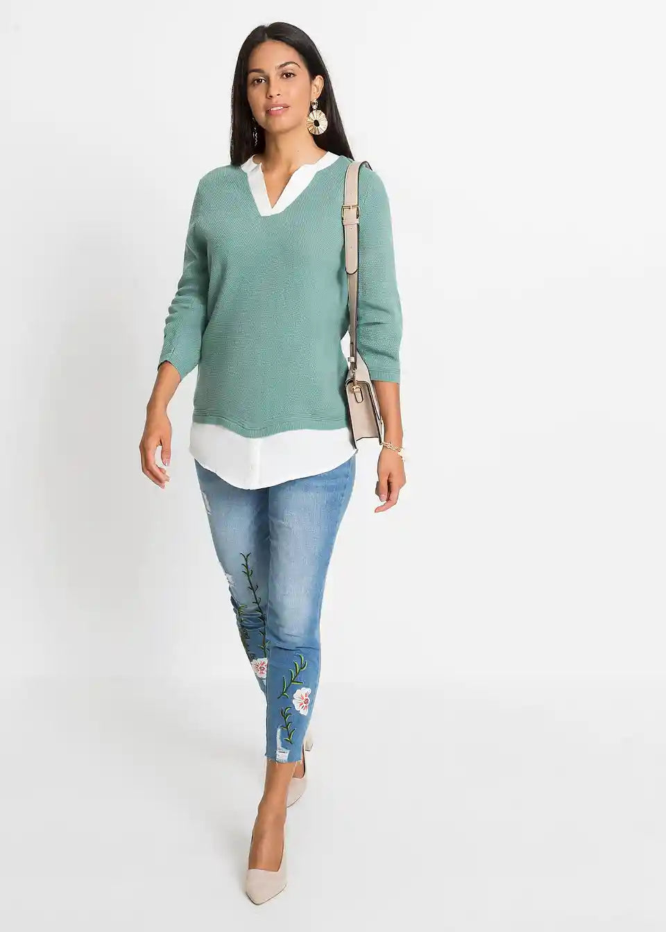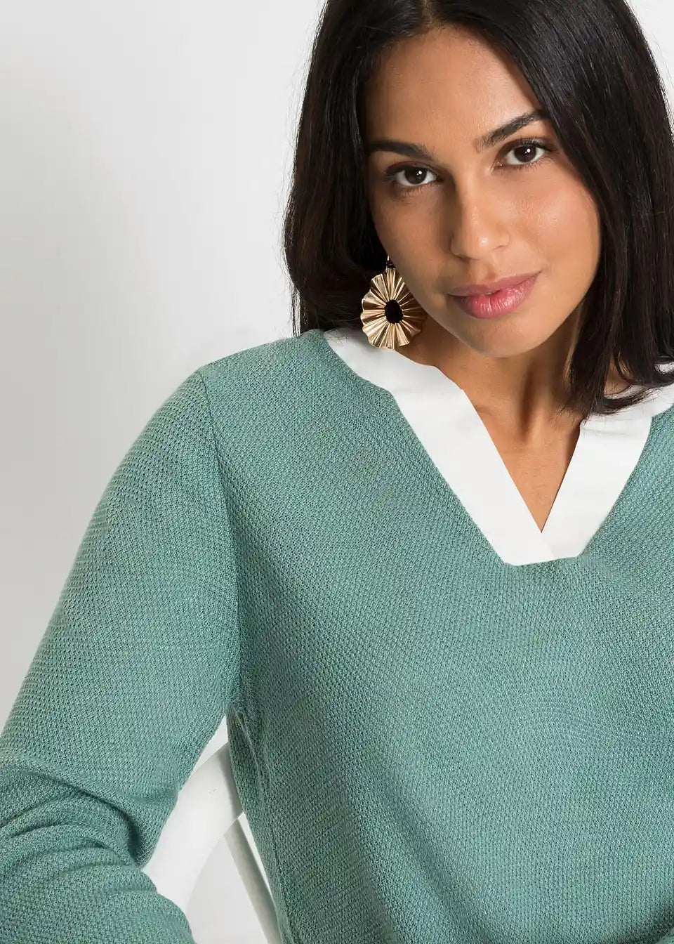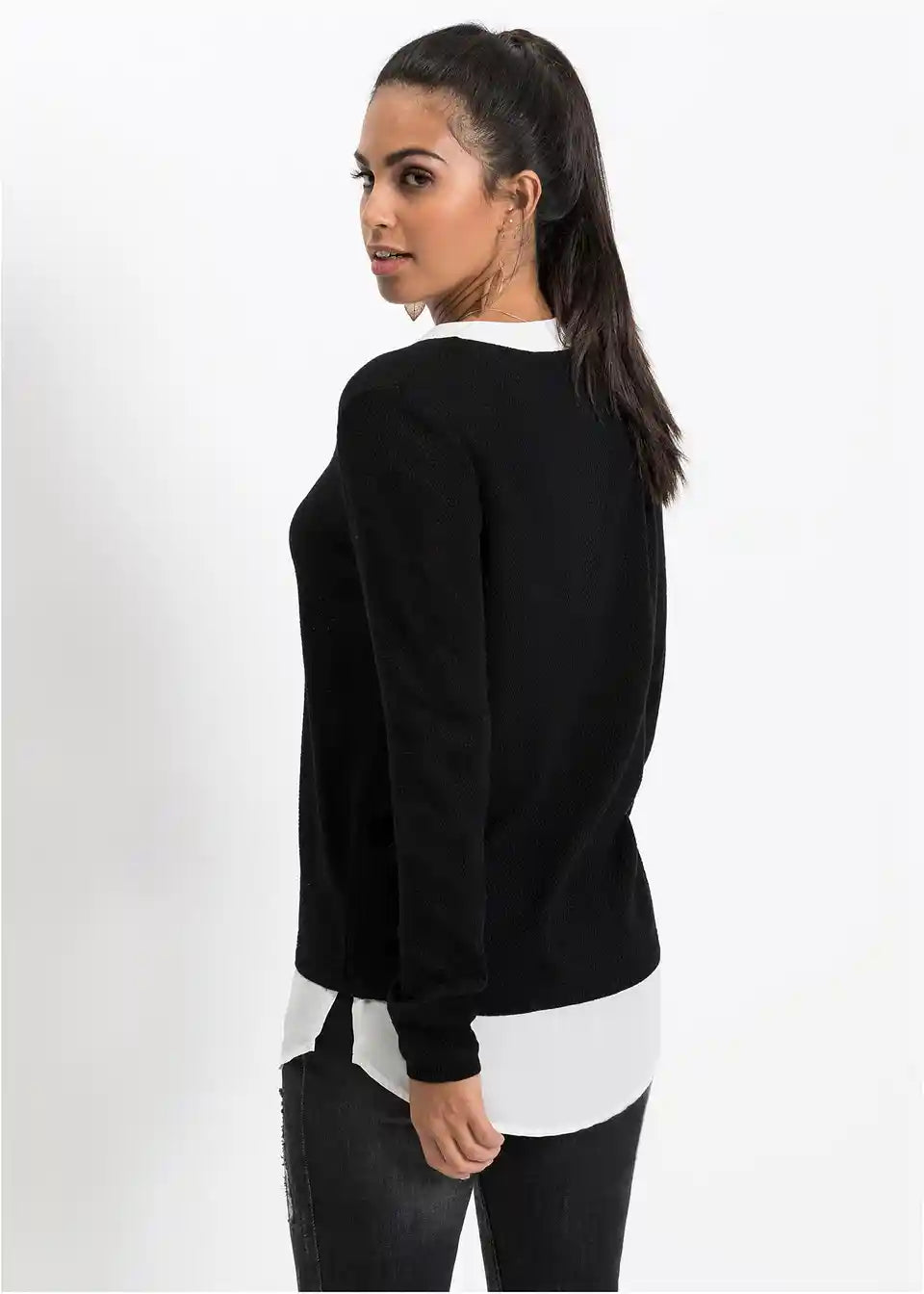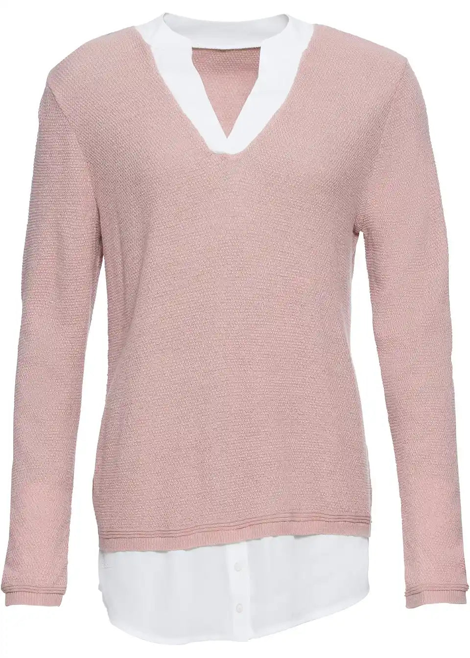U modernom slojevitom izgledu, ovaj elegantni pulover s umetkom bluze dizajniran je od strane BODYFLIRT. Pleteni gornji dio s finim uzorkom strukture nadopunjuju kontrastni umetci od glatkog, lepršavo mekanog materijala na prednjoj strani i rubu. Profini detalji uključuju kratke proreze sa strane i lažni niz gumba. Mali stojeći ovratnik ukrašen je dekorativnim V-izrezom.
