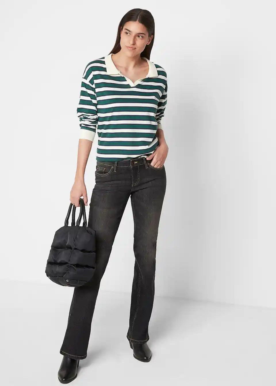 Rastezljive traperice BOOTCUT od Johna Banera oduševljavaju svojom jednostavnom estetikom. Model u decentnom ispranom izgledu dolazi s normalnom visinom struka i lagano proširenim nogavicama. Ovaj oblik poruba odgovara gotovo svim tipovima obuće. Bilo s pumpama, čizmama, tenisicama, sandalama ili balerinkama: Bootcut stil rastezljivih traperica s pet džepova i varijantom zatvaranja s gumbom i patentnim zatvaračem omogućuje brojne kombinacije.