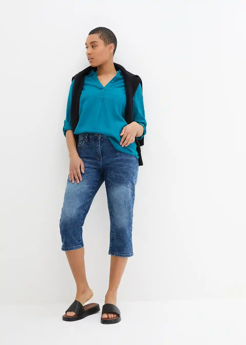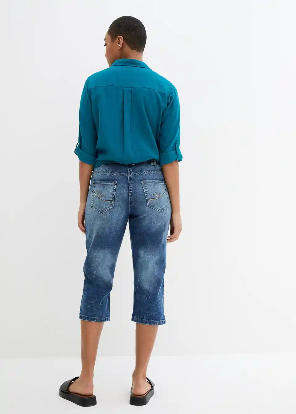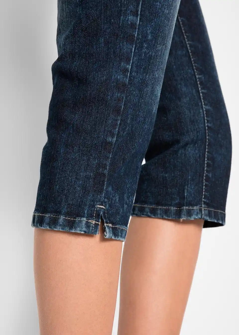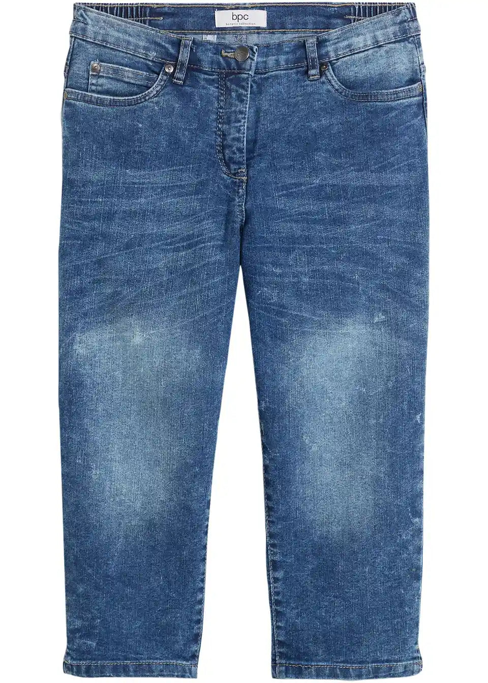 Udio elastana daje ovim udobnim rastezljivim trapericama u iznošenom stilu savršeno pristajanje. Upadljivo pranje i nabori na bedrima dodaju privlačan izgled ovom udobnom modelu iz bpc kolekcije. Rastezljive Capri traperice koje oblikuju figuru prikazuju se u klasičnom 5-džepnom dizajnu. Mali prorezi na kraju nogavica upotpunjuju atraktivnost ovih 3/4 hlača. Mogu se kombinirati na ležeran način sa tenisicama i majicom ili na razigran način sa sandalama i tunikom s cvjetnim uzorkom.