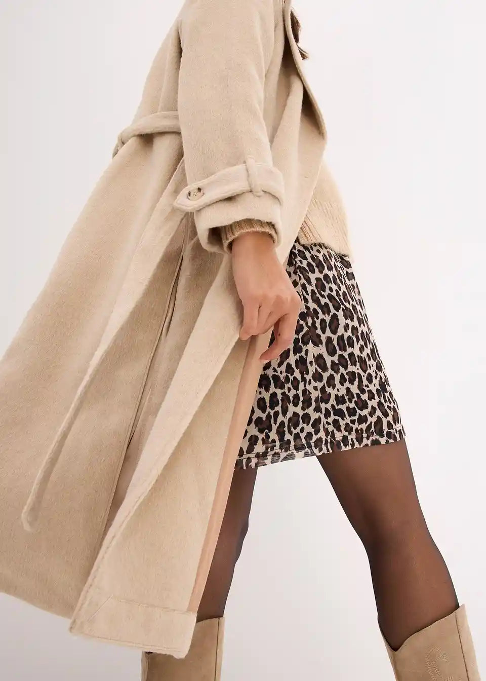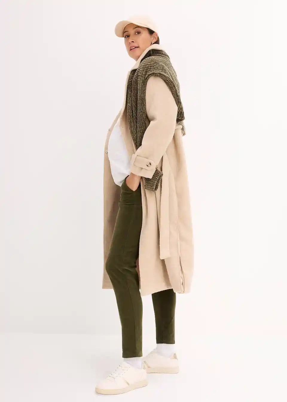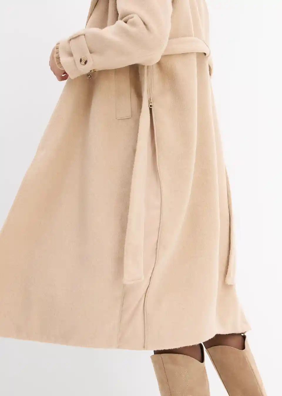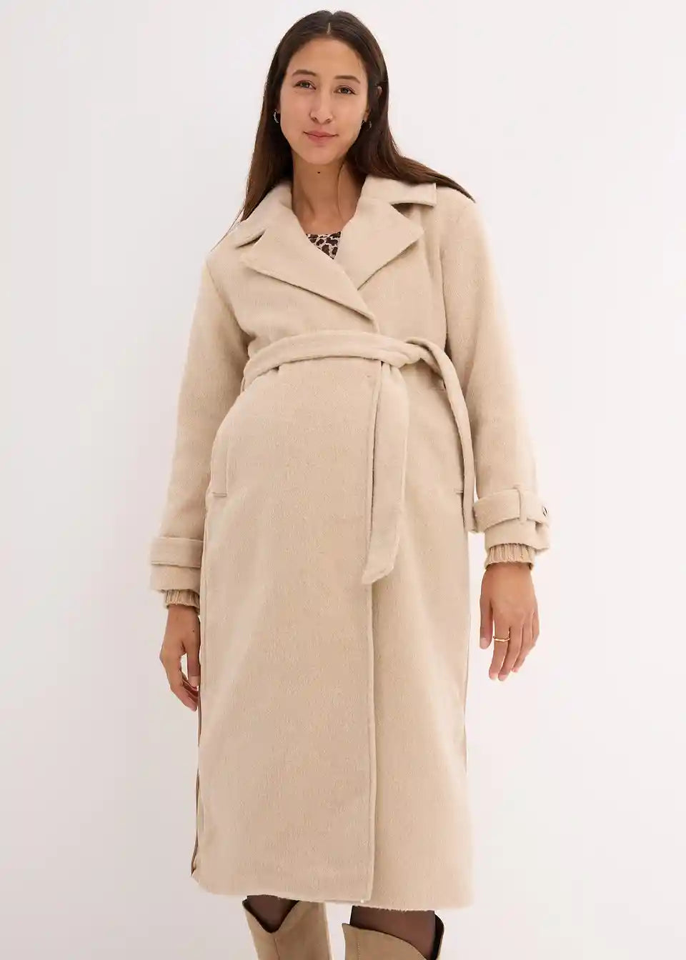 Duži kaput od mekanog tkanog materijala sa uspravnim reverima i skrivenim kopčama sprijeda te širokim, odvojivim remenom za vezanje. S bočnim patentnim zatvaračima za reguliranje širine, koji omogućuju nošenje i tijekom i nakon trudnoće. S ušivenim džepovima. Podstavljen.