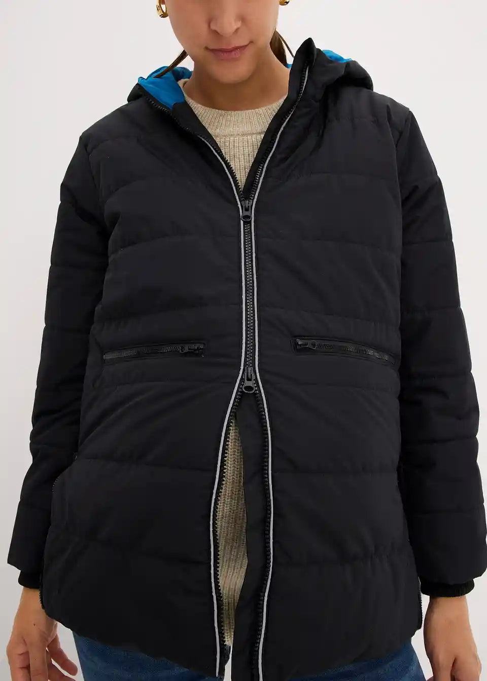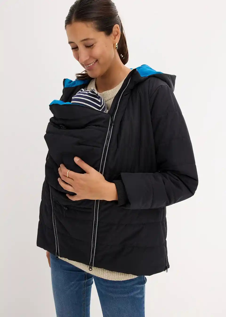 Podstavljena jakna za trudnice s umetkom za nošenje bebe i bočnim patentnim zatvaračima za regulaciju širine, koji omogućuju nošenje i tijekom trudnoće i nakon nje. S patentnim džepovima. S modernom kontrastnom podstavom i reflektorima koji osiguravaju vidljivost u mraku i pri slaboj svjetlosti.