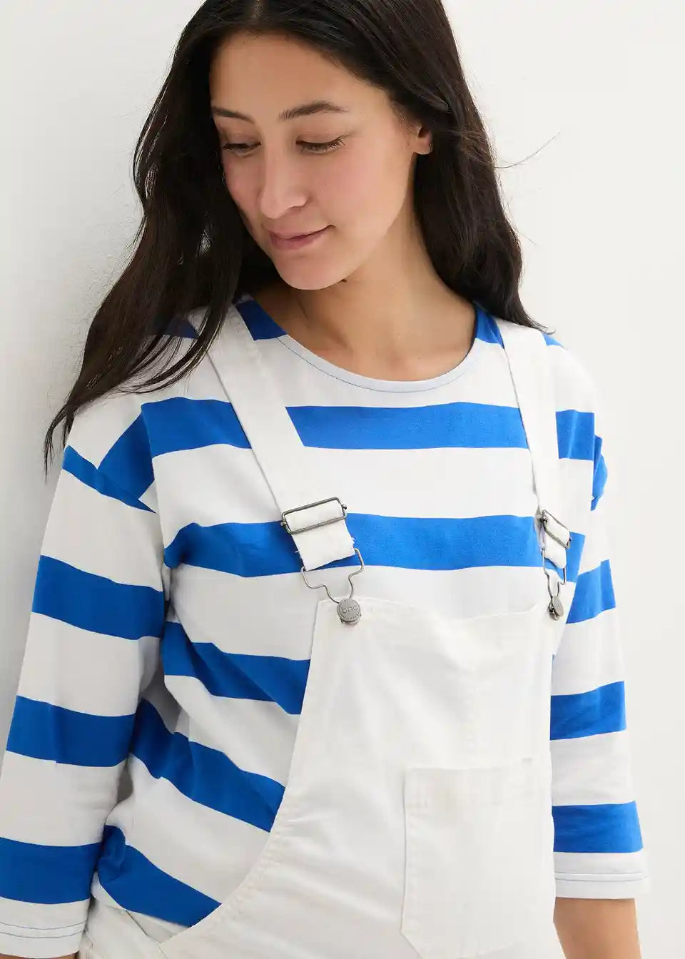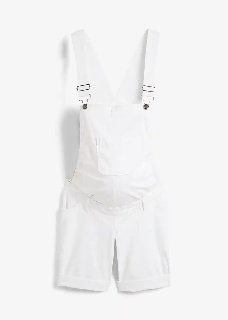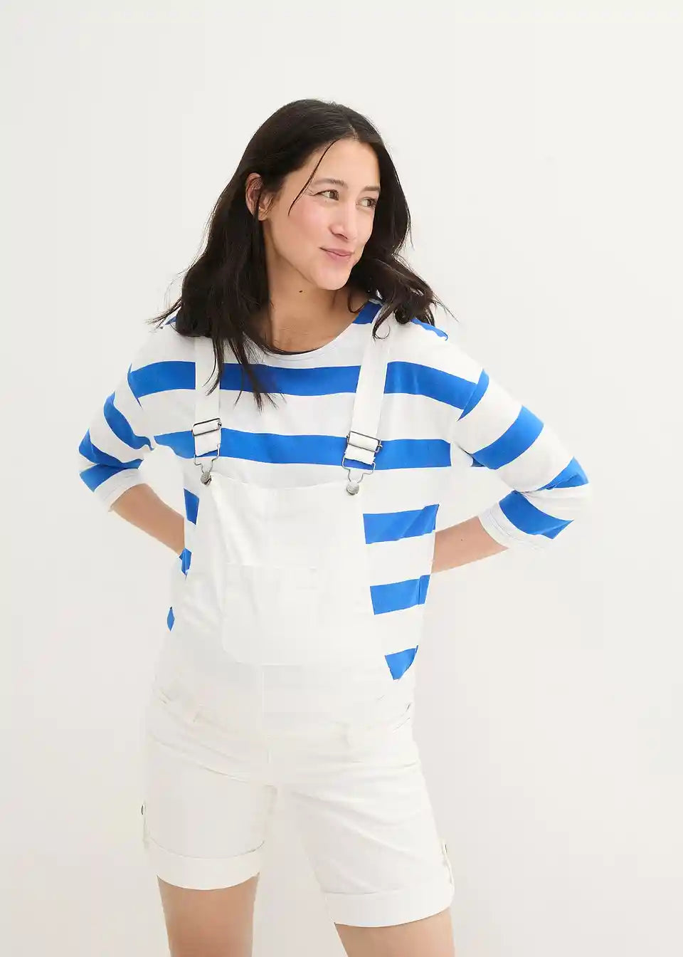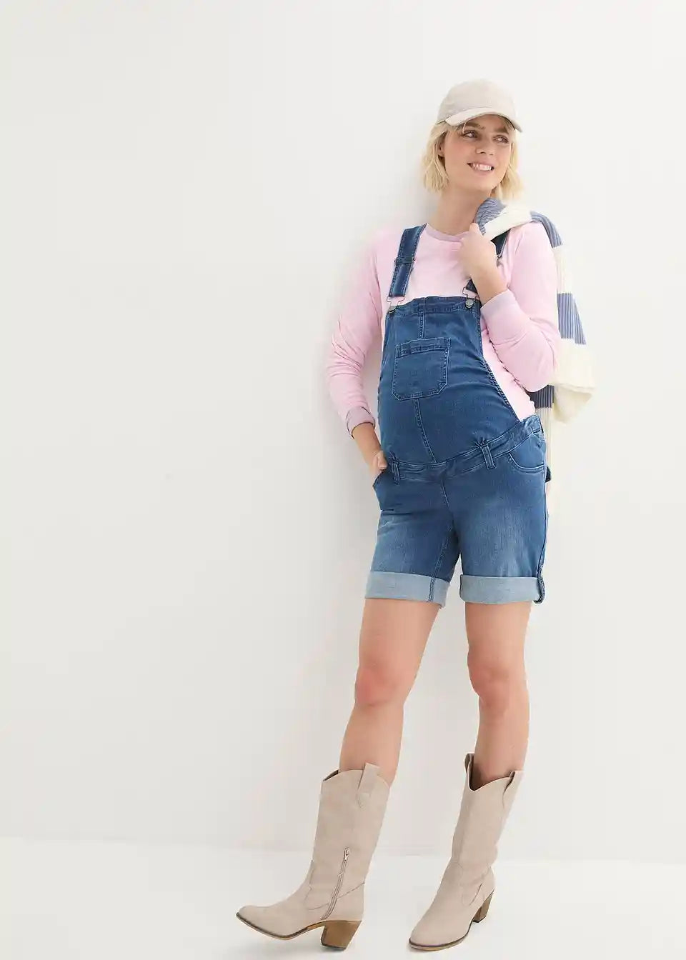 Ovaj traper šorc za trudnice s podesivim naramenicama pruža veliki komfor za trudnice. Fleksibilan umetak na bokovima pruža dovoljno prostora za rastući trbuh i osigurava udobno prianjanje tijekom cijele trudnoće. Preklopljeni nogavice traper kombinezona opremljene su gumbom i trakom, tako da se dužina nogavica može individualno prilagoditi. Klasični džepovi nalaze se sprijeda ispod pojasa i na tregerima, dok straga hlače za trudnice nude praktične džepove s preklopom i kopčanjem na gumbe.