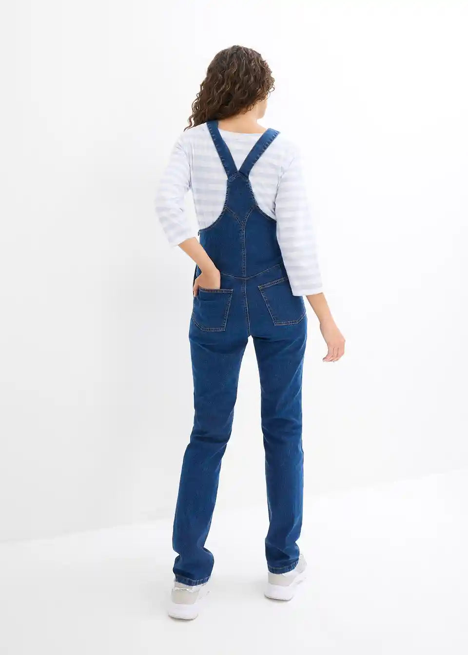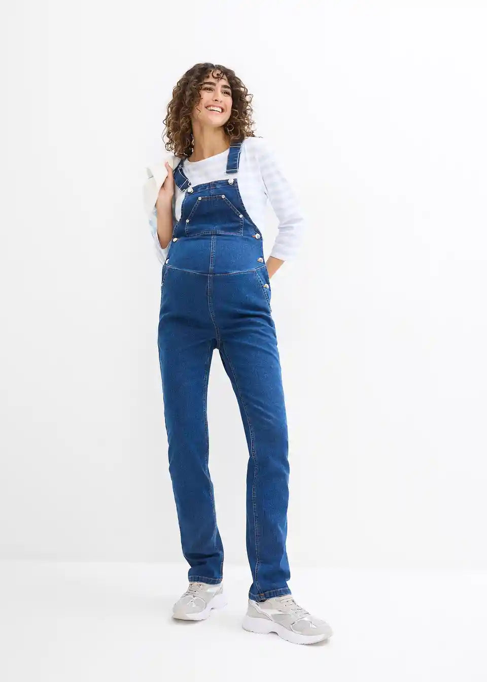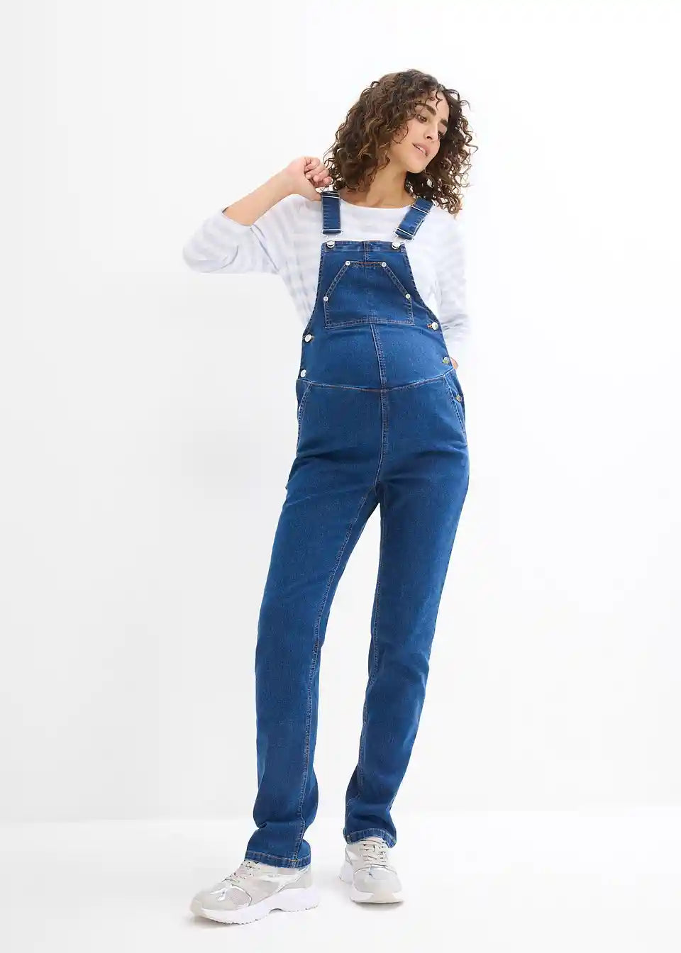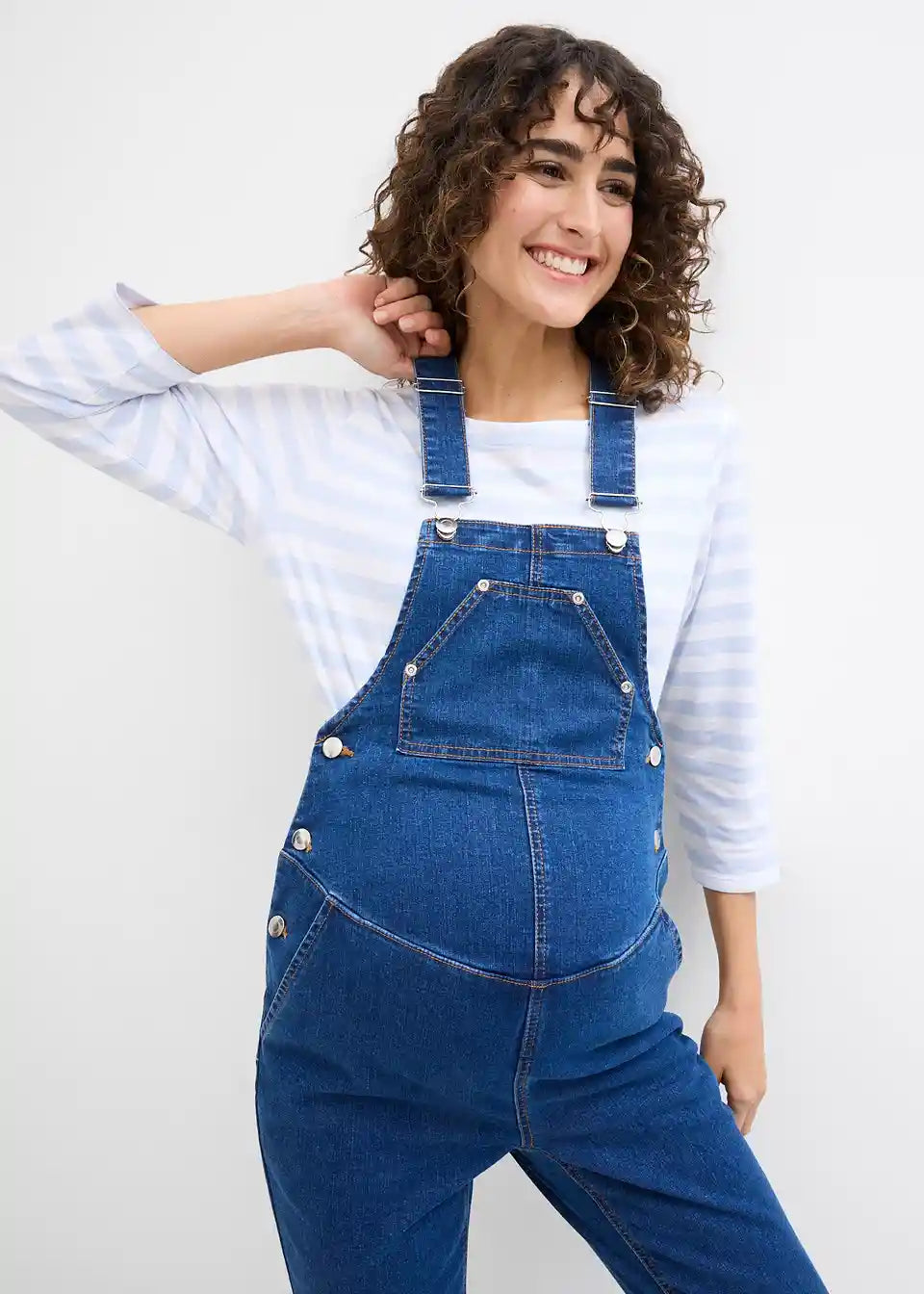 Trudničke jeans tregerice od mekog rastezljivog trapera imaju moderne i praktične džepove na prsima, sa strane i na stražnjem dijelu. Podesivi bočni umetci omogućuju prilagodbu trbušnom obujmu. Također, naramenice se mogu udobno podesiti po duljini.
