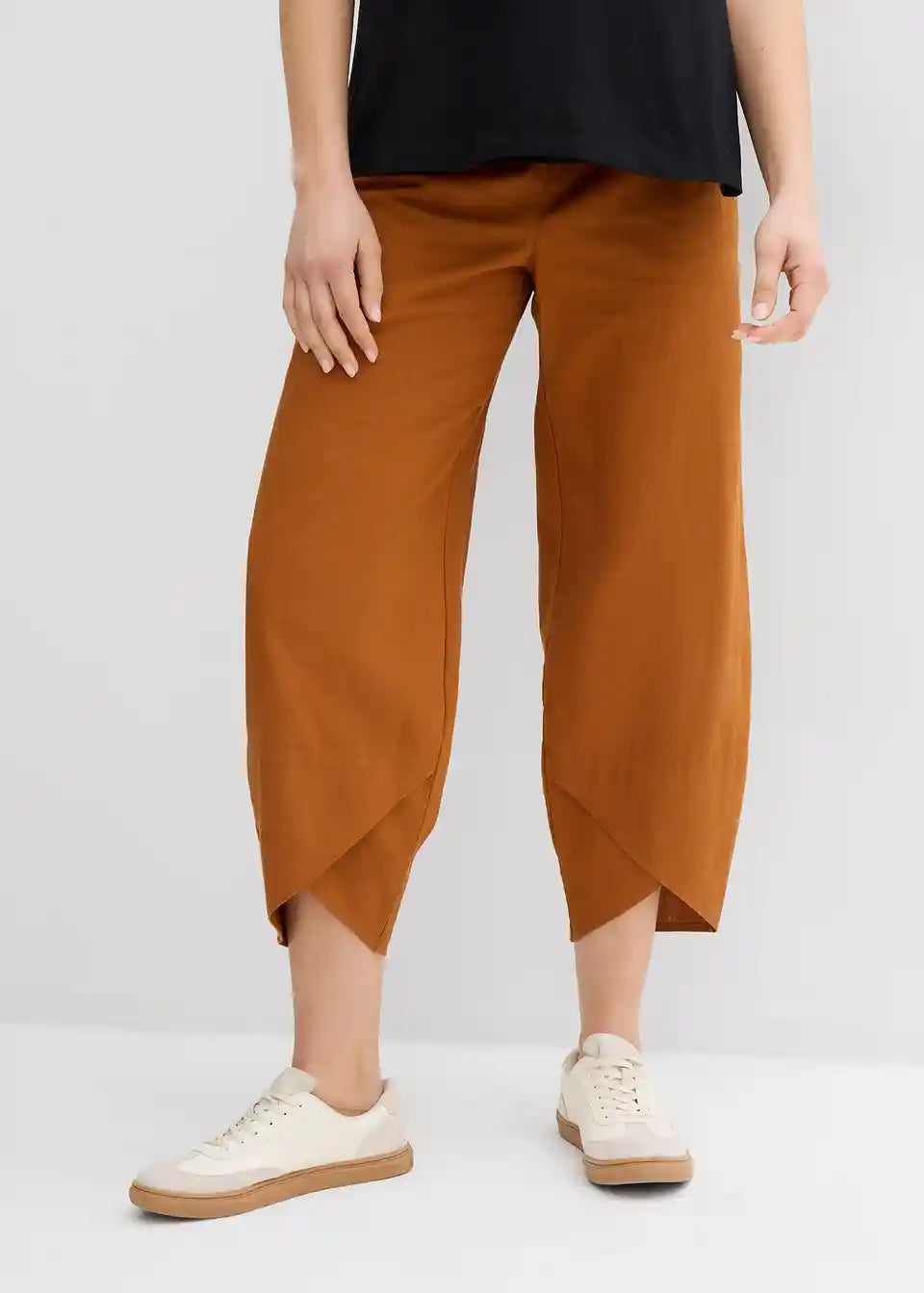 Udobne trudničke hlače s praktičnim bočnim džepovima u 7/8 dužini od prozračne mješavine lana i pamuka. Materijal pruža ugodno osvježenje u toplim danima, dok opušteni kroj omogućuje veliku slobodu kretanja. Široki, ušiveni pojas od Jerseya s malo elastana osigurava optimalno prianjanje na trbuhu.