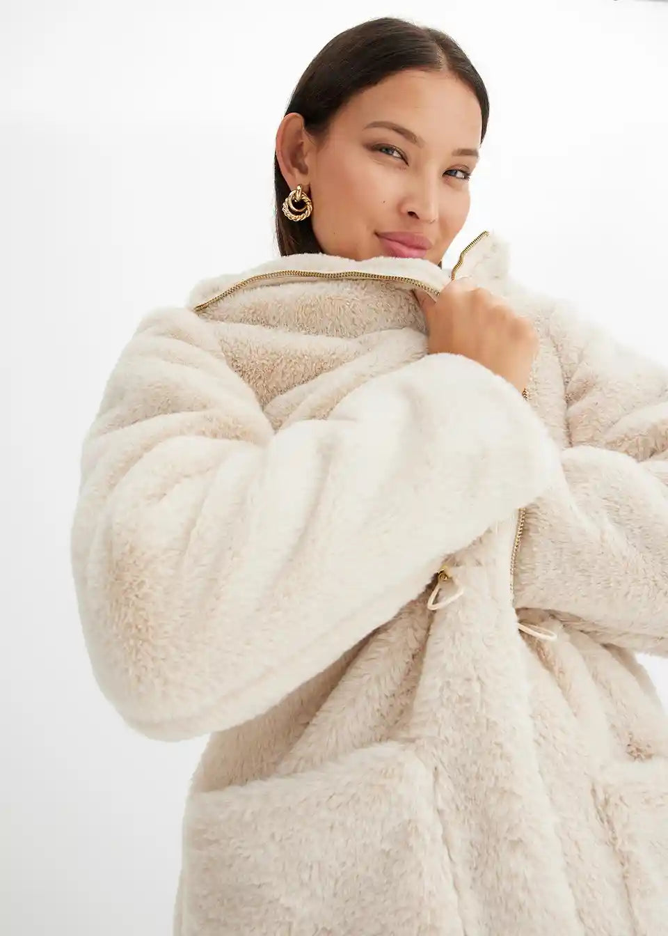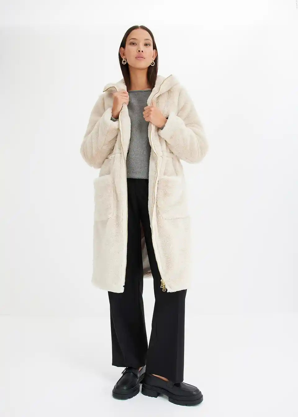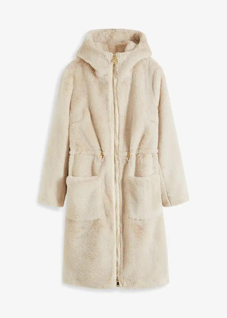 Udoban zimski kaput od tkanine nalik plišu s velikim džepovima i kapuljačom