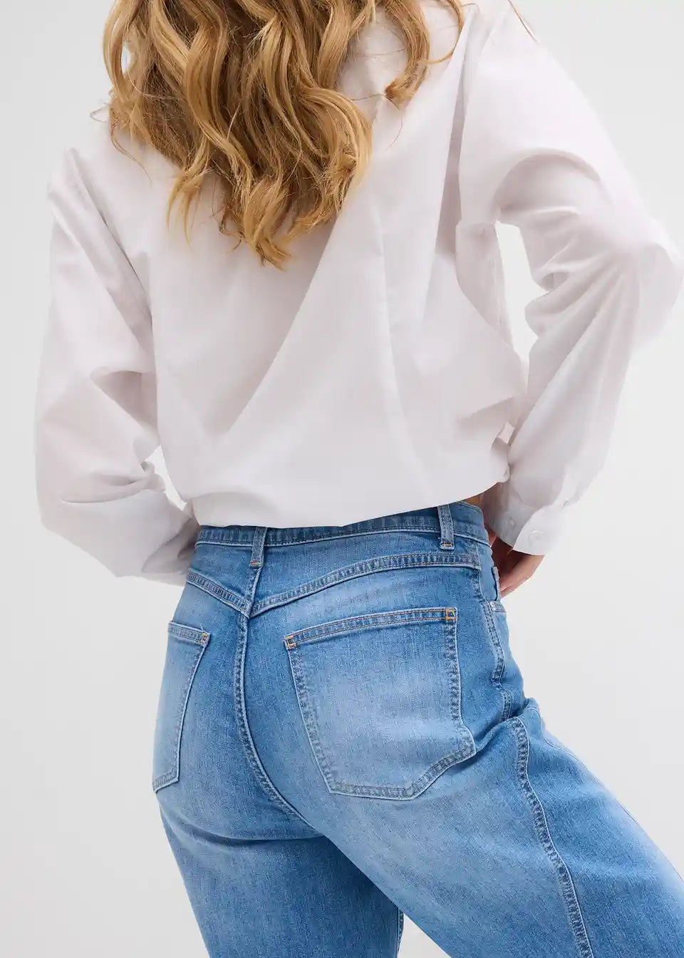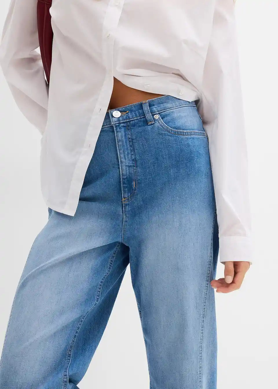 Ležeran kroj s voluminoznom, zaobljenom nogavicom od bokova do bedara i uskim krojem prema dolje.