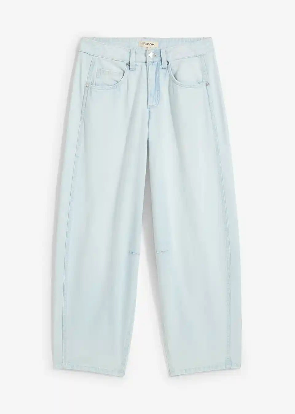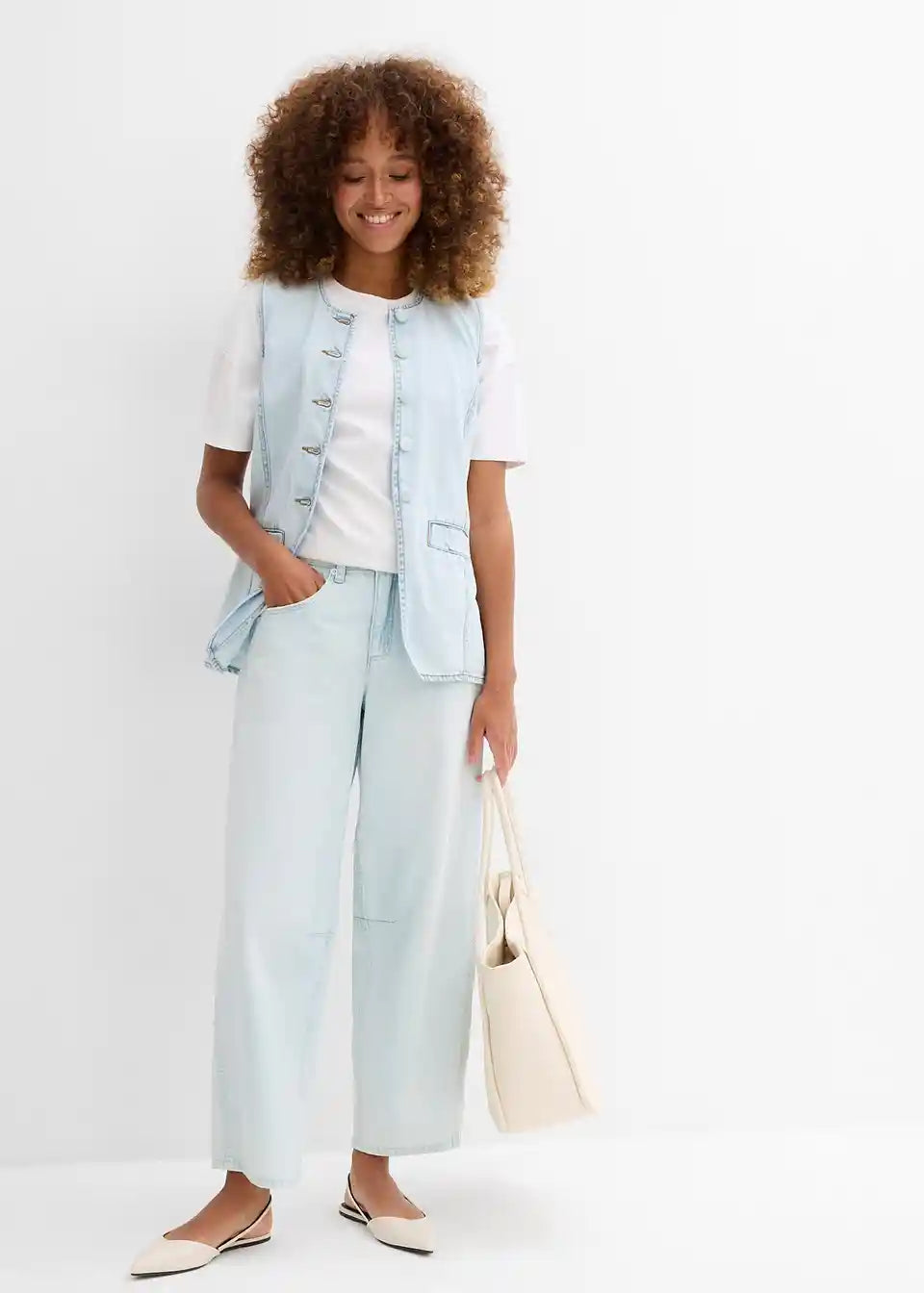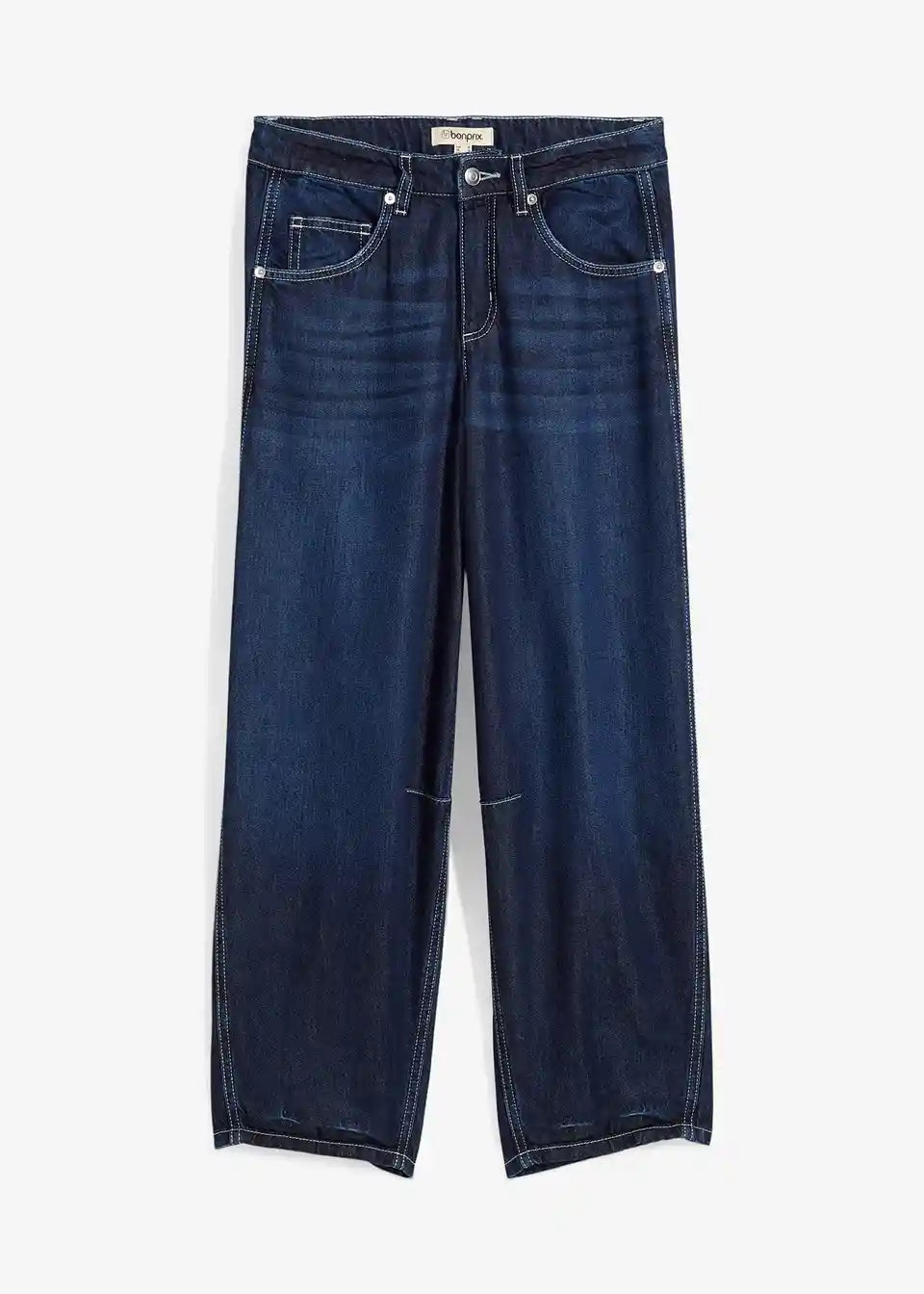 5-džepne traperice od izuzetno laganog low stretch trapera. Ležeran kroj s voluminoznim, zaobljenim nogavicama od bokova do bedara i sužavanjem prema dolje. Srednje visoki struk i skraćena nogavica. Unutarnja duljina nogavice u veličini 42 cca 70,5 cm, perivo u perilici