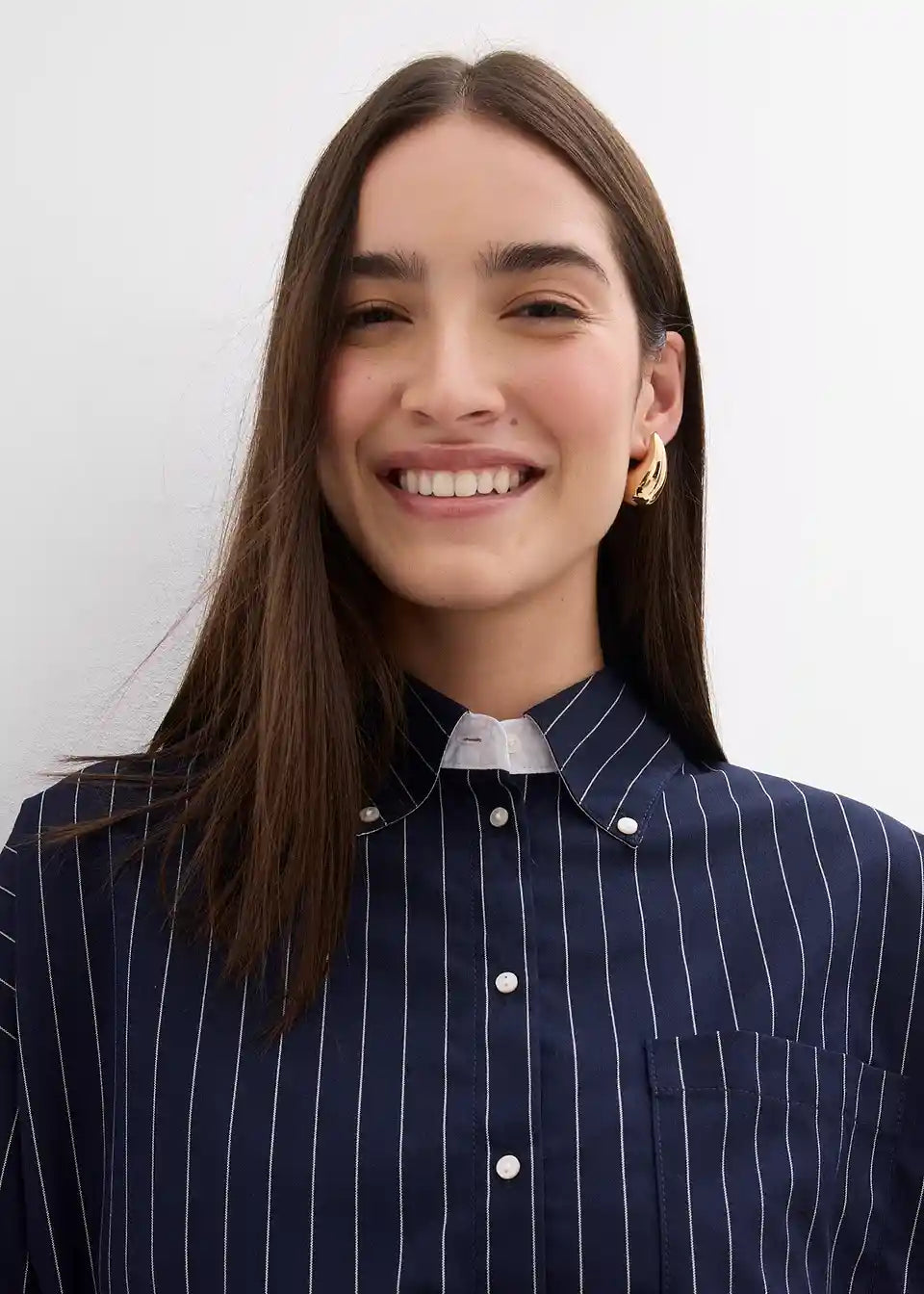 Oversized bluza s ovratnikom, gumbima sprijeda i otvorenim džepom na prsima. Dugi rukavi s kontrastnim manžetama na gumbe.