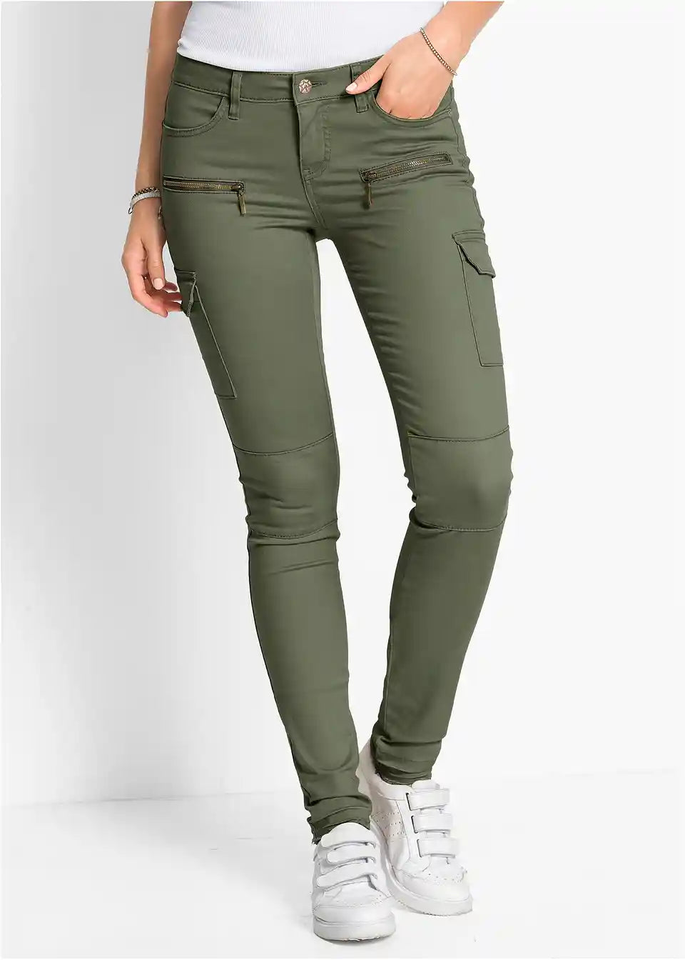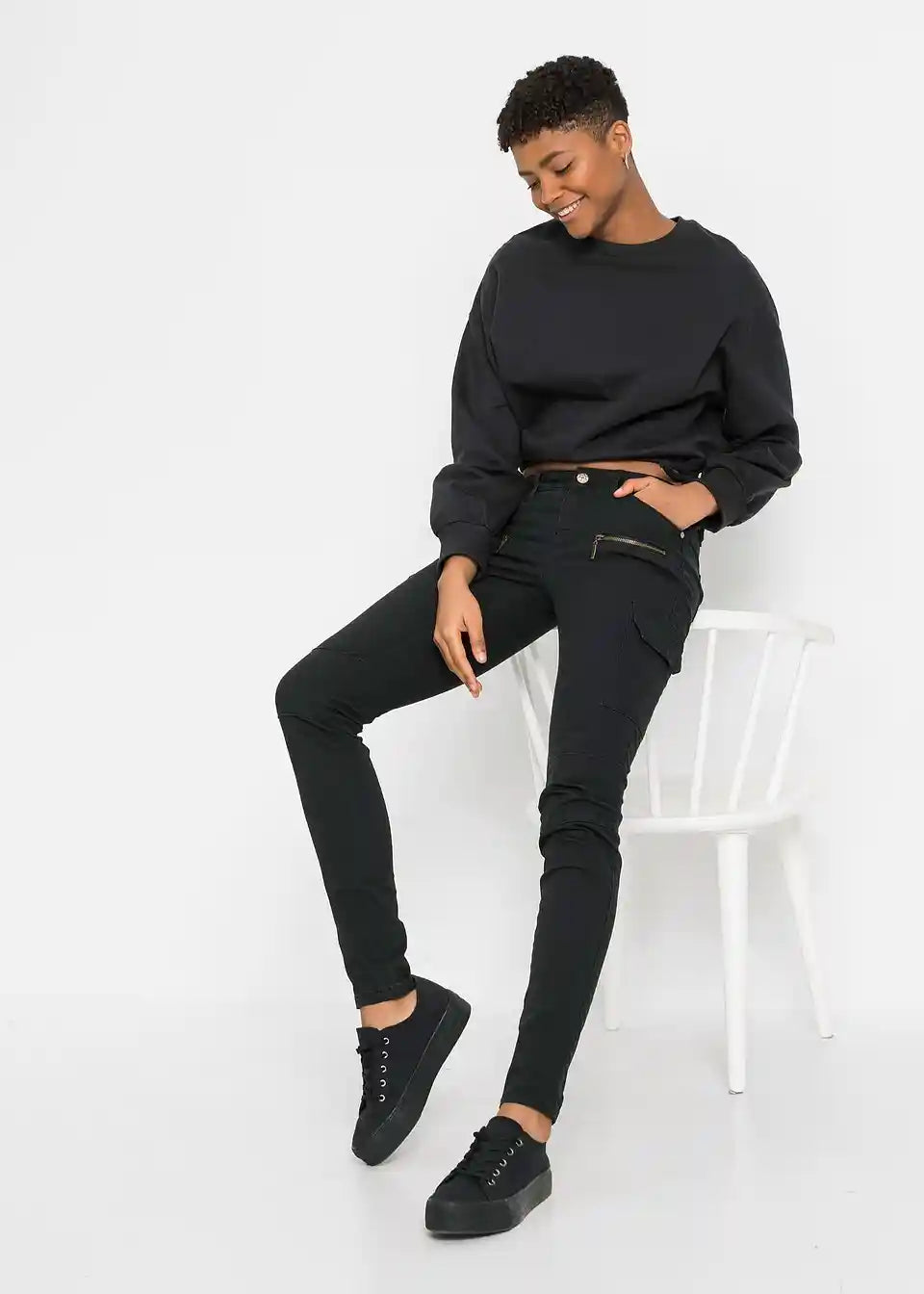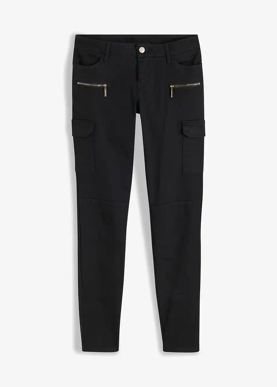 Trendovske Cargo hlače Skinny pravi su fashion hit za opuštene outfite. Našiveni džep sa strane izgleda ležerno, a kroj koji prati liniju tijela odgovara aktualnom izgledu. Ispod dva bočna ukoso rezana džepa, dva detalja s patentnim zatvaračem daju moderan naglasak. Za lagani izgled pristaju uz Cargo hlače jednostavna majica i tenisice ili čizme.