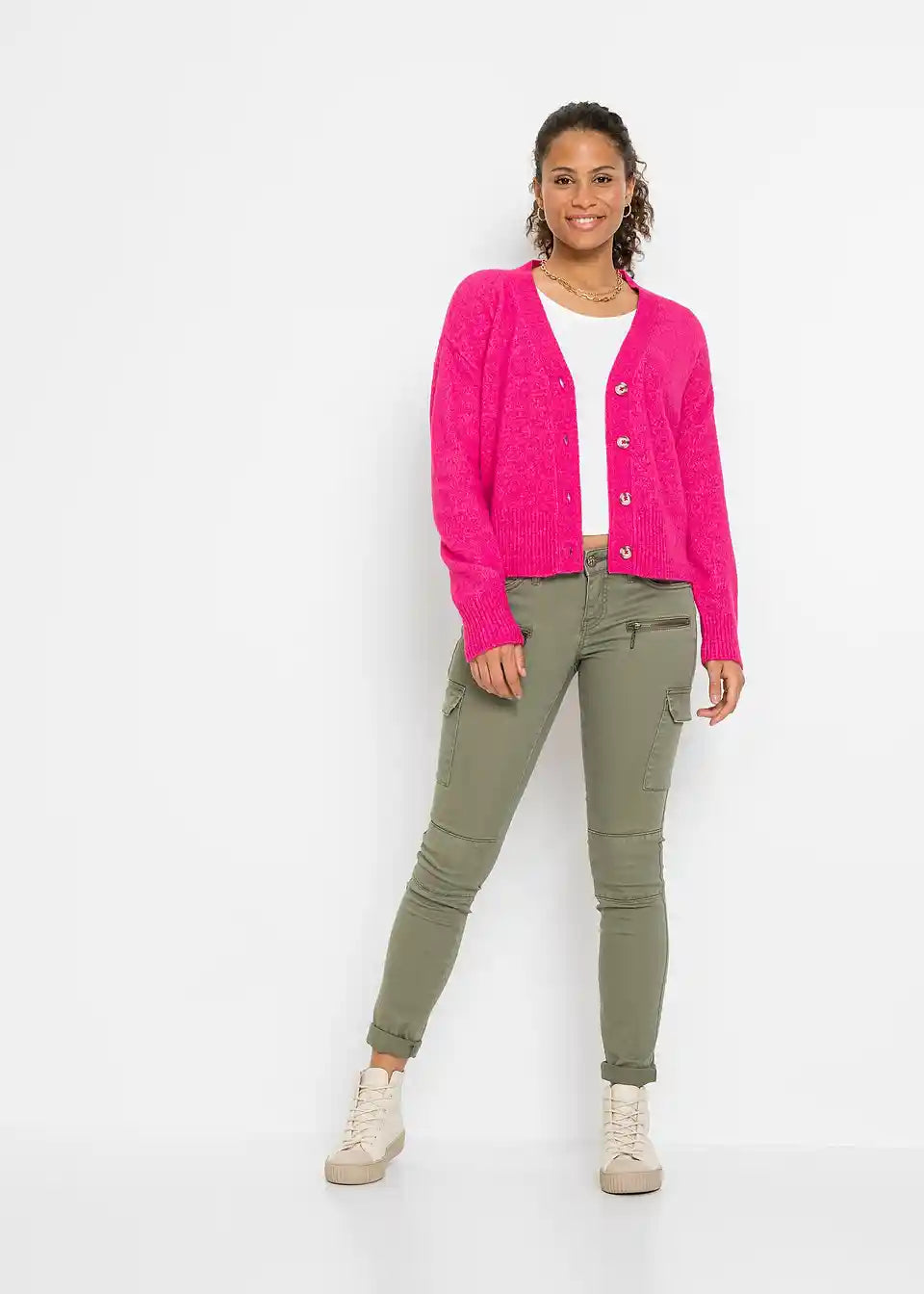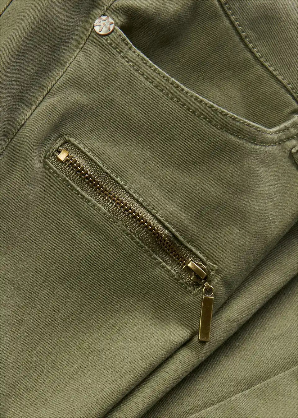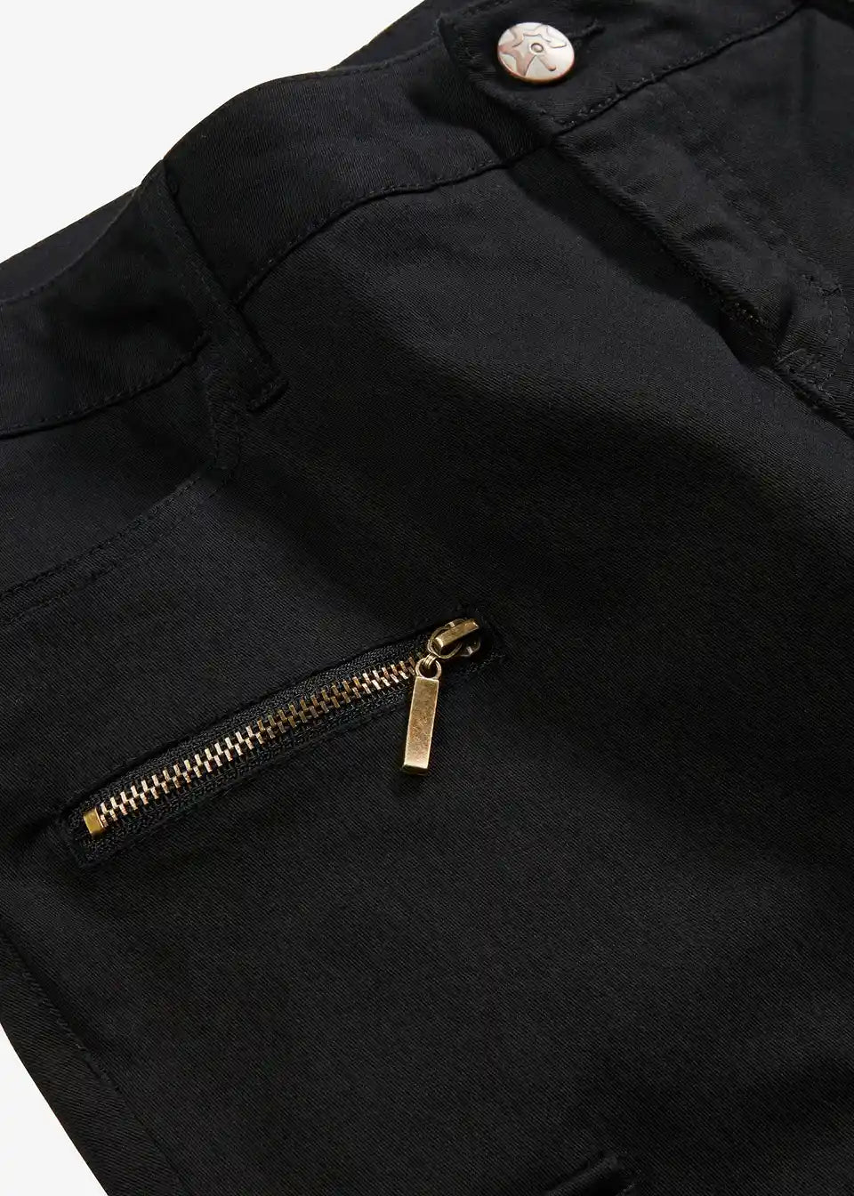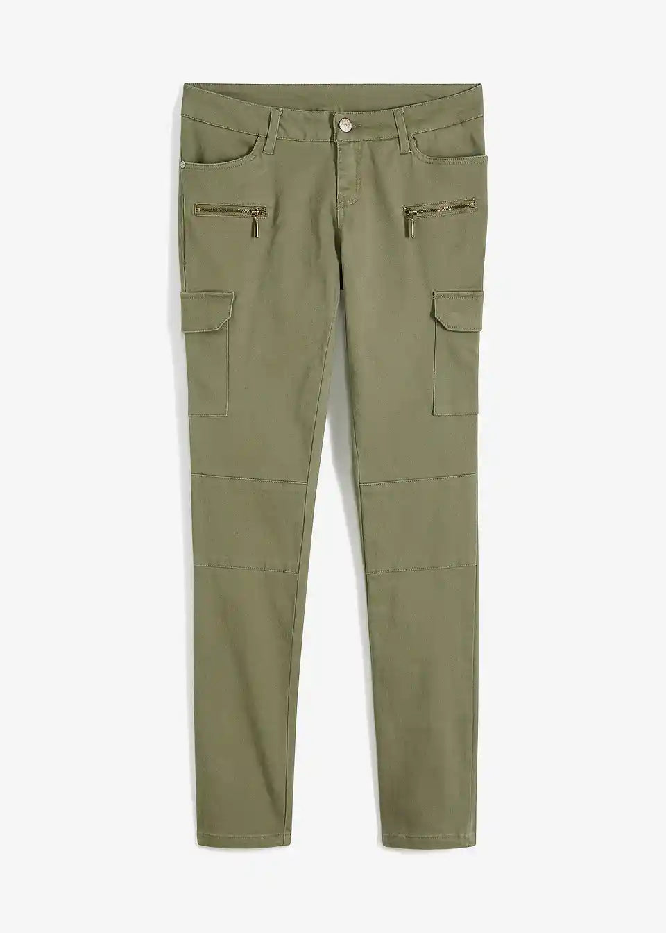 Trendovske Cargo hlače Skinny pravi su fashion hit za opuštene outfite. Našiveni džep sa strane izgleda ležerno, a kroj koji prati liniju tijela odgovara aktualnom izgledu. Ispod dva bočna ukoso rezana džepa, dva detalja s patentnim zatvaračem daju moderan naglasak. Za lagani izgled pristaju uz Cargo hlače jednostavna majica i tenisice ili čizme.