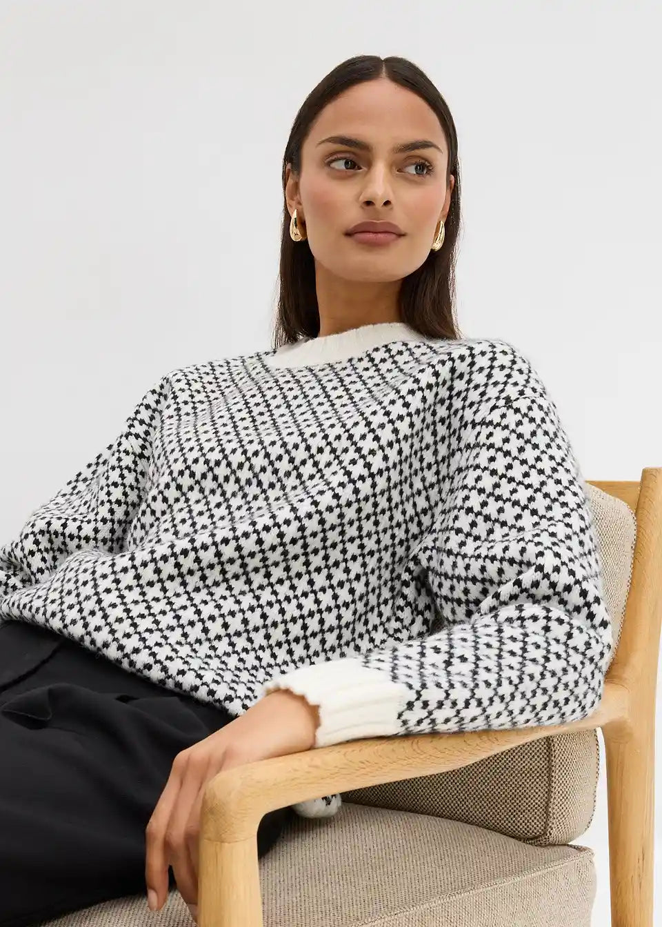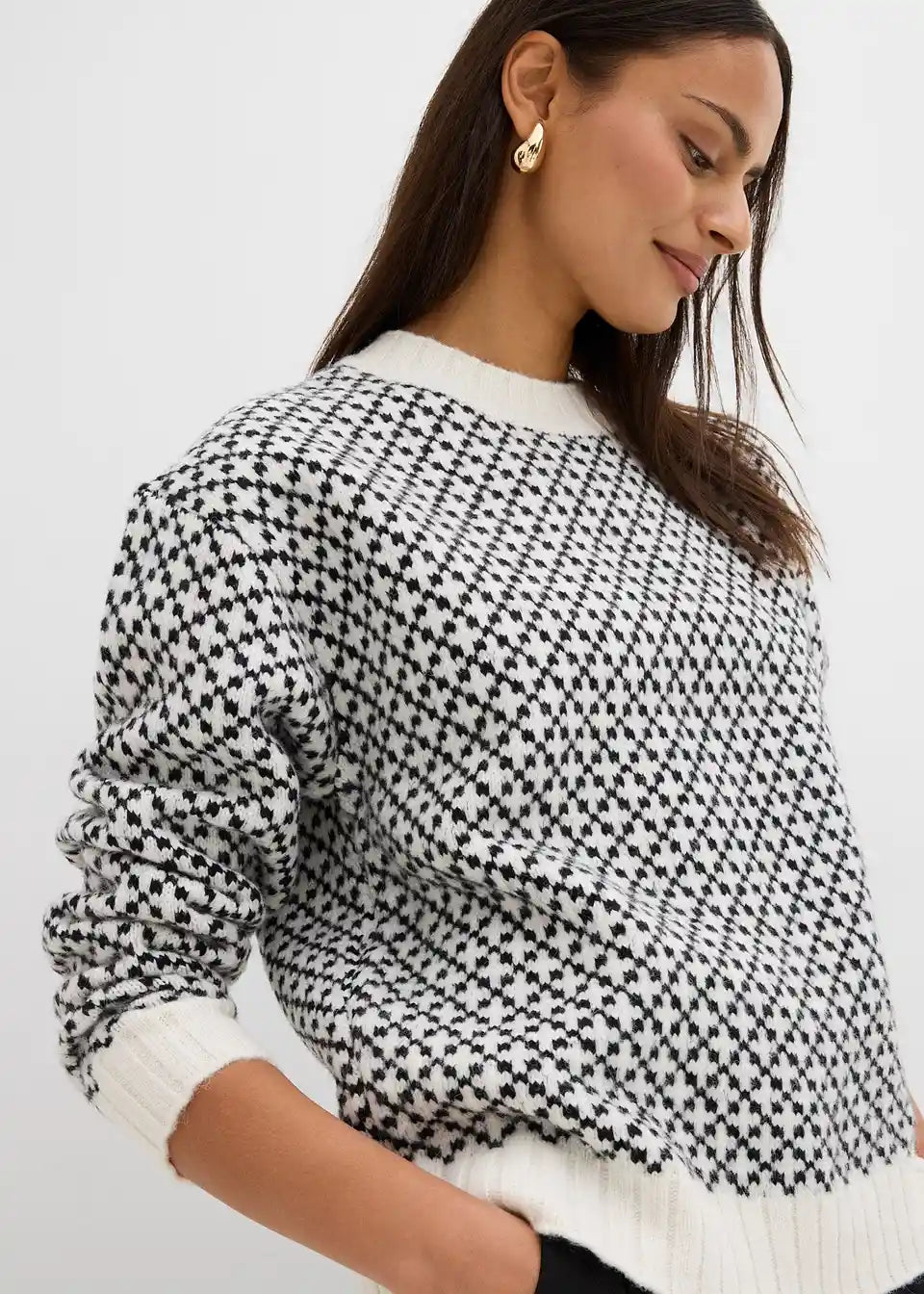 Pulover s okruglim izrezom, rebrastim završecima i ležernim krojem.