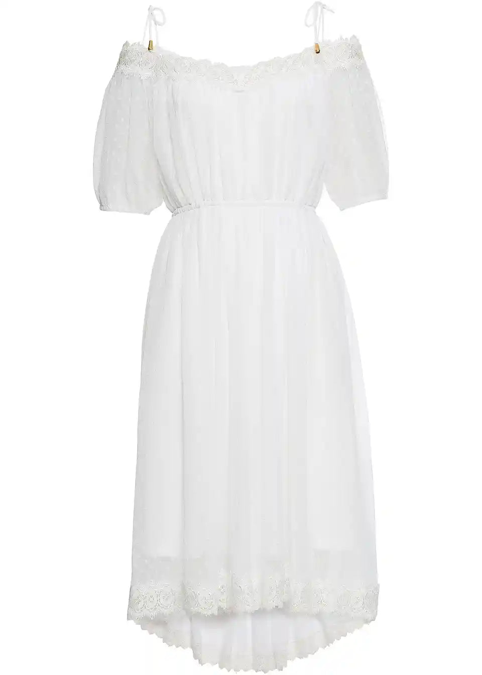 Ova zavodljiva haljina s gola ramena i čipkom spaja nekoliko aktualnih trendova u svom šarmantnom dizajnu: Elegantna midi haljina marke BODYFLIRT očarava atraktivnim Carmen izrezom i sofisticiranim Vokuhila-rubom. Diskretni šav u struku i nježne spaghetti naramenice osiguravaju dobar stajling. Dekolte i rub suknje ukrašeni su finom čipkom koja se ističe.