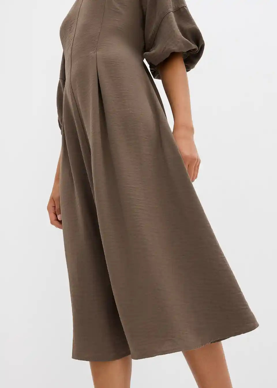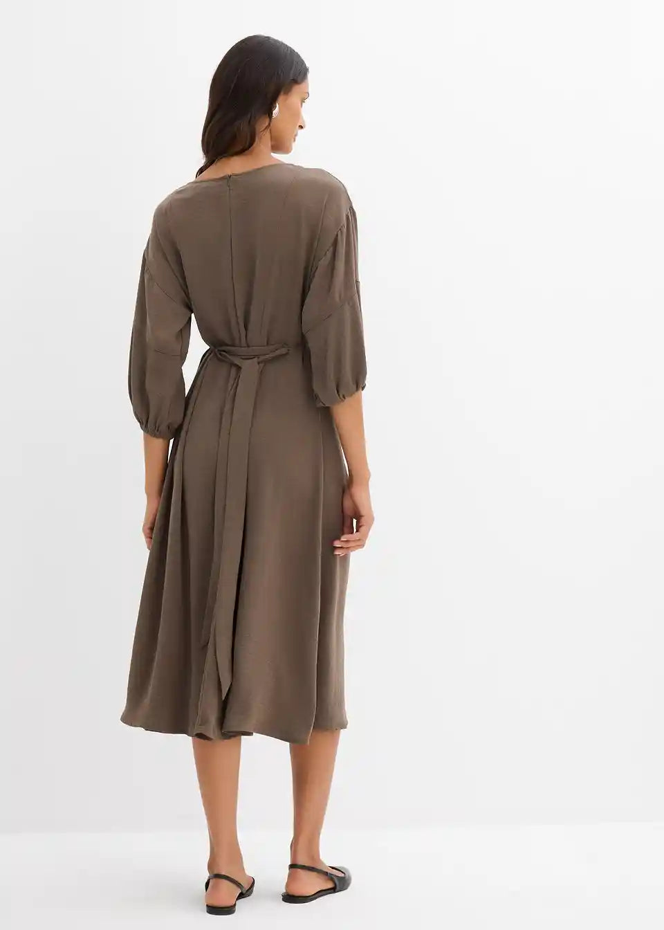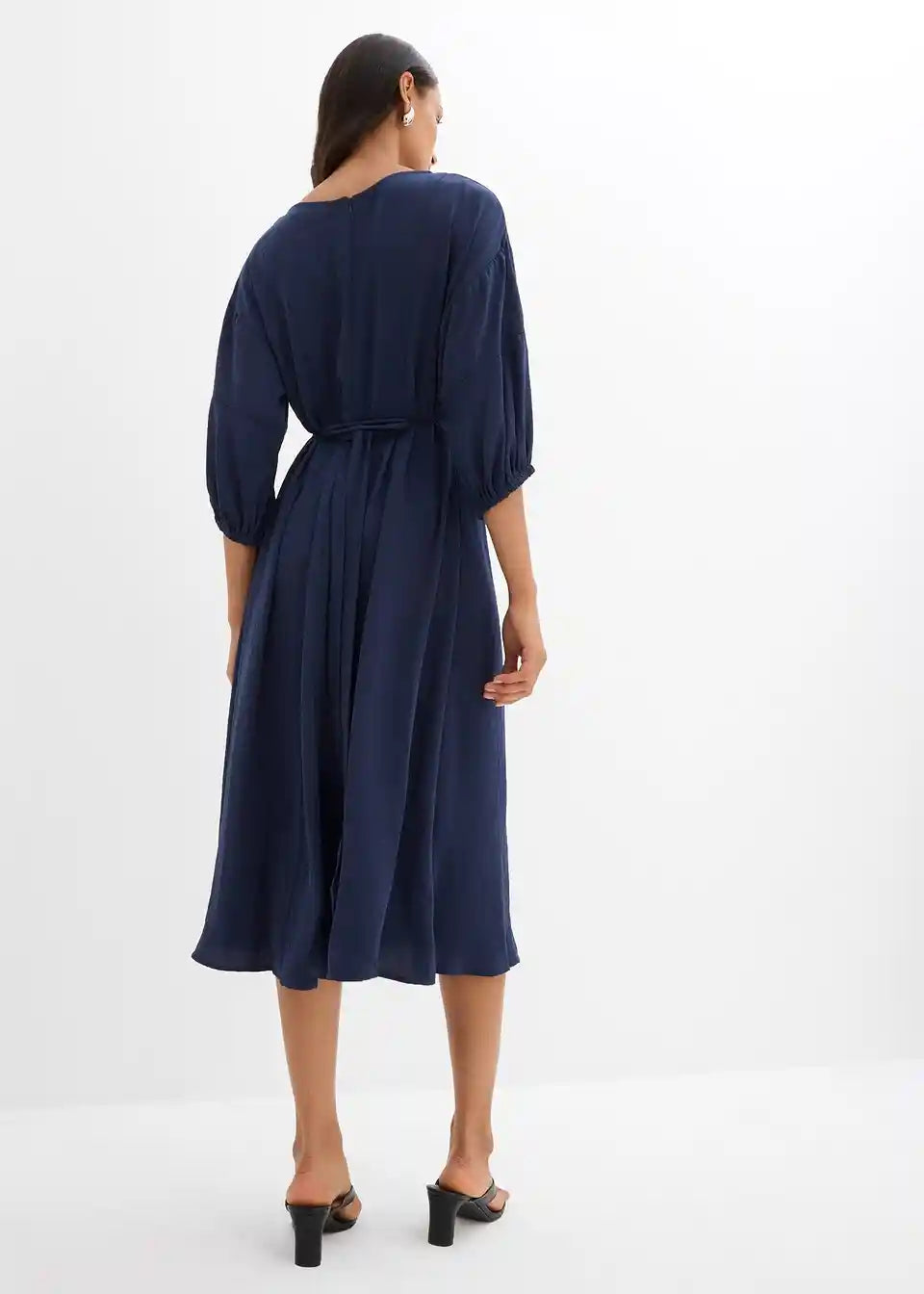 Midi-haljina od tkanine s okruglim izrezom i produženim kratkim rukavima s gumicom. U struku odvojivi remen te skriveni patentni zatvarač straga