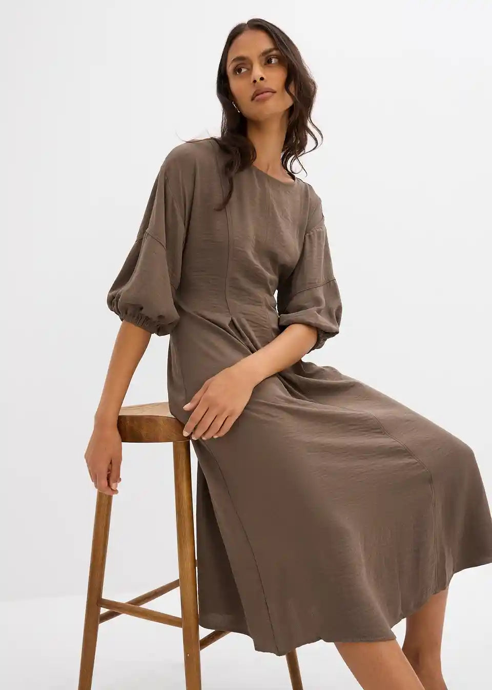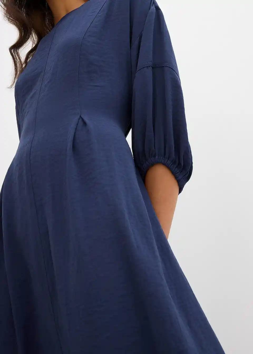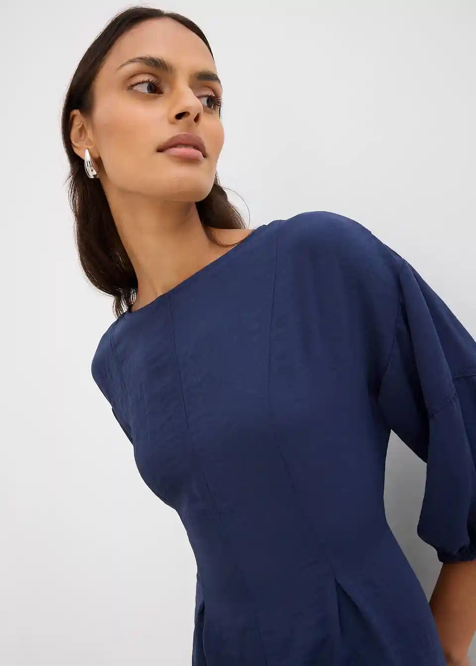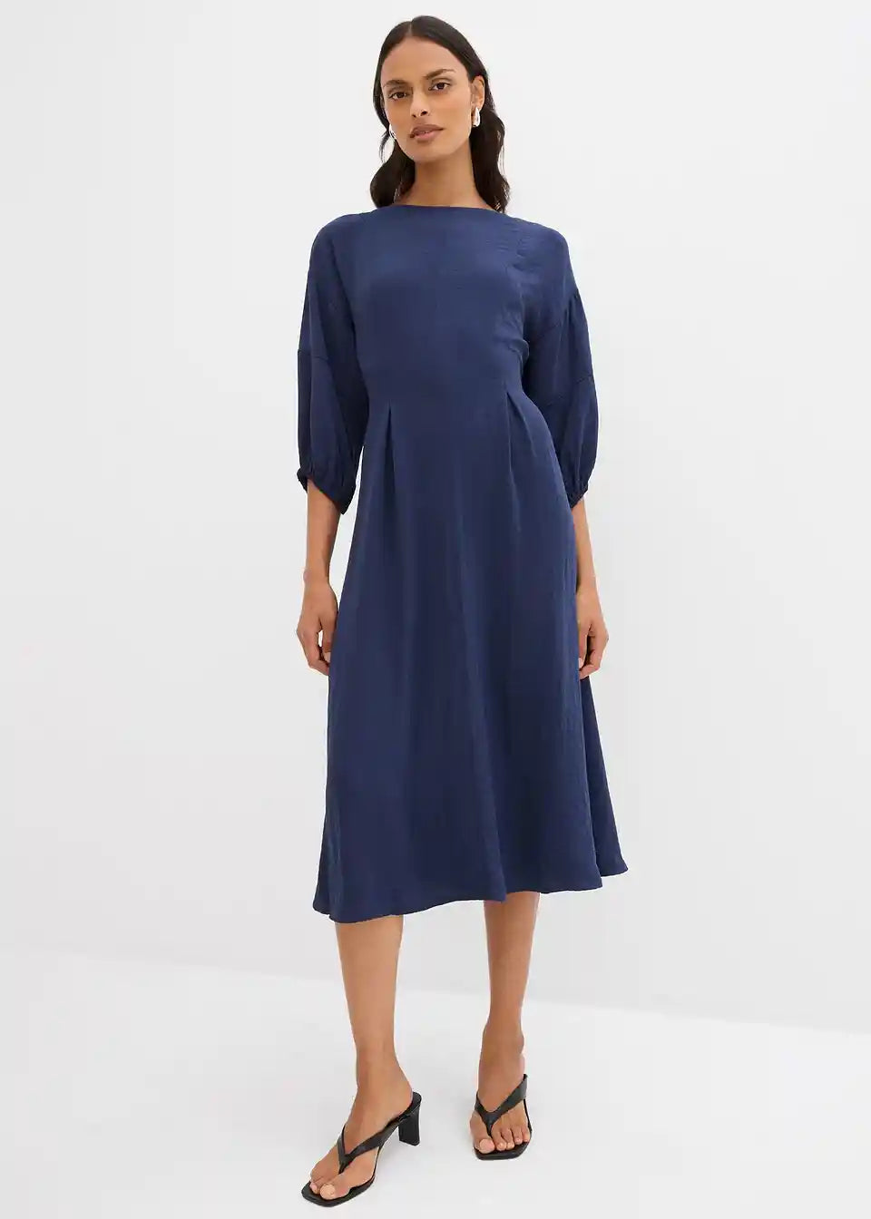 Midi-haljina od tkanine s okruglim izrezom i produženim kratkim rukavima s gumicom. U struku odvojivi remen te skriveni patentni zatvarač straga