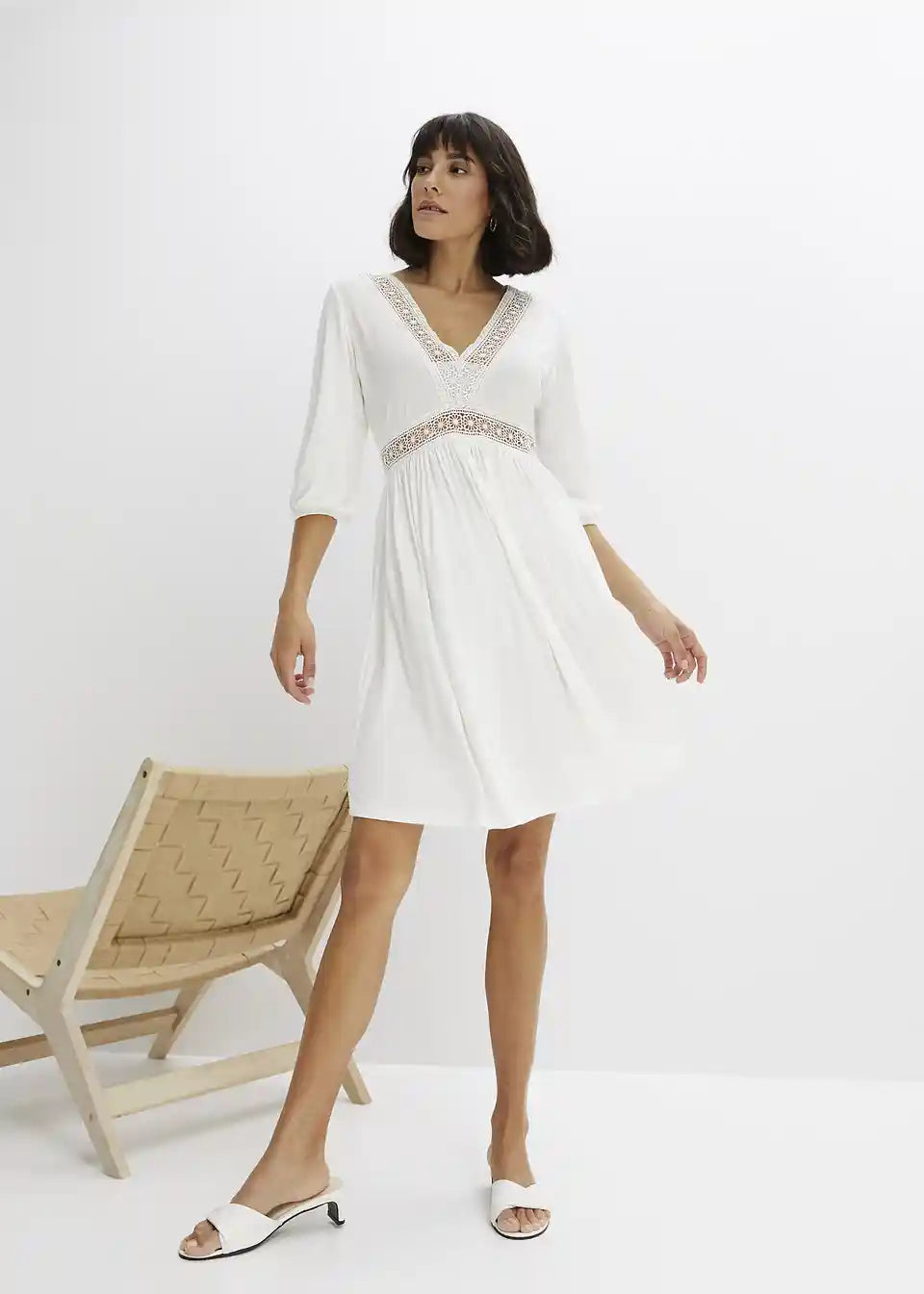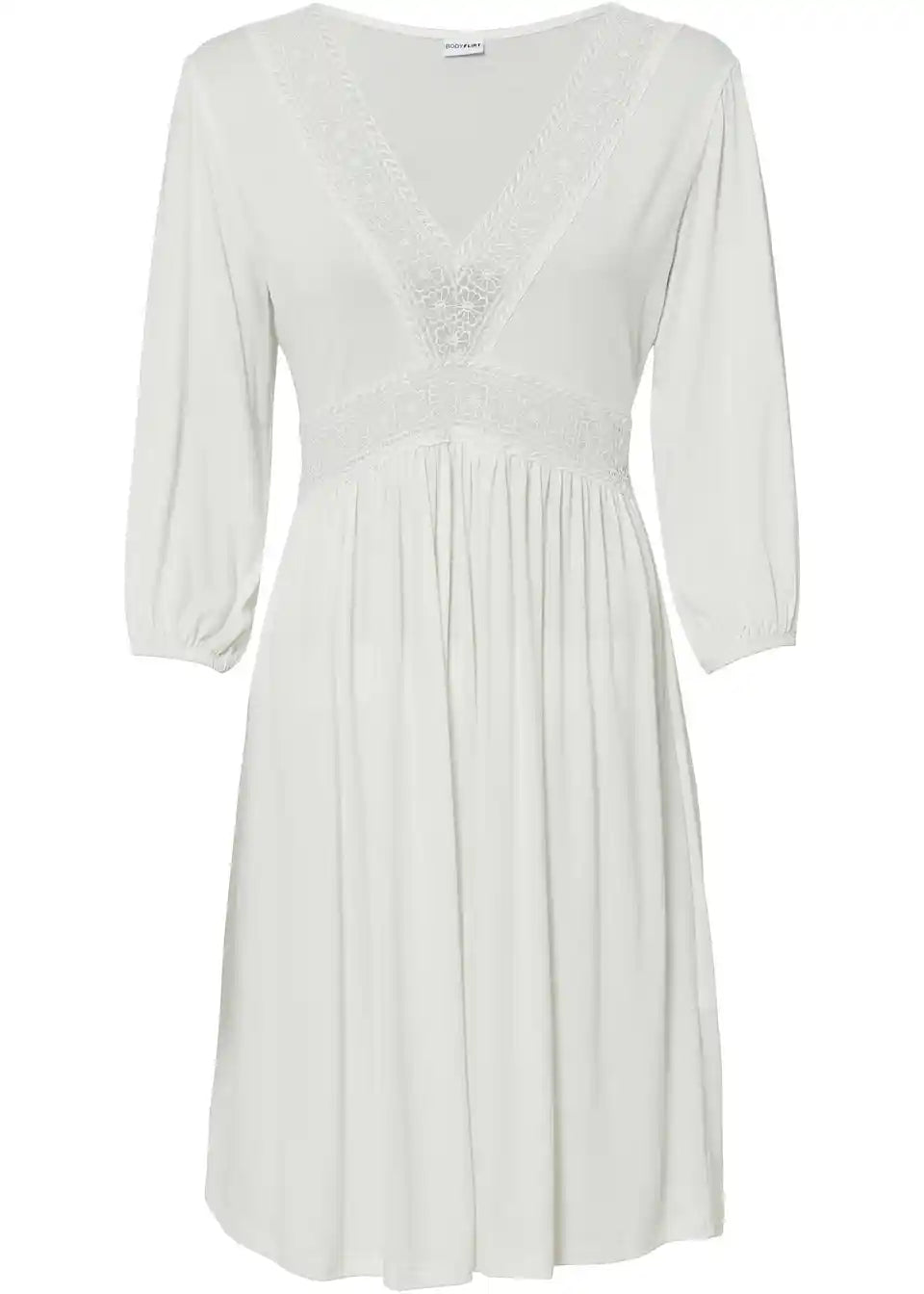 moderna haljina s dekorativnom čipkom na izrezu i sprijeda na struku.