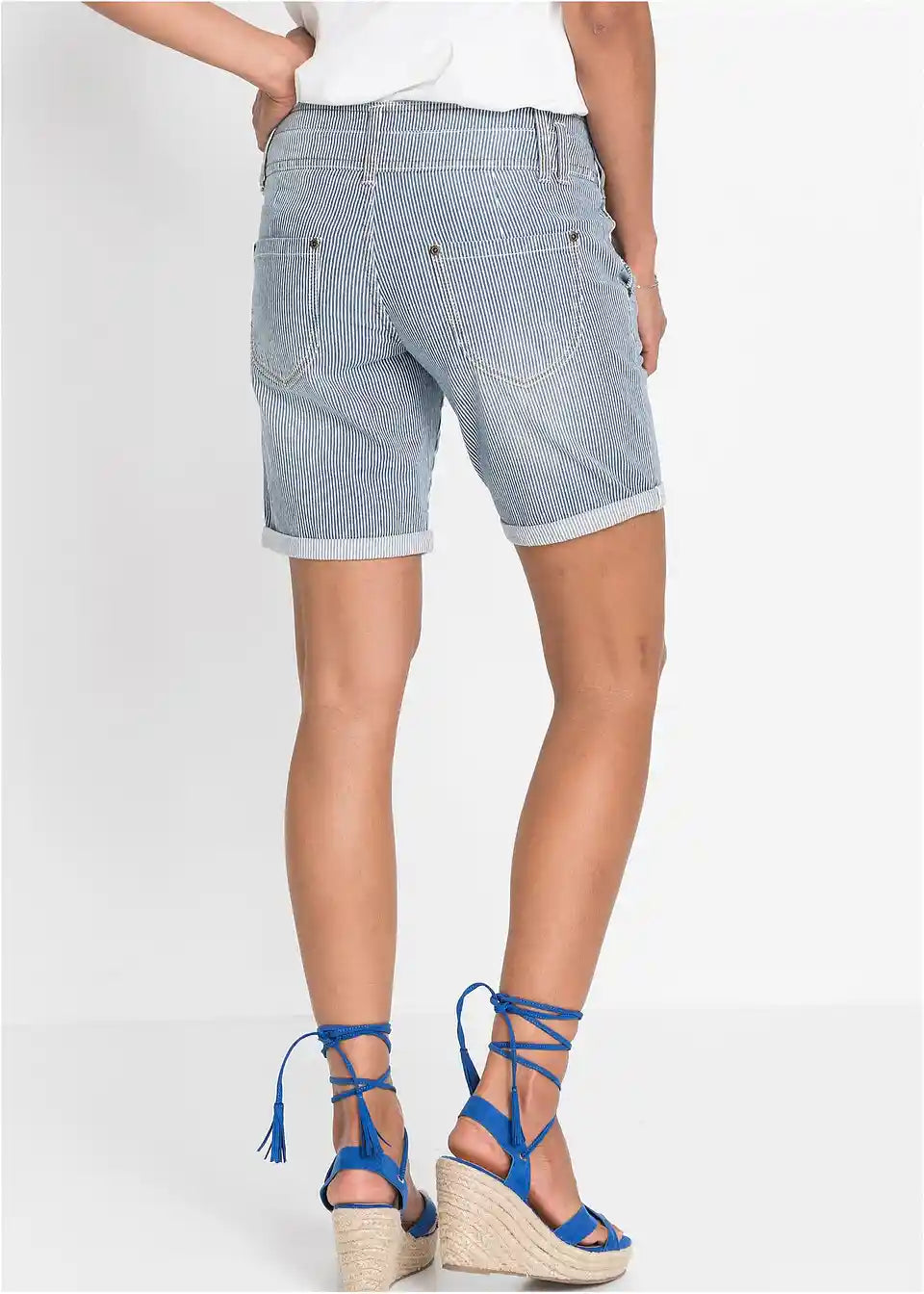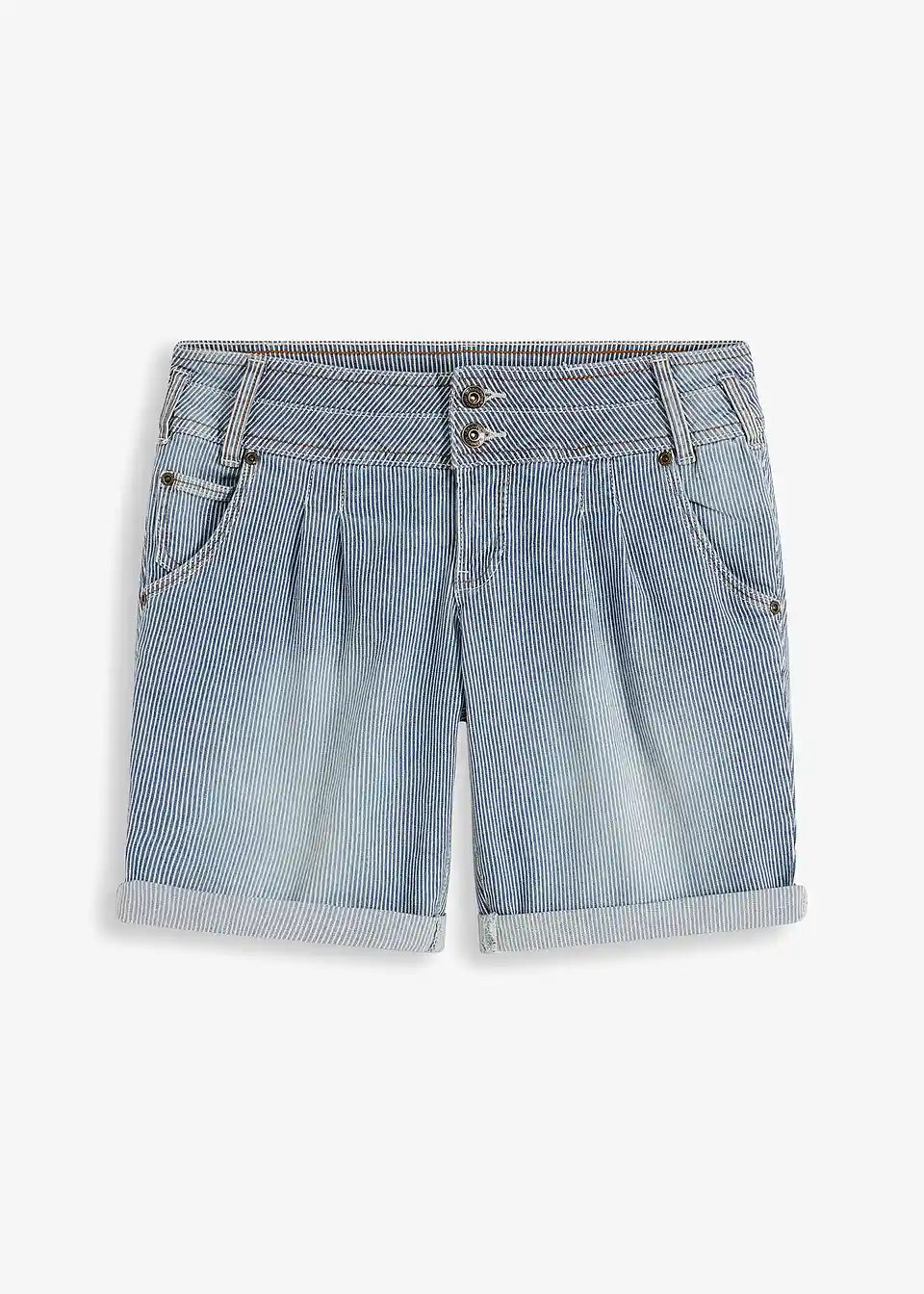 Visoki struk s dvostrukim kopčanjem u fokusu su ovih kratkih traperica. Nabori ispod struka daju poseban naglasak. Kosi džepovi u stilu chino hlača i zavrnuti rubovi upotpunjuju trendovski model s efektom iznošenosti. Jednostavan stil postiže se s rebrastim topom i natikačama. Romantična bluza s floralnim uzorkom i balerinke savršeno nadopunjuju kratke traperice.
