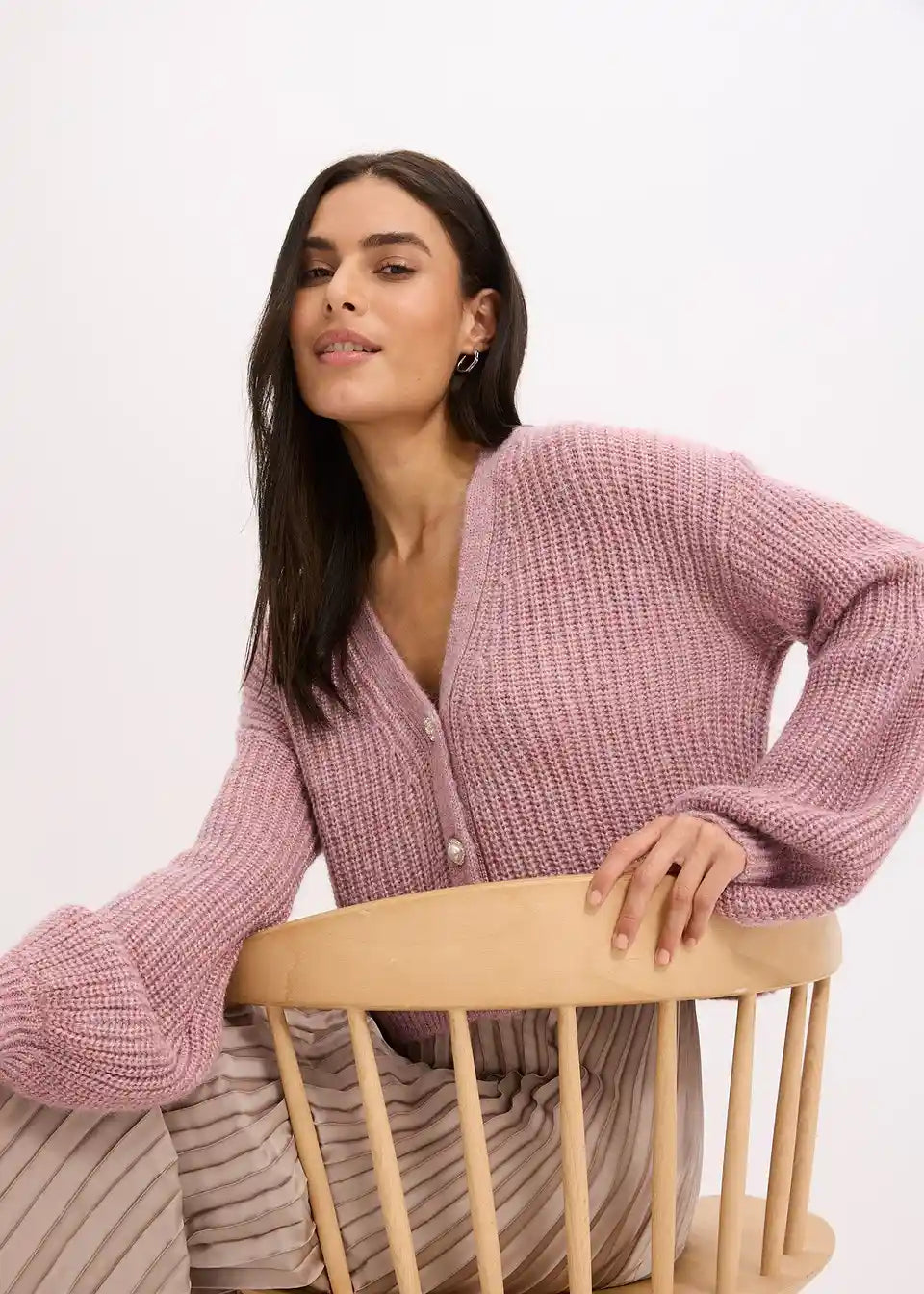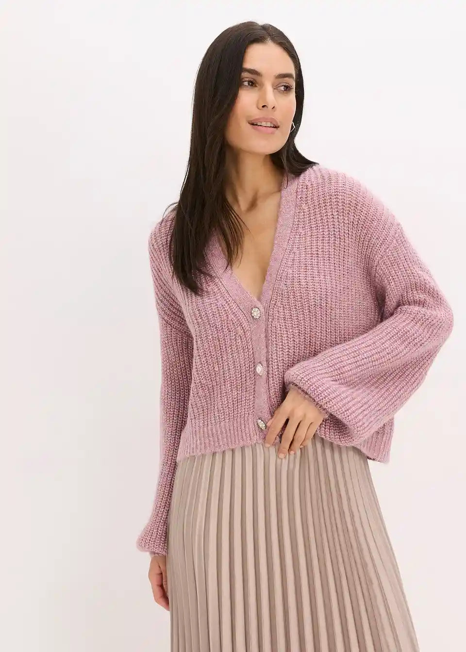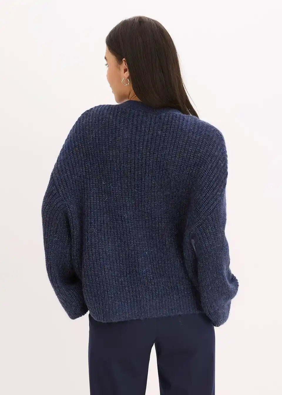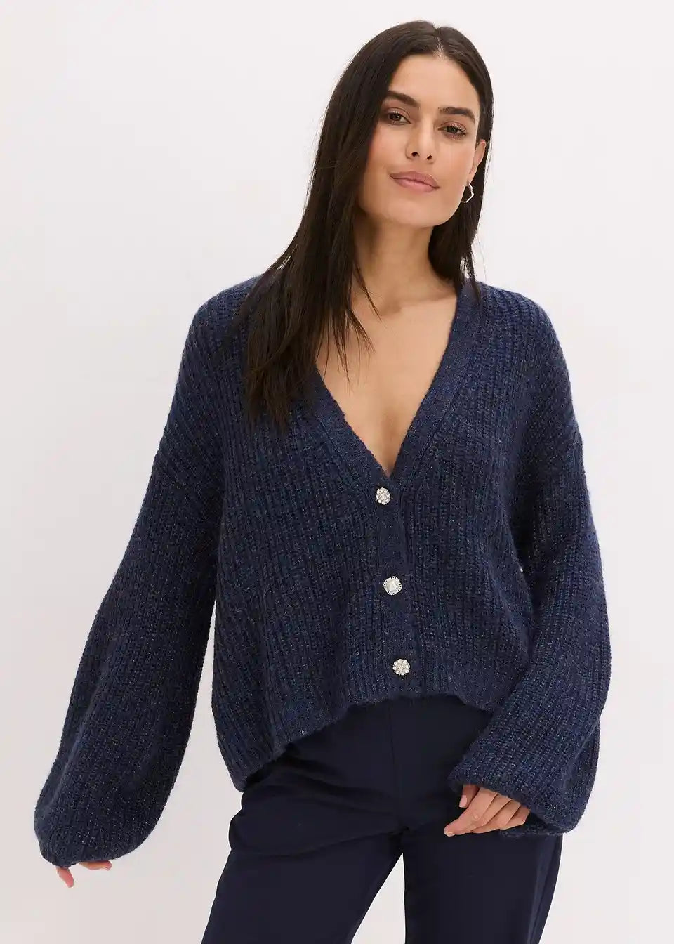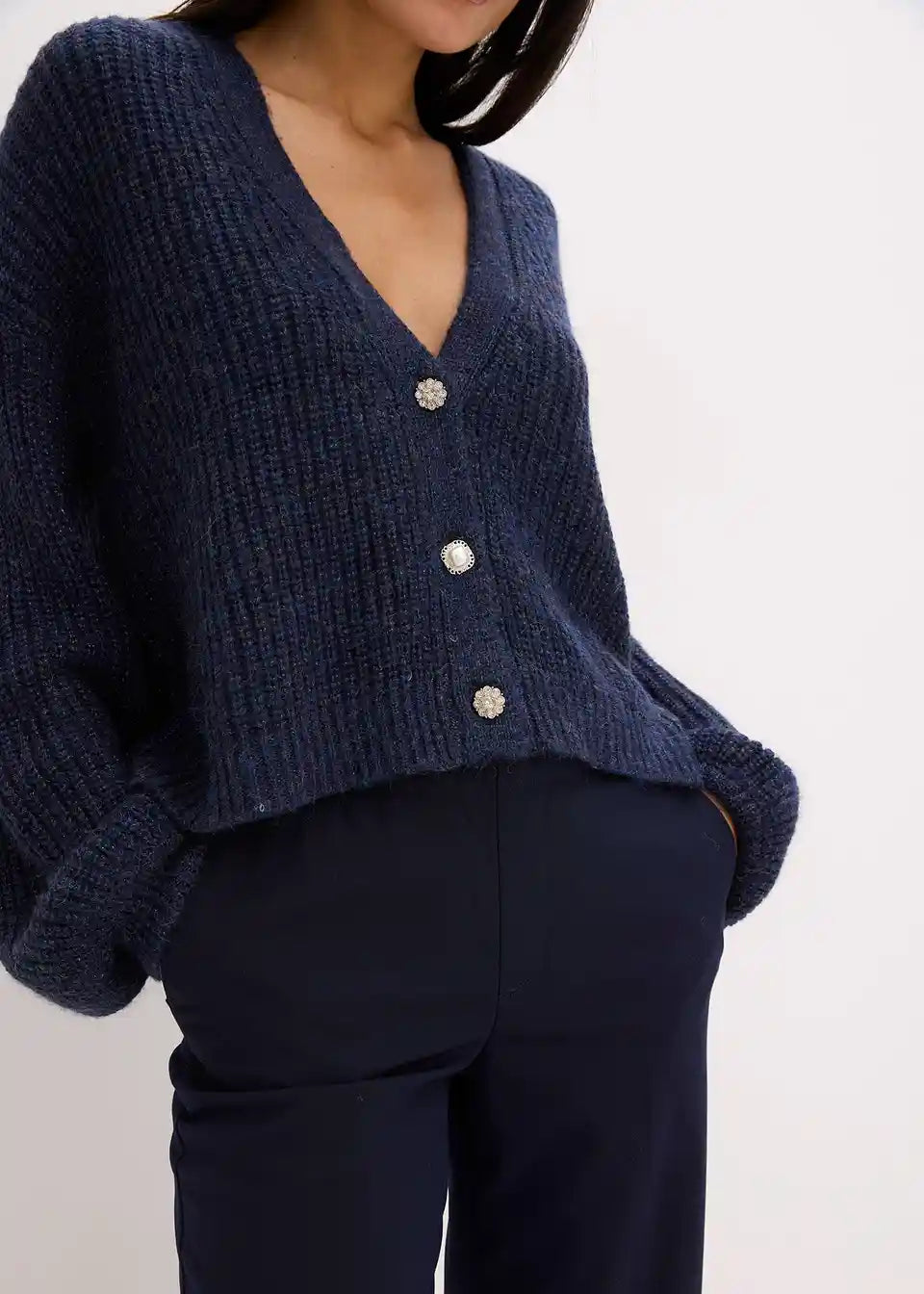 Moderno predimenzioniran kardigan od pletiva sa sjajnom pređom i udjelom vune