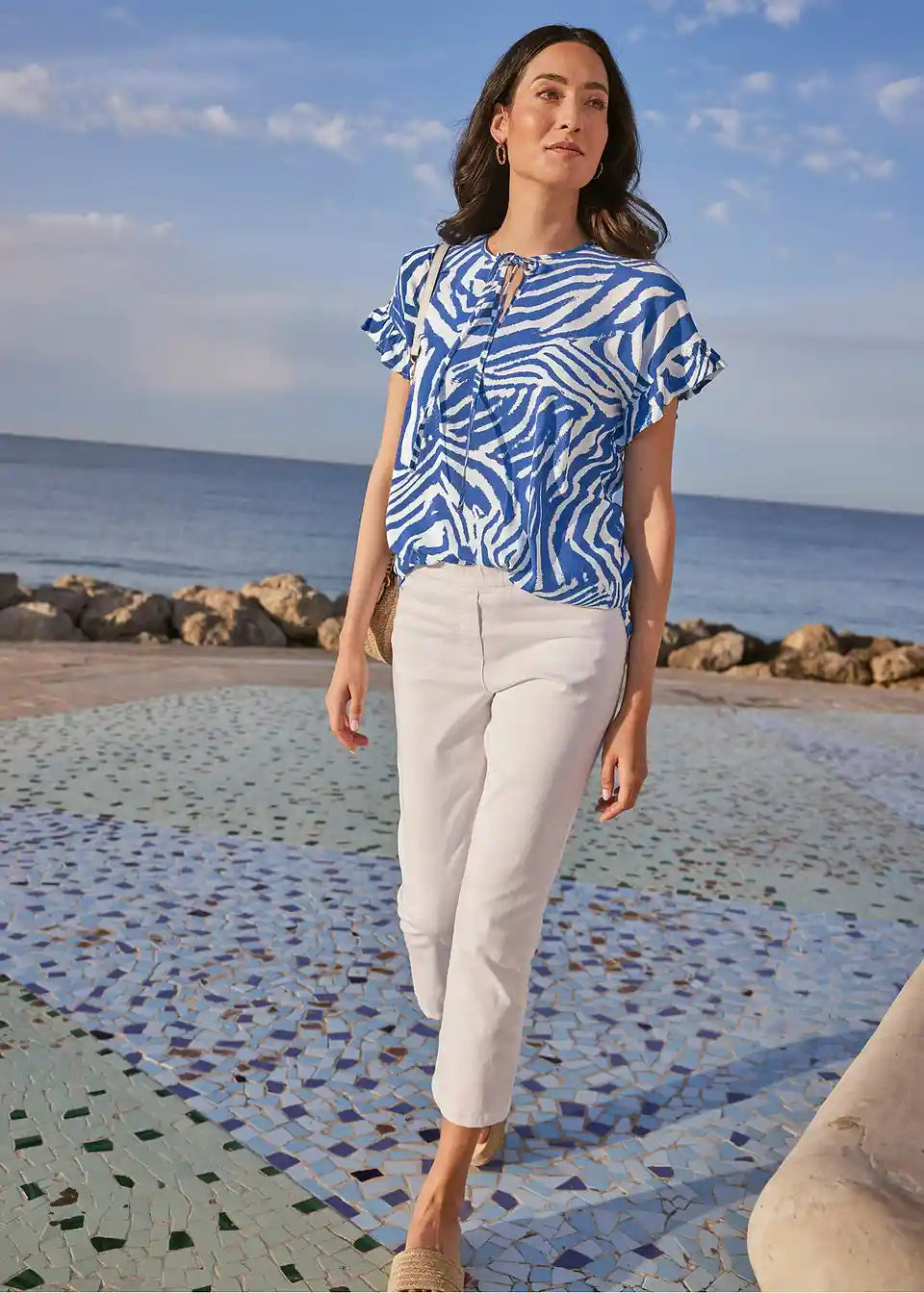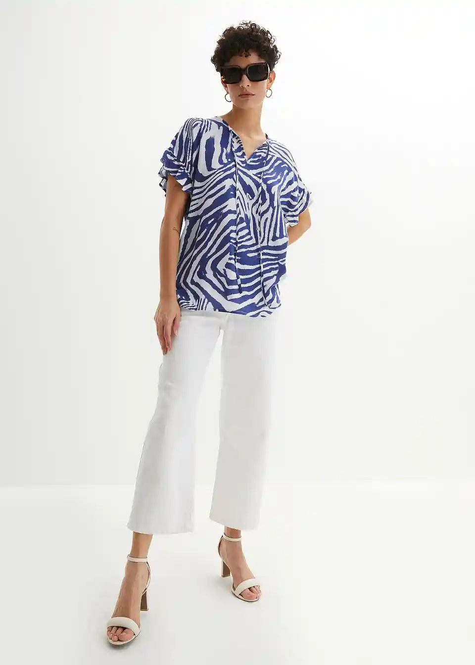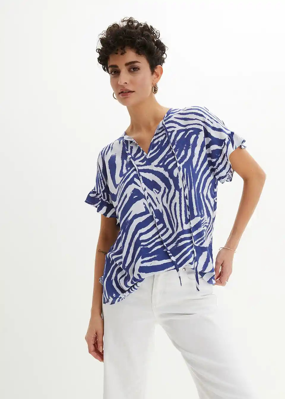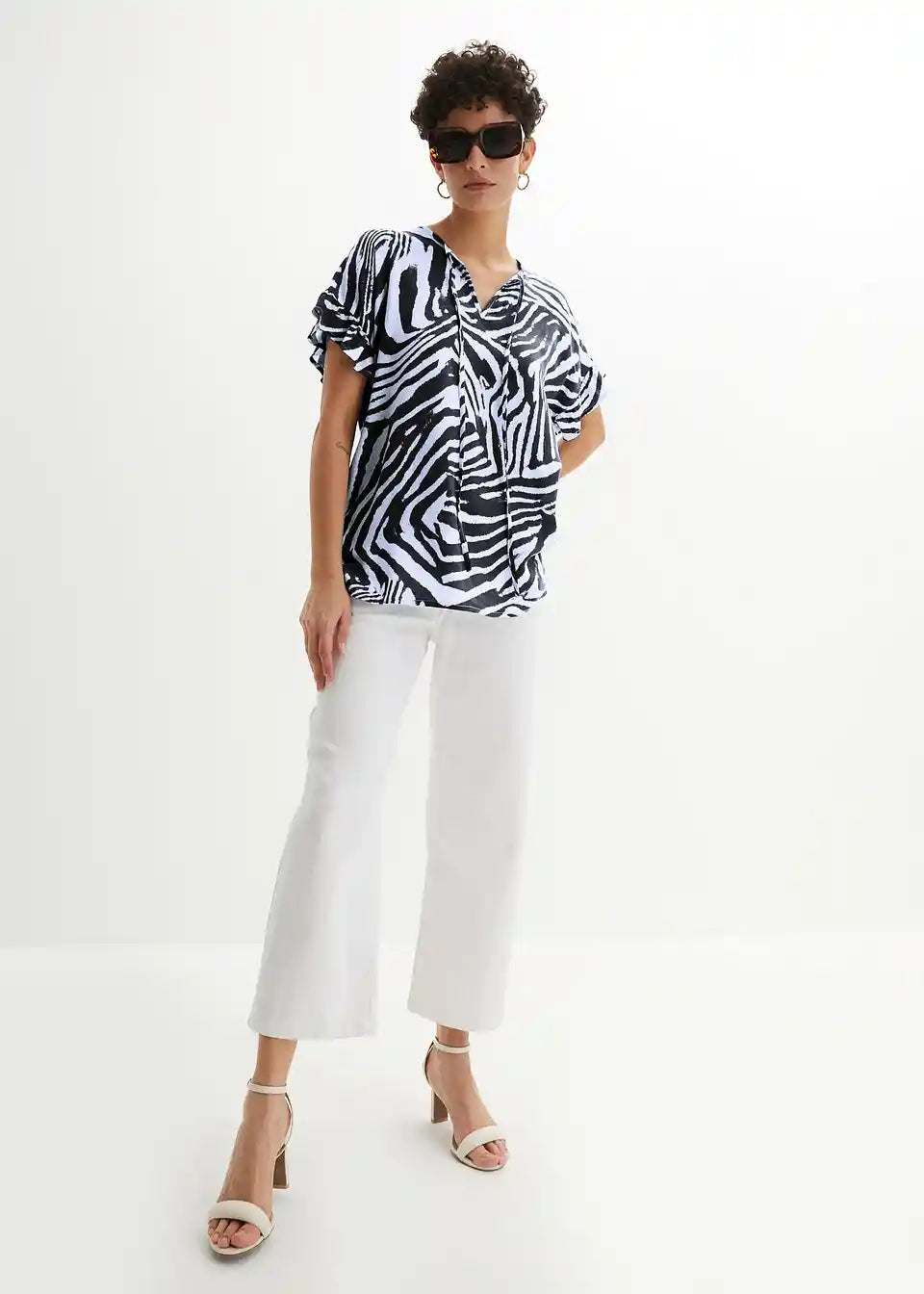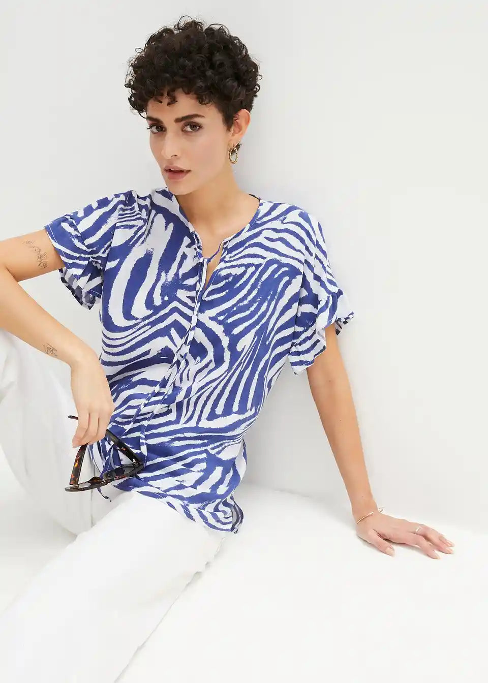 Lijepa široka tunika-bluza s uzorkom i vezicama na izrezu.